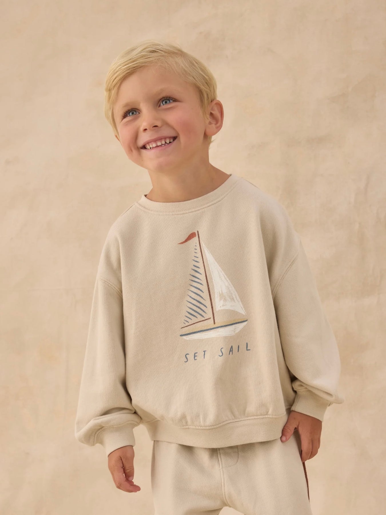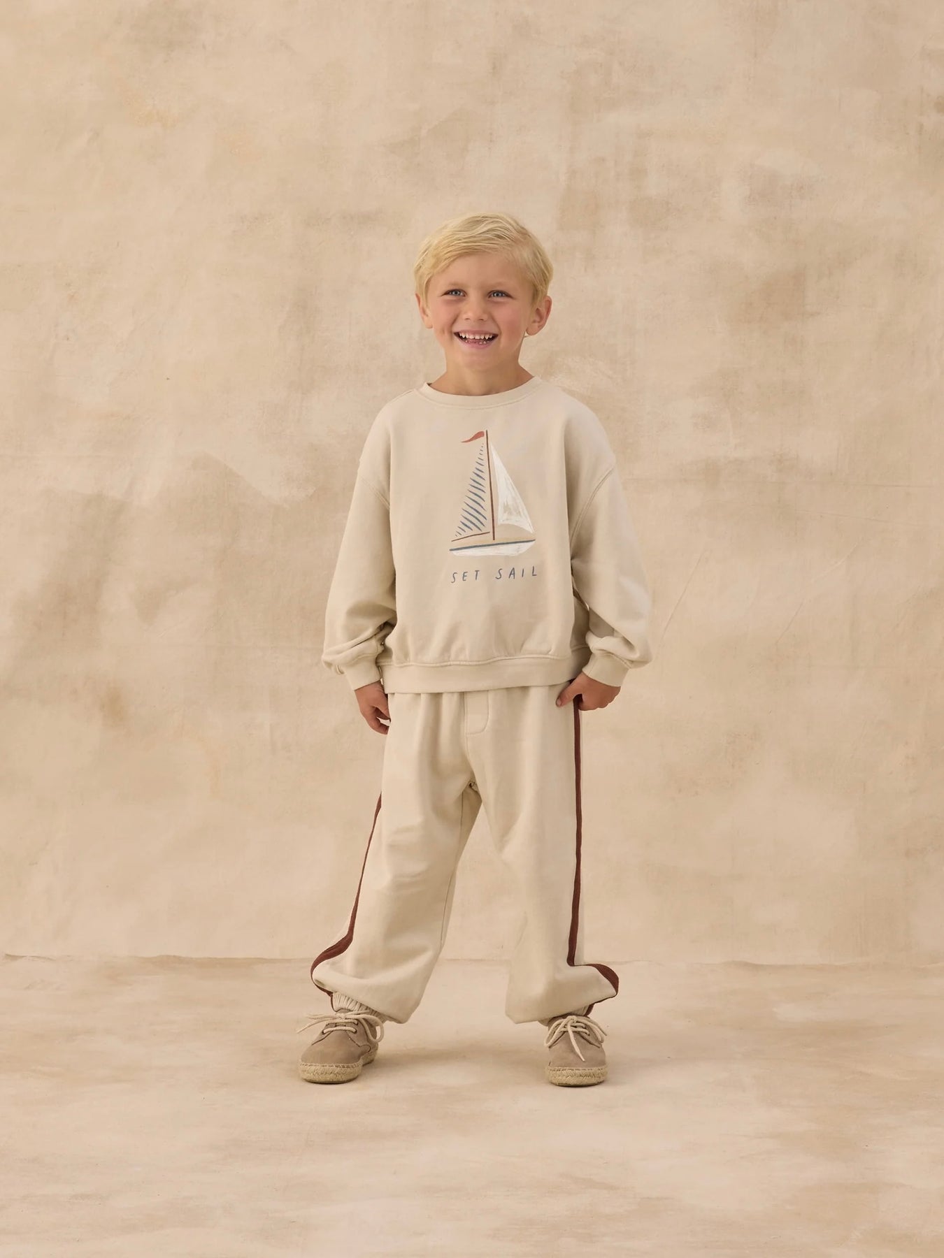 Featuring our 'set sail' spot print on our 'pebble' hue. Find joy in simply living in this cozy look.