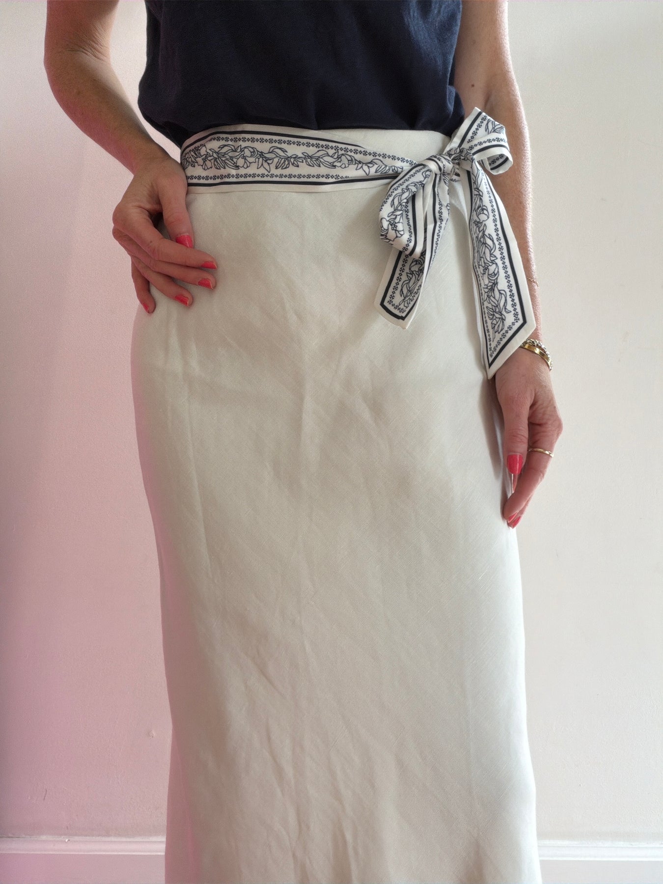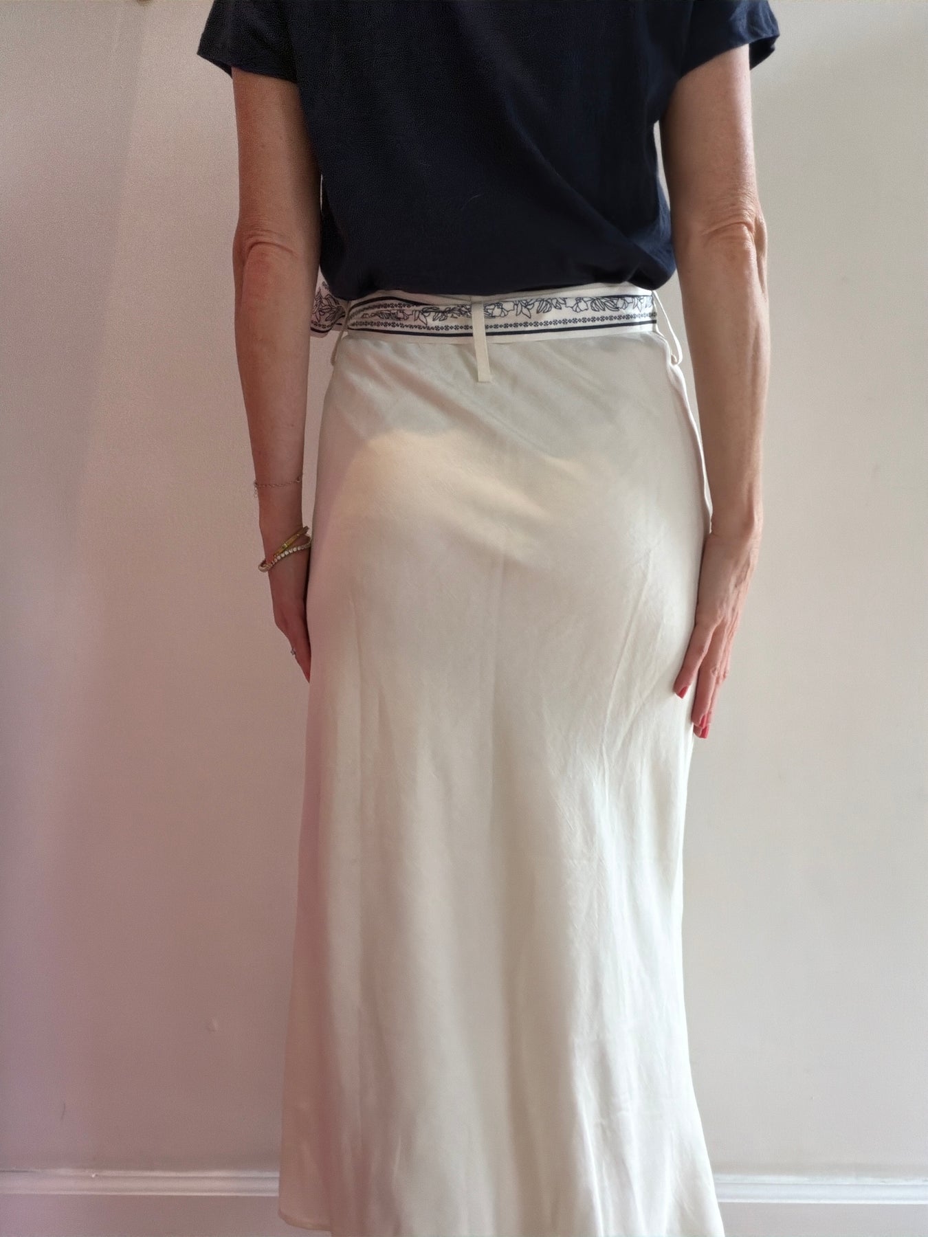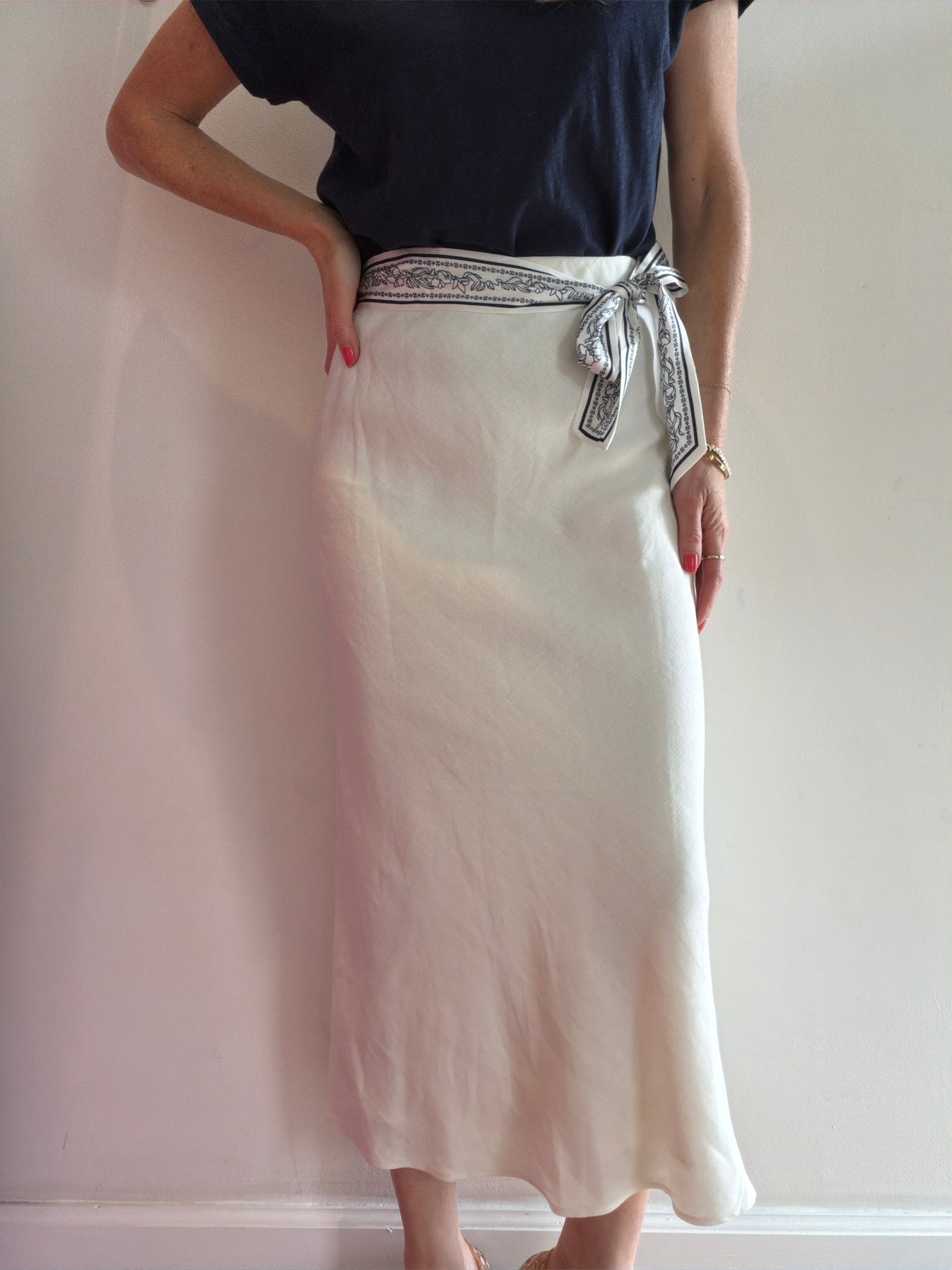 Chic midi in cream with a silky scarf tie belt. Composition is cotton/poly with a rayon slip.