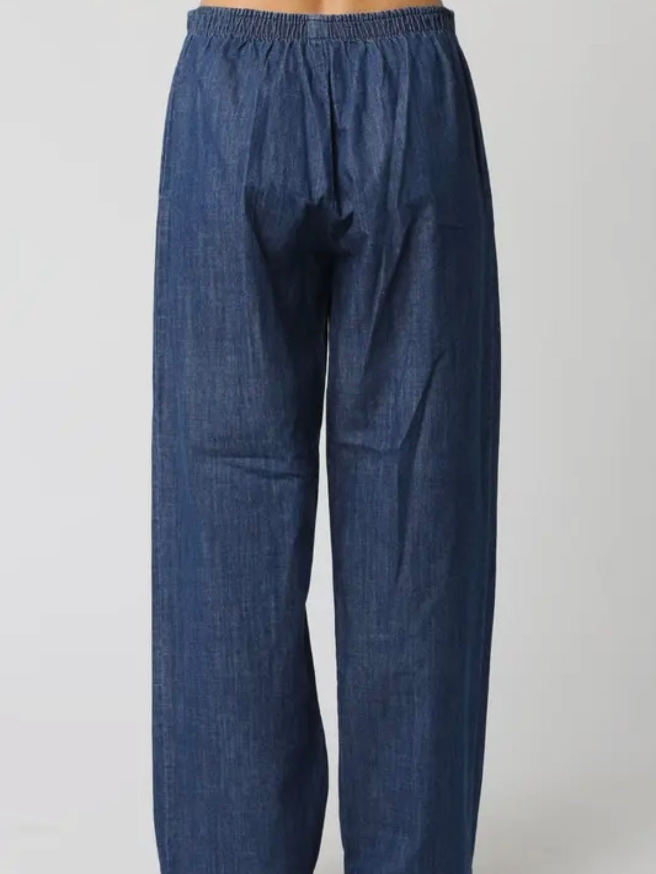 These pants feature an elastic waistband, relaxed fit and wide leg.