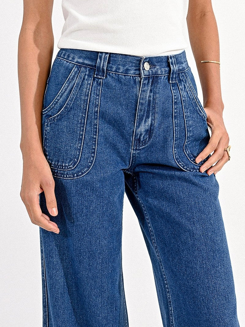 These denim jeans feature a wide leg, pocketless bottom, and unique pocket details.