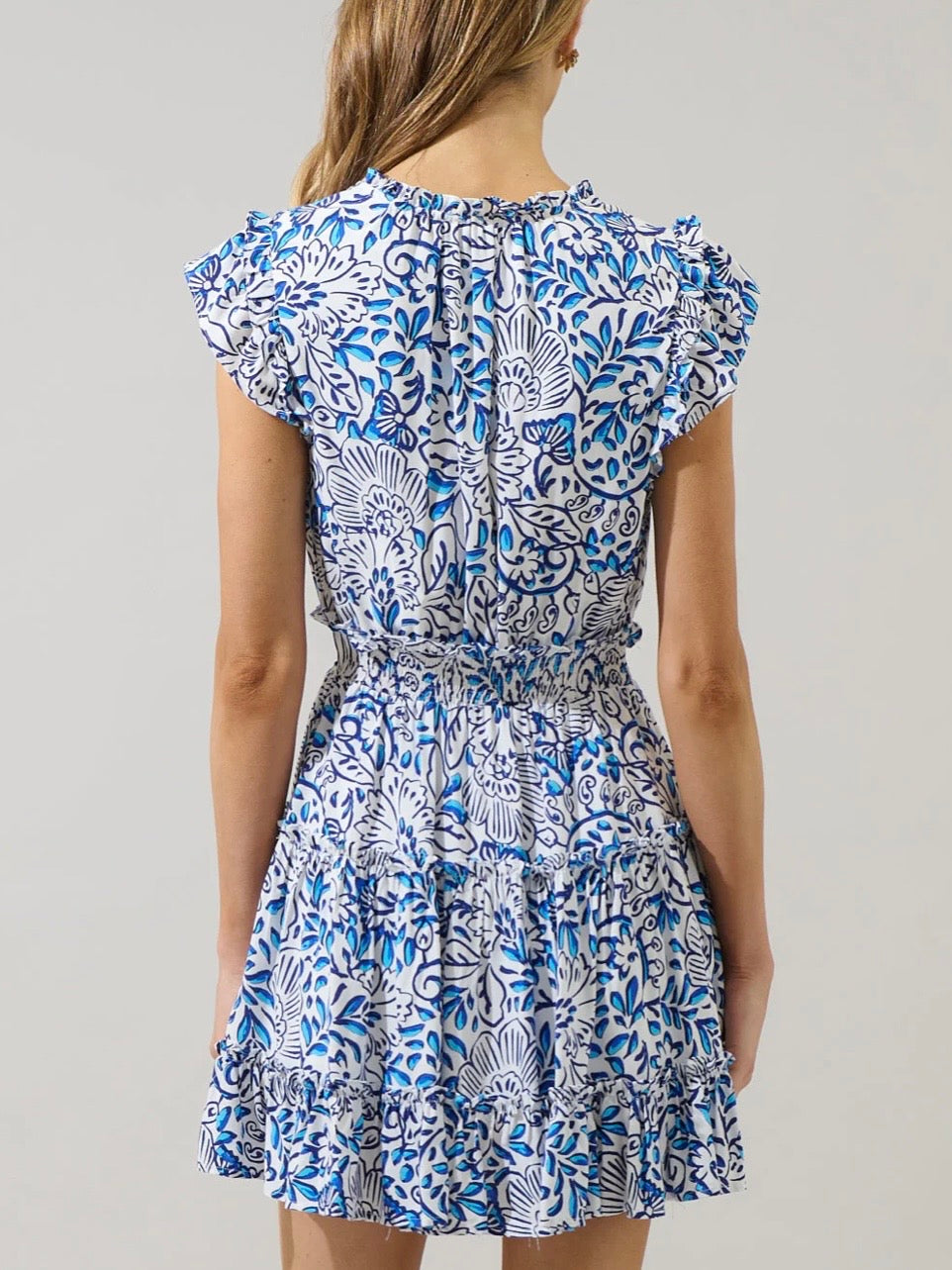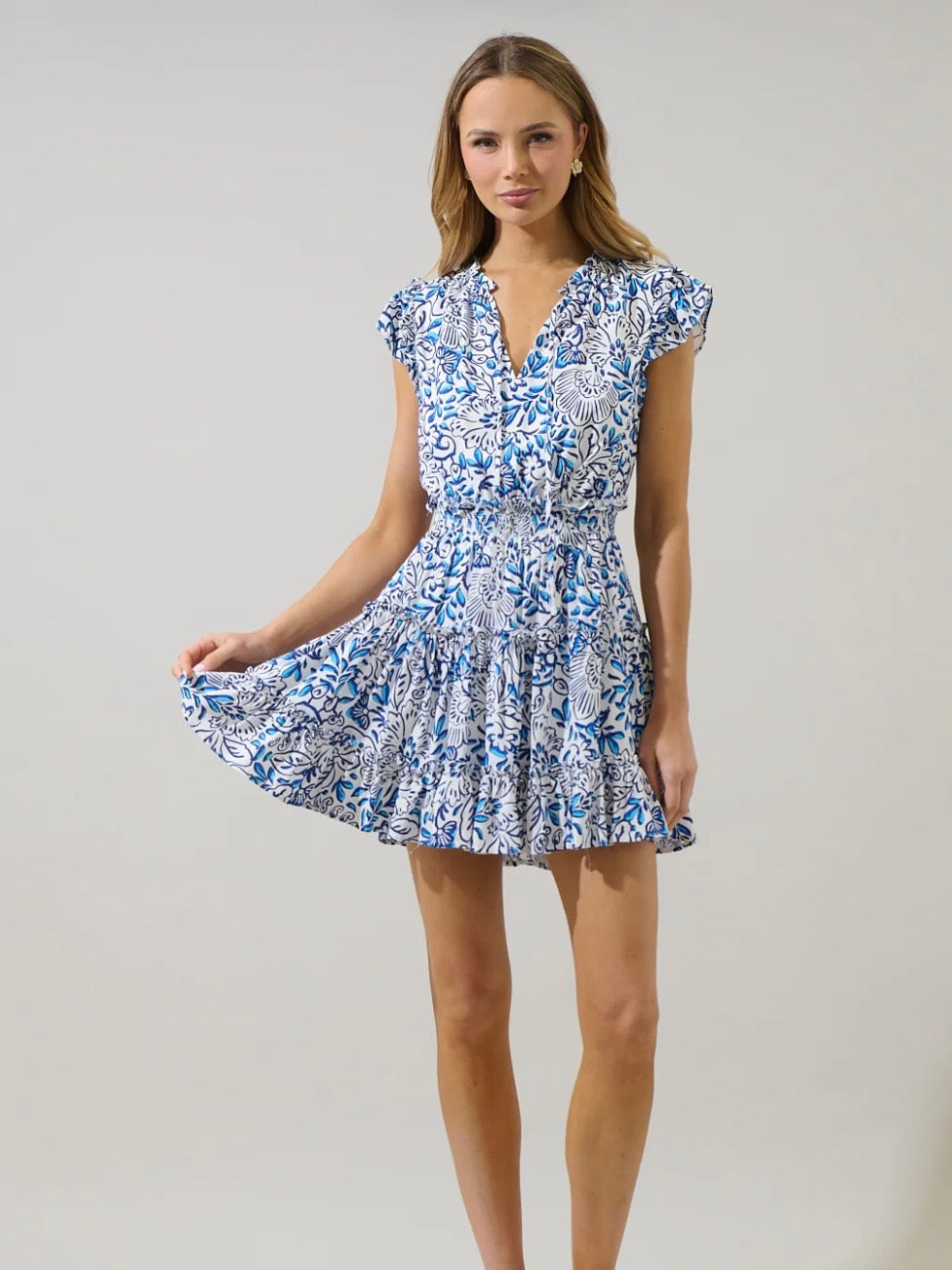 Sashay into brunch in the Mize mini dress. Flutter sleeves, gathered waist, and a tiered miniskirt that is lined. Composition is rayon.