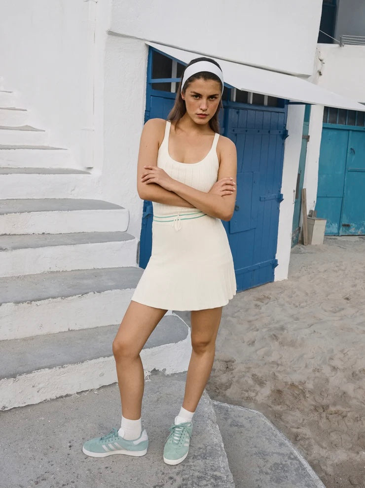 This tank dress is ready to win with an interior bike short and built-in shelf bra. Finished with cable knit trim, it updates a classic tennis dress designed to be worn on and off the court.