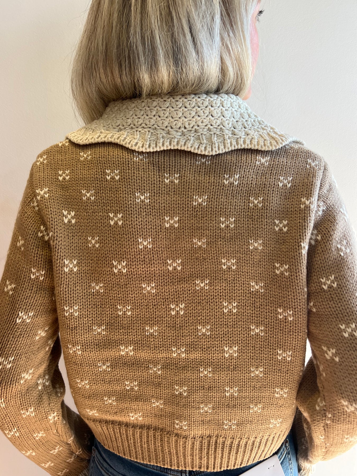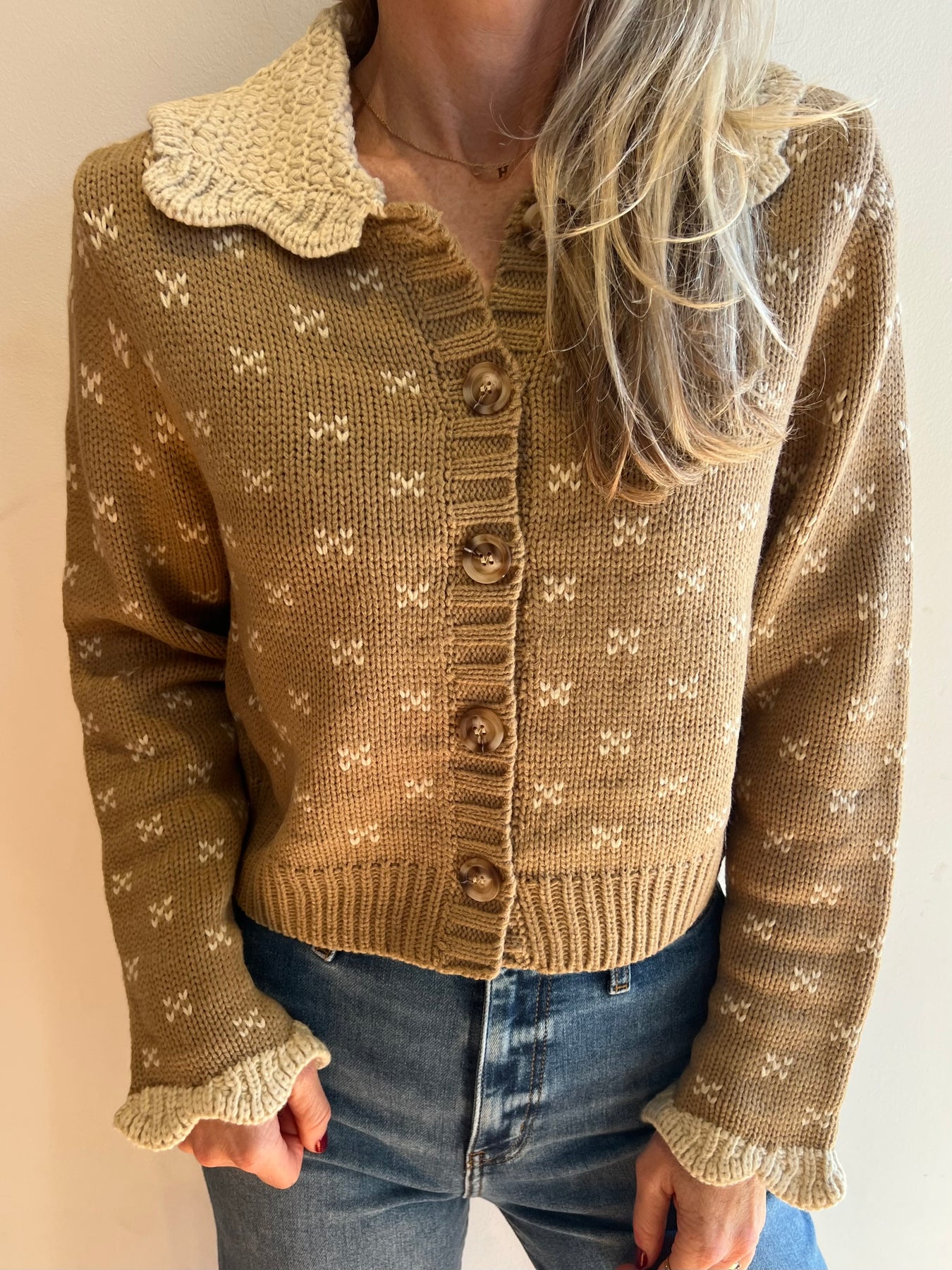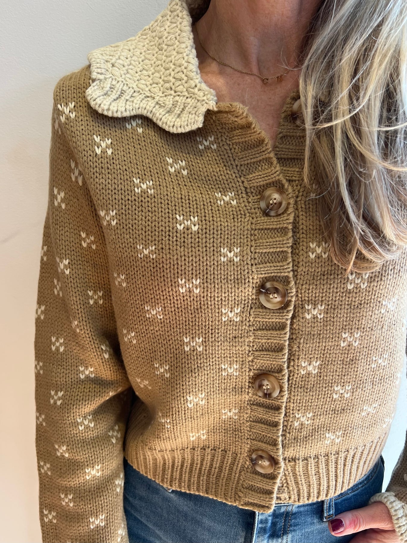 The most beautiful crochet cardigan! This sweater features a Peter Pan collar.Please note this sweater runs small and we recommend sizing up Model is wearing a medium