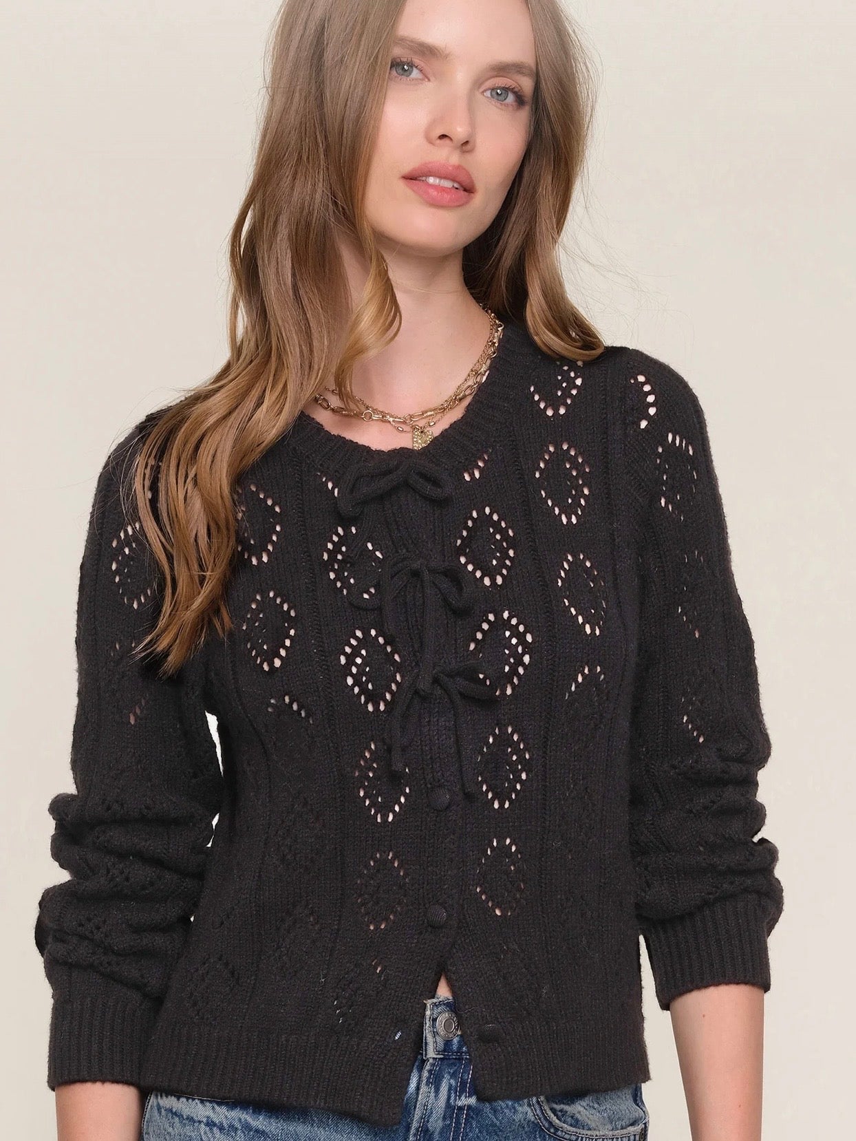 The Joelle Sweater is a feminine, slim fit cardigan. It features a pretty, pointelle stitch throughout and self ties at the front.