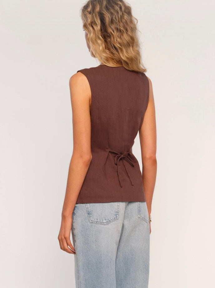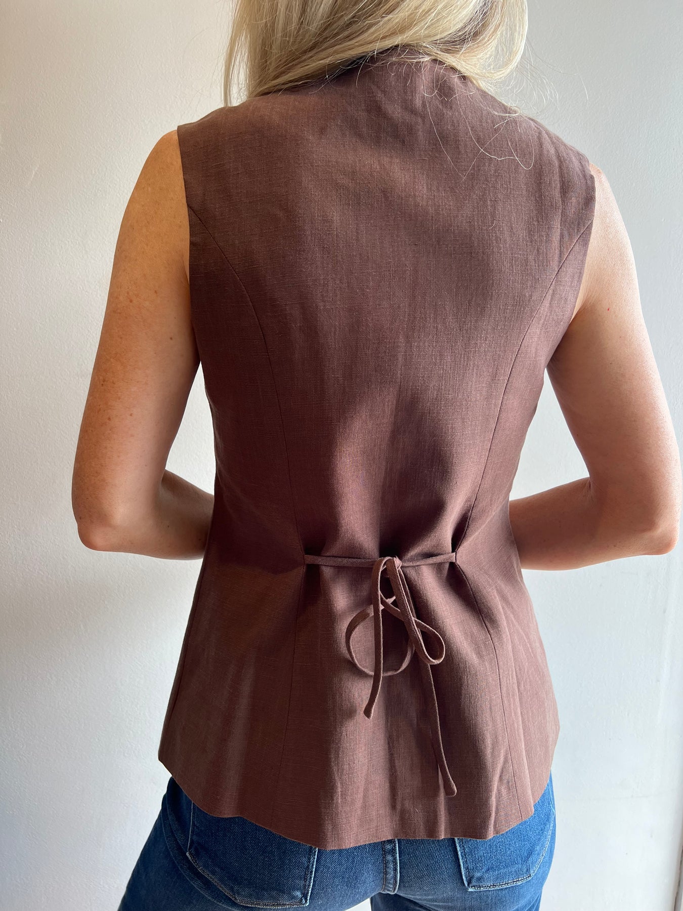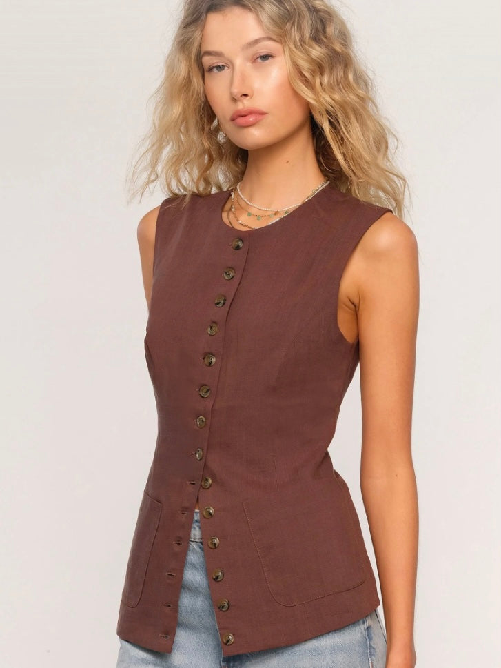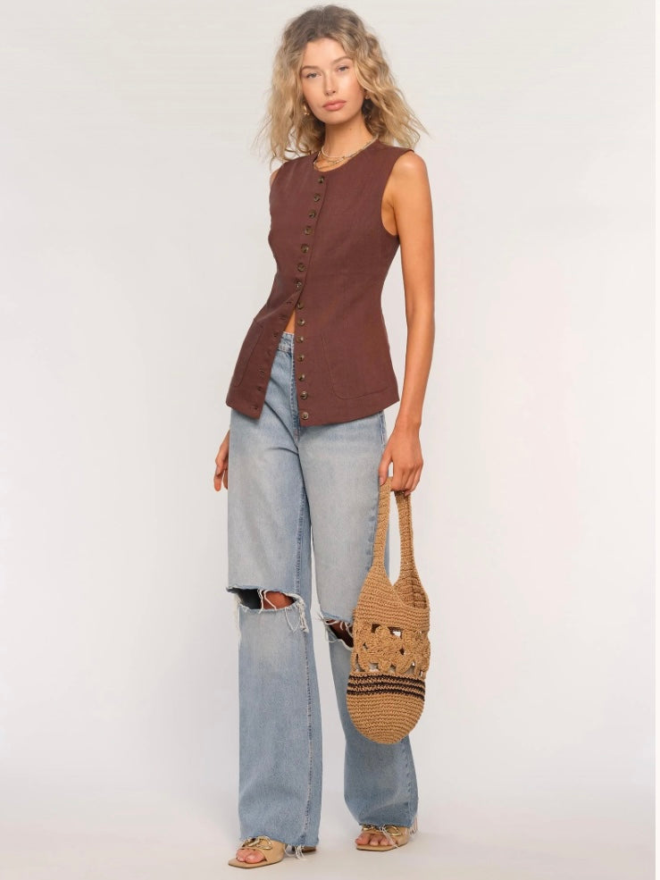 The Josette Vest is a flattering, long-line vest that's cinched in the waist. It has a crew neck and faux horn buttons down the front. We love to pair it with straight leg jeans for a relaxed, casual look.