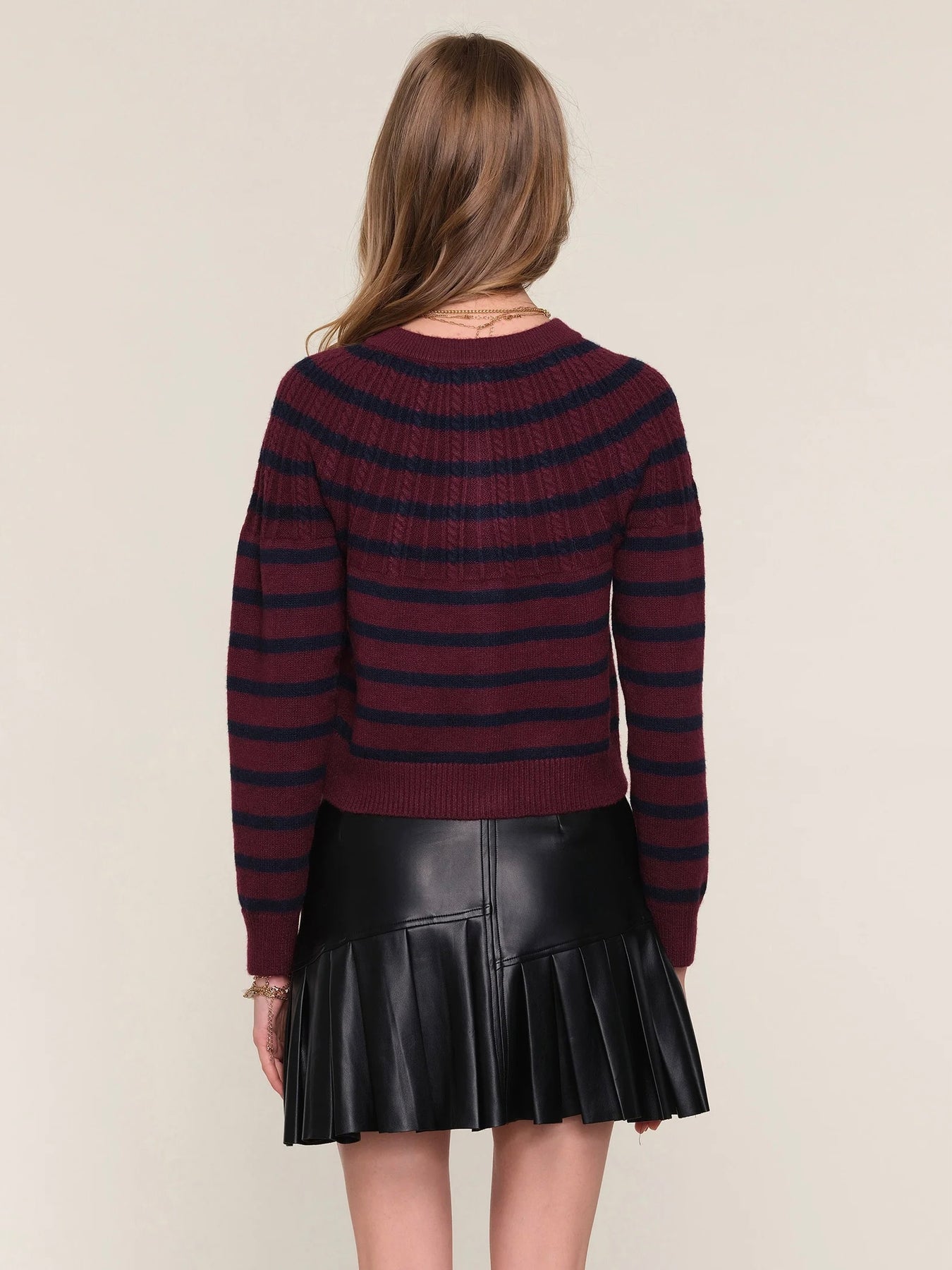 The Selene Cardigan is a crew neck, relaxed fit knit. It features a stripe layout with a cable stitch detail around neck. It also has cute, novelty buttons.