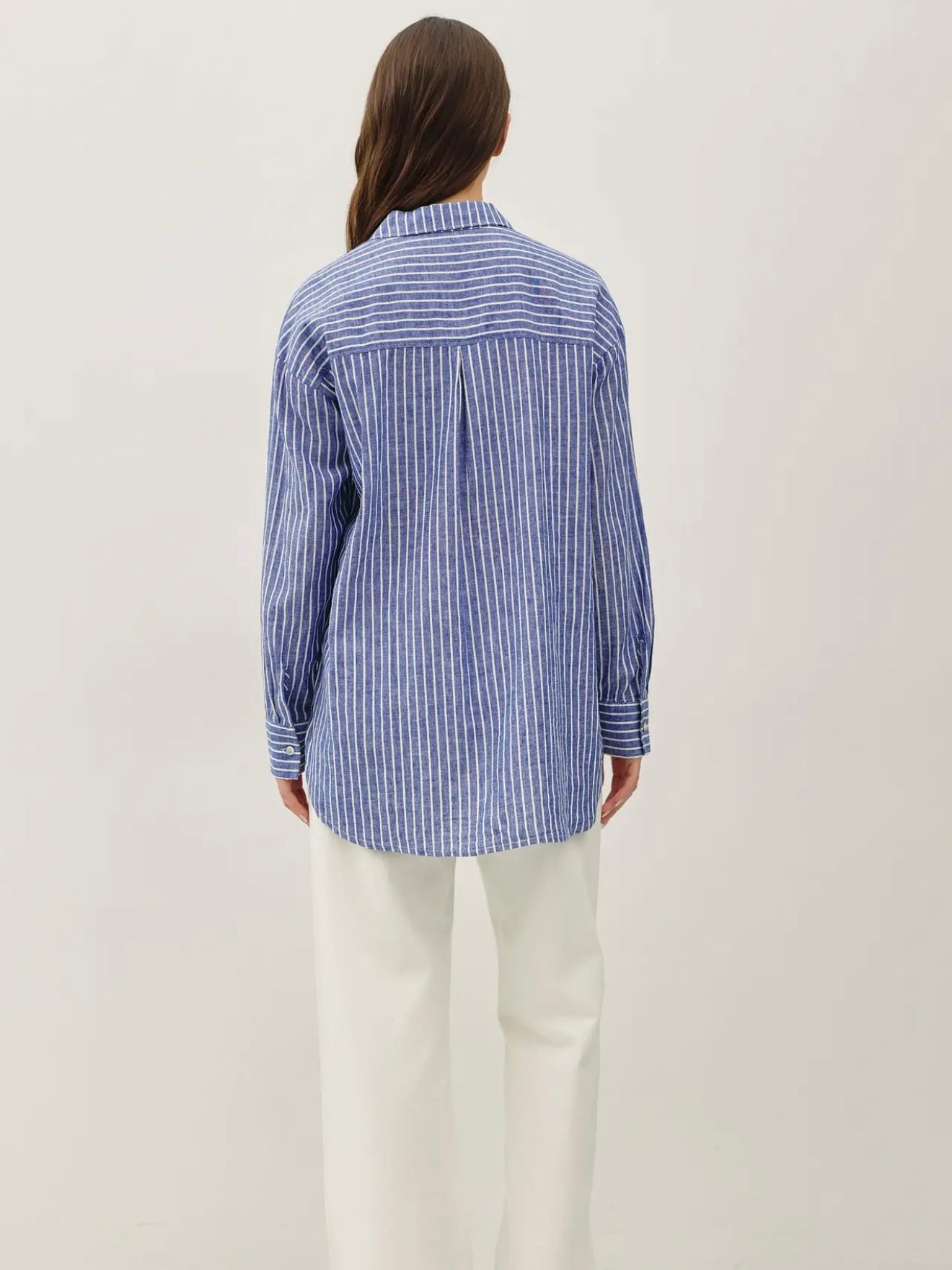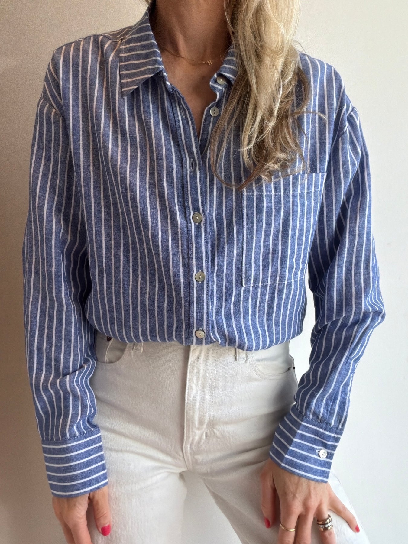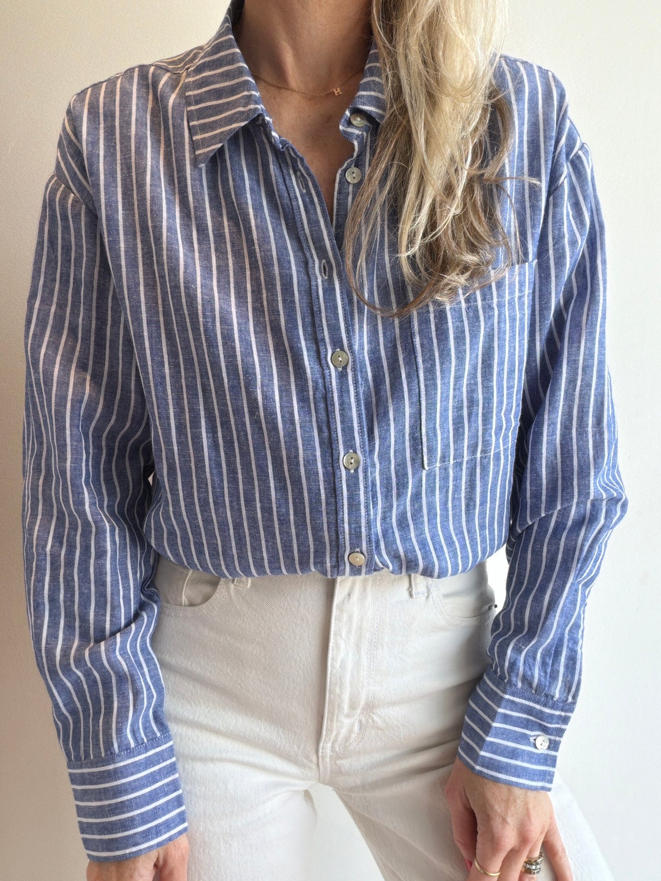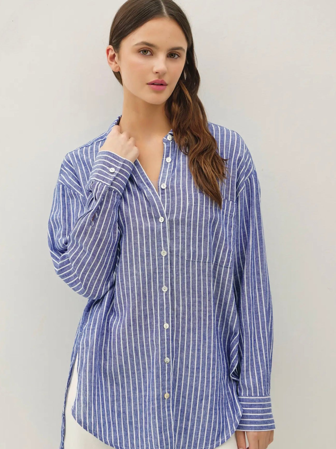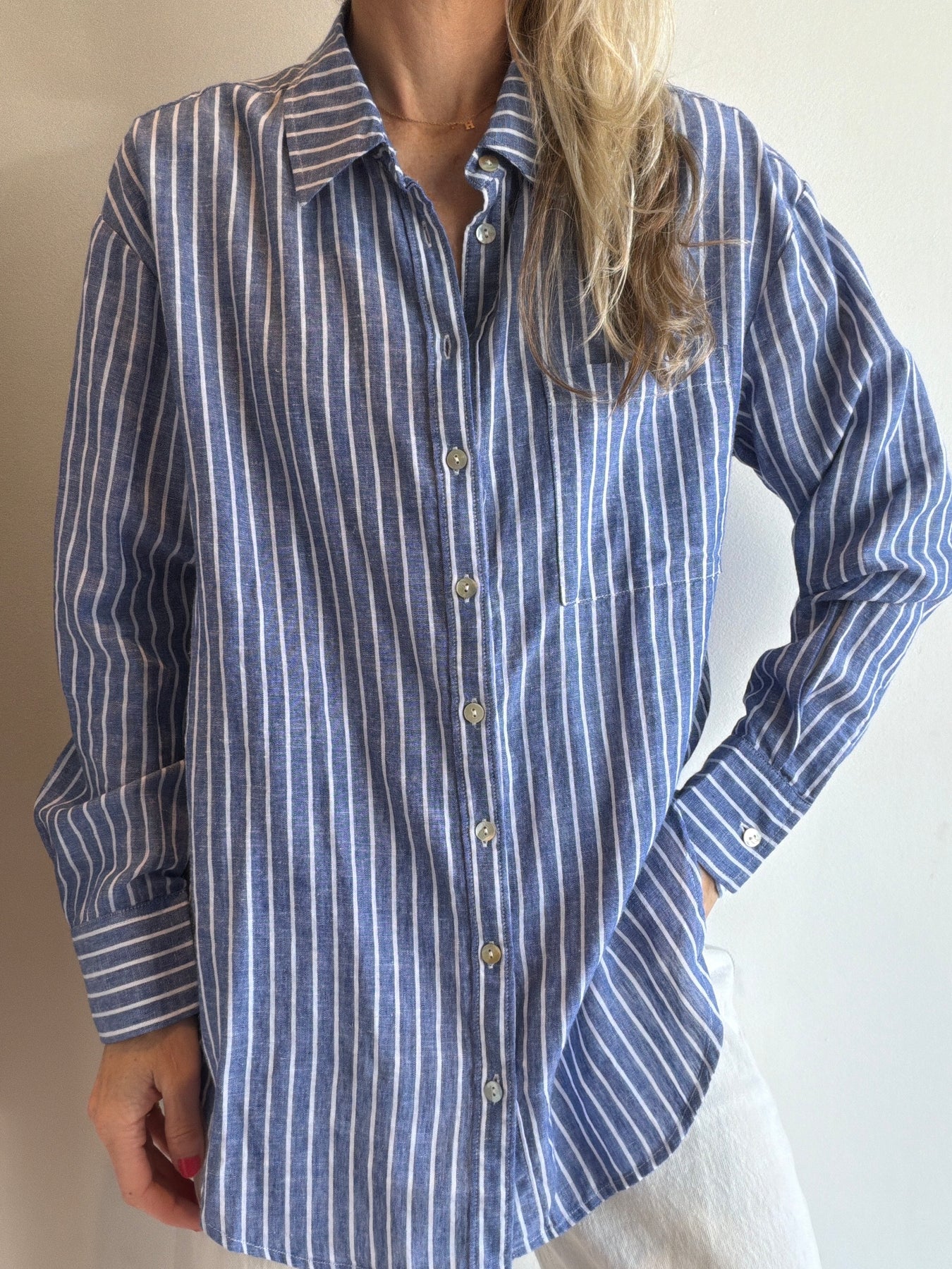 Elevate your everyday wardrobe with the Striped Long Sleeve Collared Button-Up Shirt.Featuring a timeless striped pattern, this shirt is designed for both versatility and style. The classic fit ensures all-day comfort, making it an ideal choice for work or casual outings. A front chest pocket adds functional detail while enhancing the overall design. The collared neckline and button-up front provide a polished look, while the long sleeves make it perfect for layering in cooler seasons or wearing on its own. Pair it with tailored pants or denim for a smart and effortless appearance. Composition is linen, cotton.