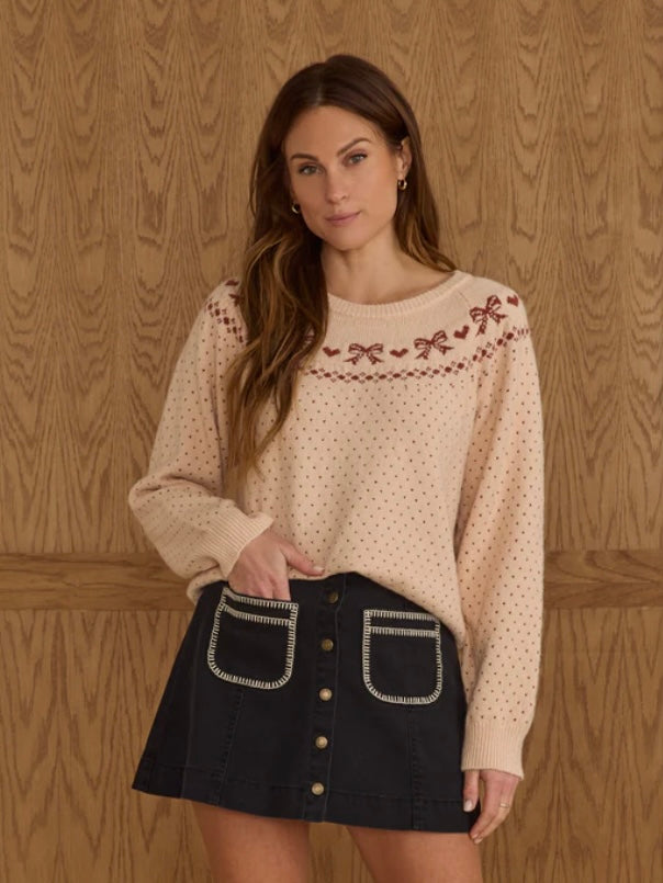 This Fair Isle Sweater is a cozy knit featuring a sweet bow motif and traditional fair isle patterning. Designed in a soft petal base with warm accents, it brings both comfort and charm to everyday wear.