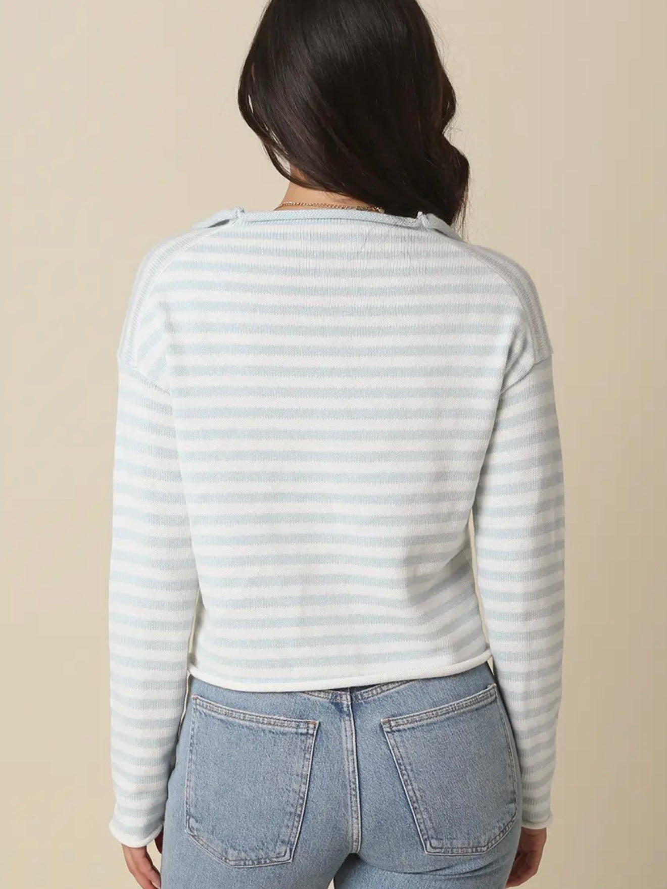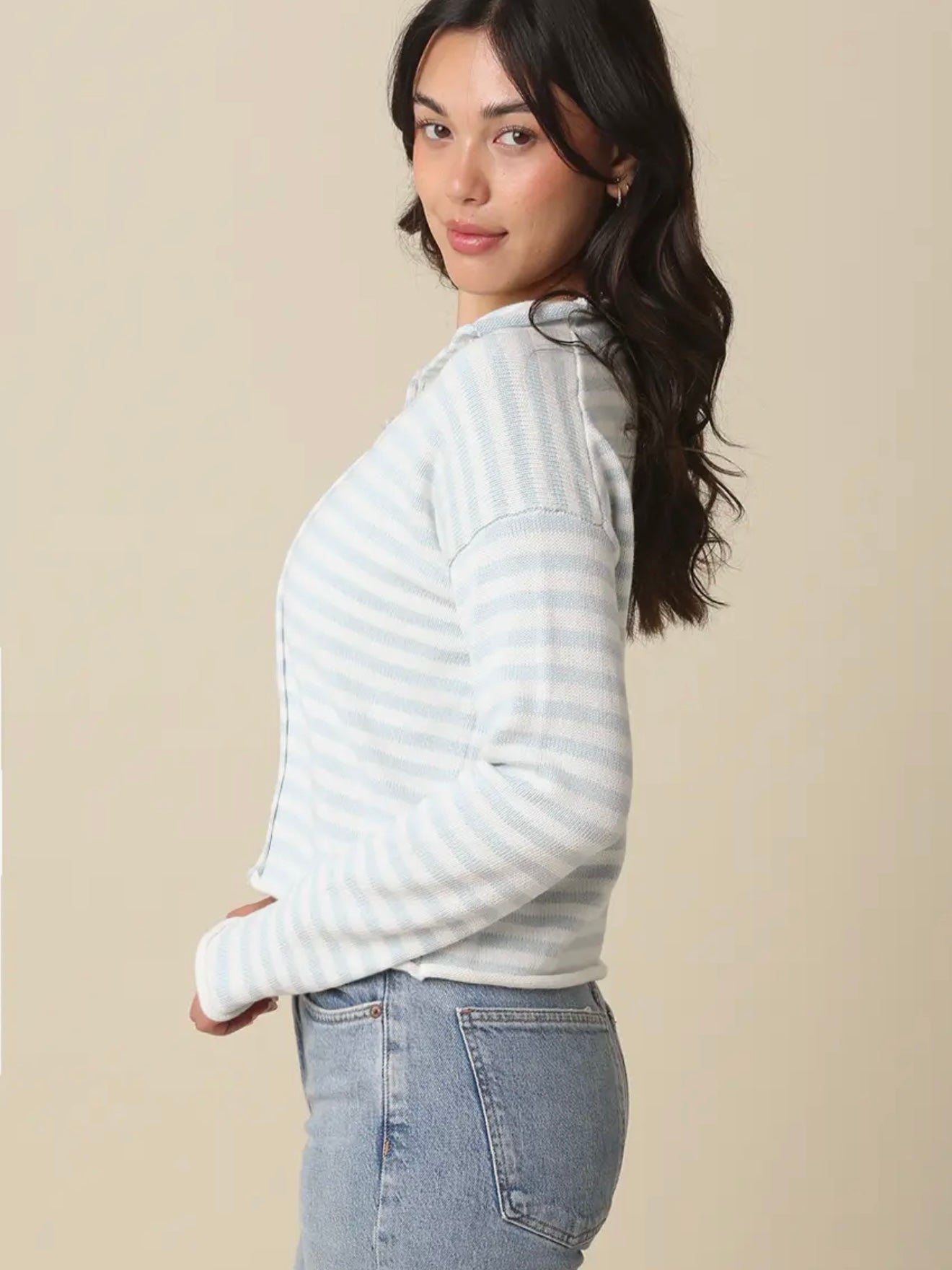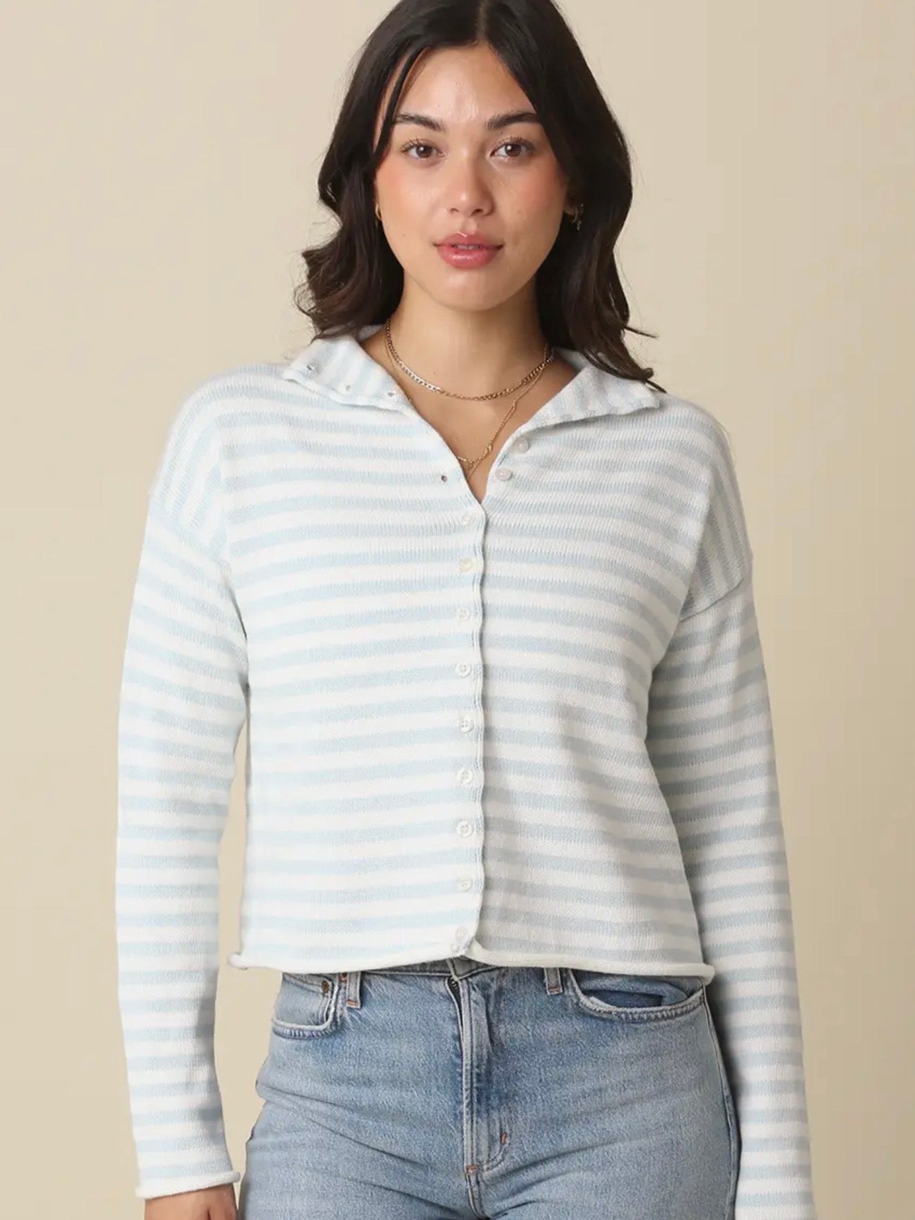 The Skyler cardi shines in a baby blue striped lightweight knit, rolled neck, and button front. True to size, straight silhouette that falls at the hip. Composition is cotton and cashmere.