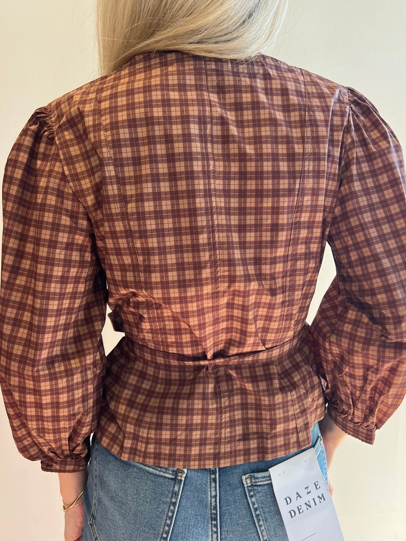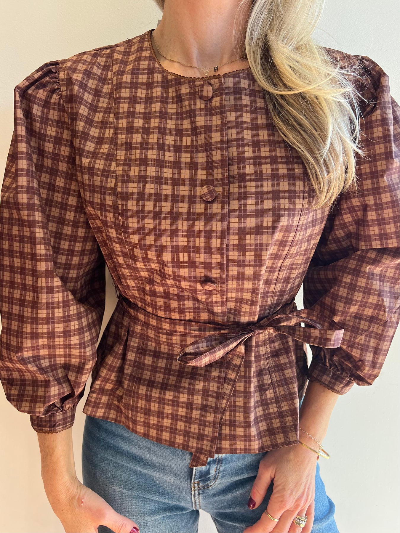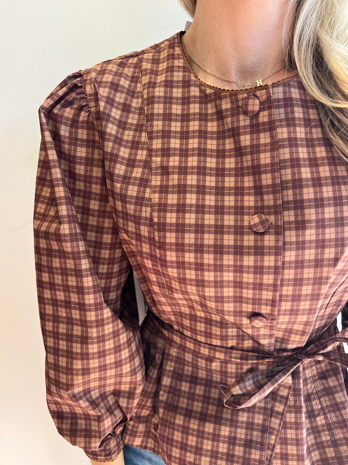 This beautiful blouse features buttons all the way down and a waist tie for a peplum style. Pair with your favorite denim jeans and a flat for a cute pre fall look!