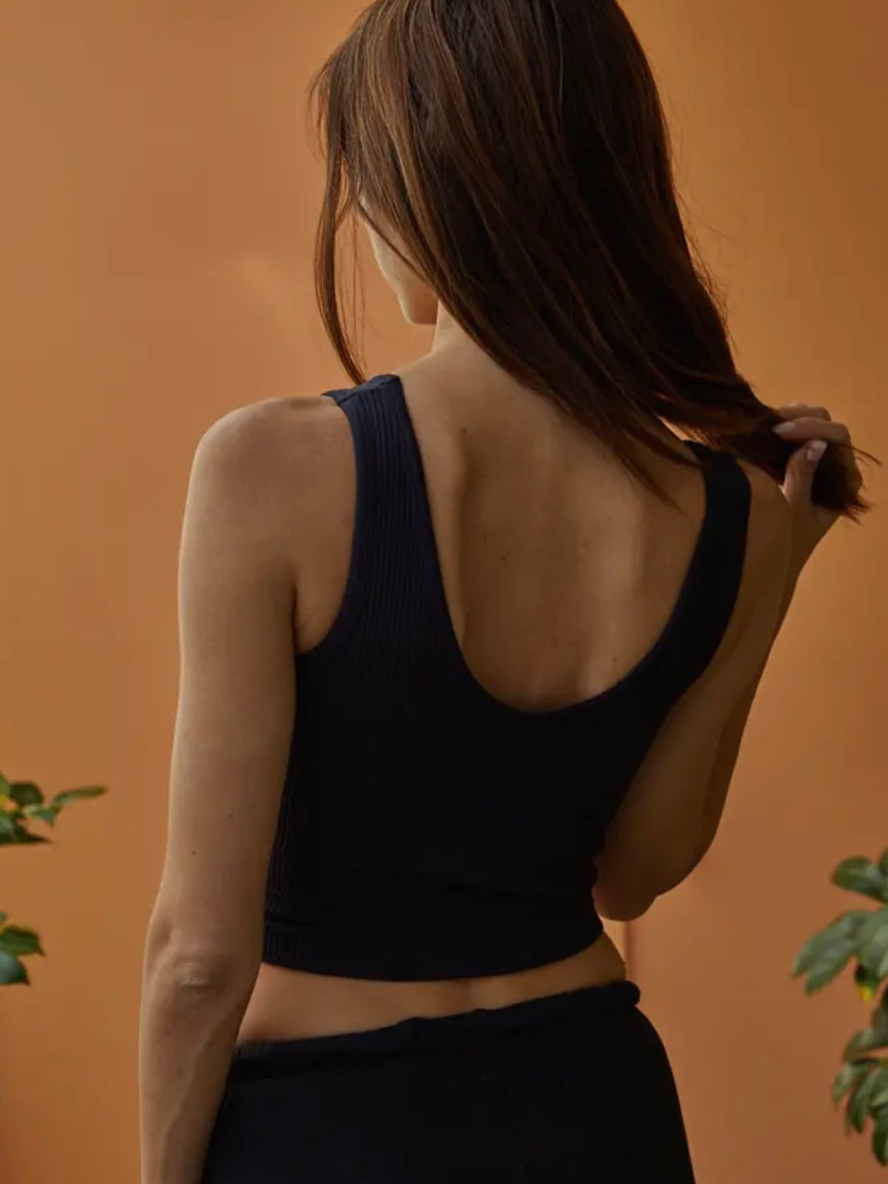 This seamless tank features a crop fit, seamless and ribbed fabrication and a reversible fit.