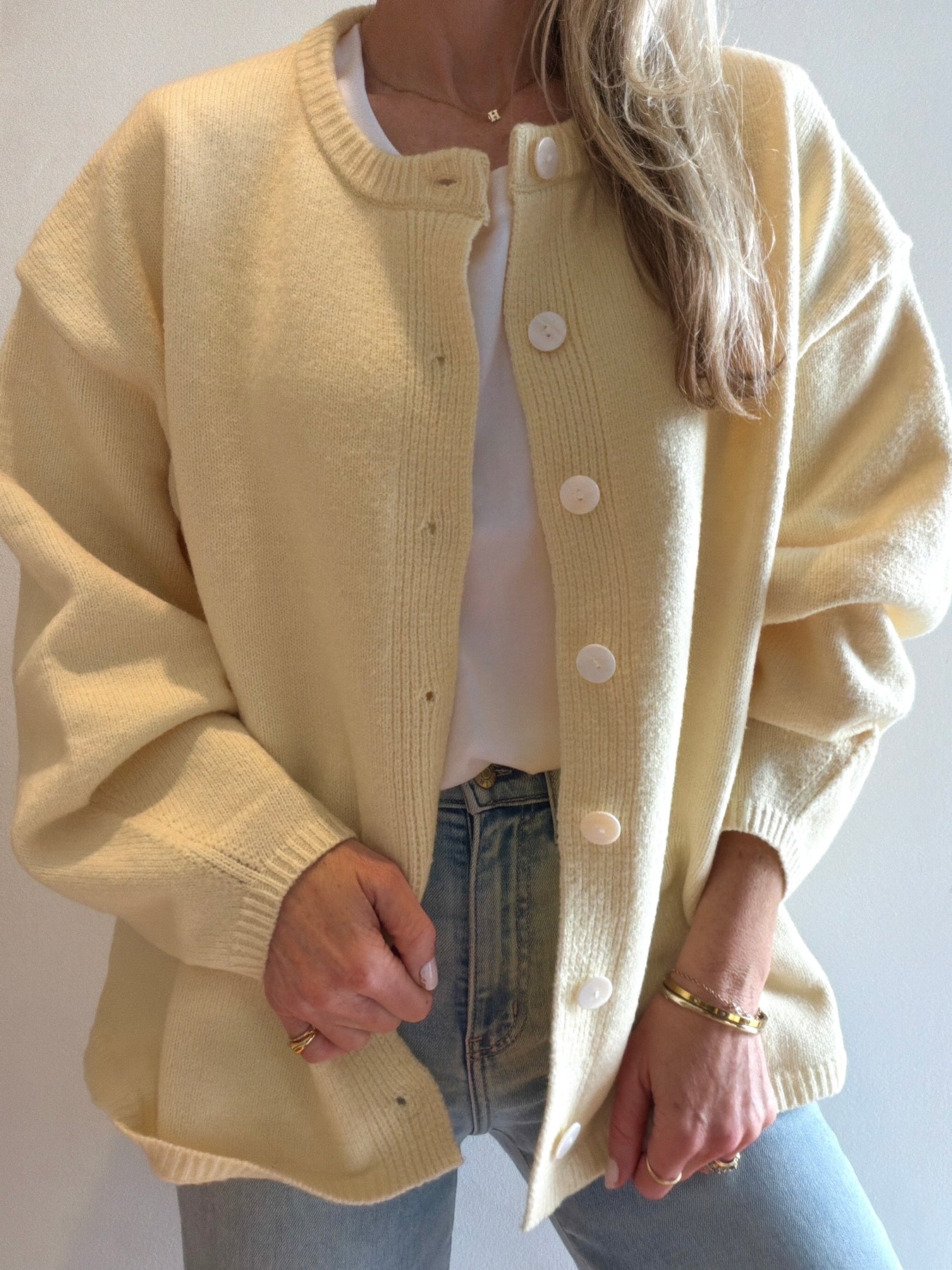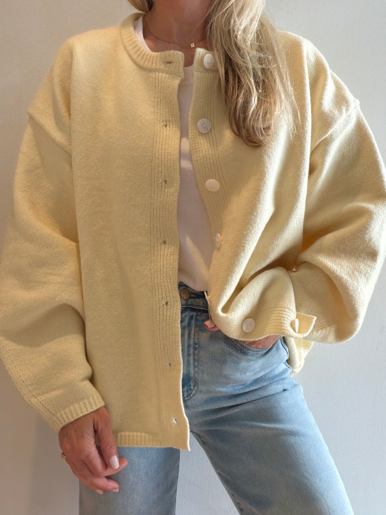 This sweater jacket features a relaxed, oversized style with contrast button details.