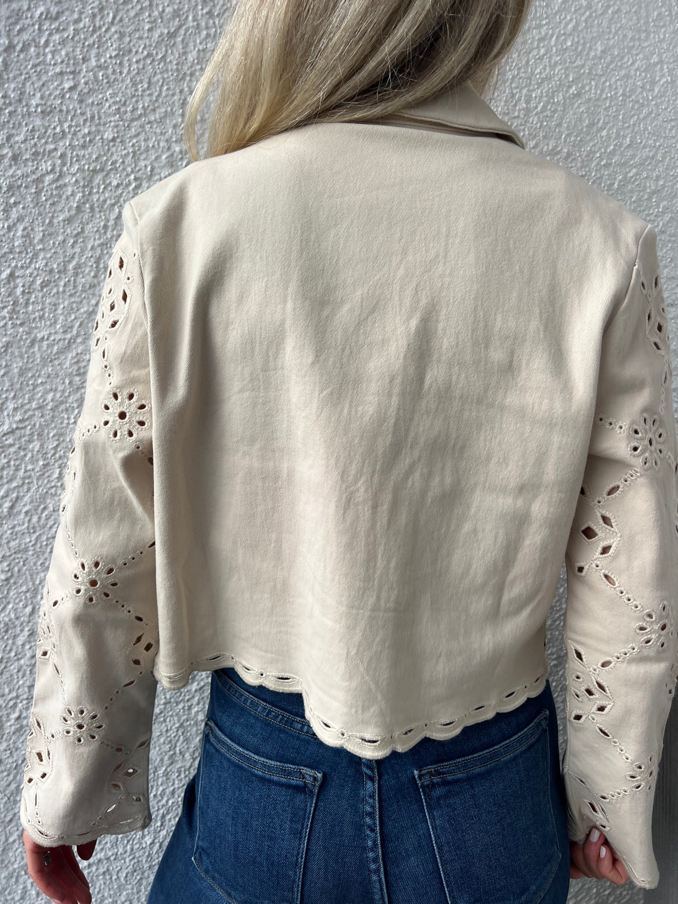 This jacket is a true statement! It features cut out eyelet detailing, scalloped edging and oversized brass buttons. Runs true to size