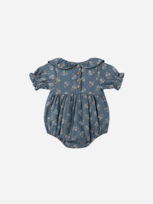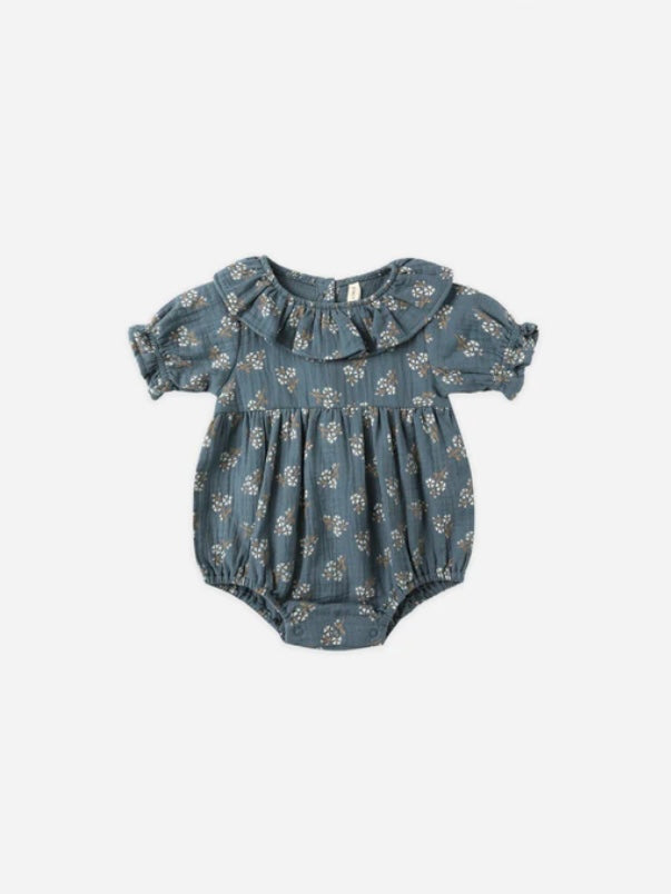 A sweet romper with a collar, short puff sleeves, and ruffle details, finished with back buttons and bottom snaps for easy changing.