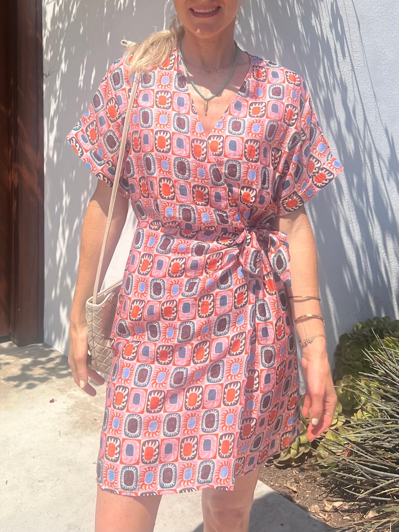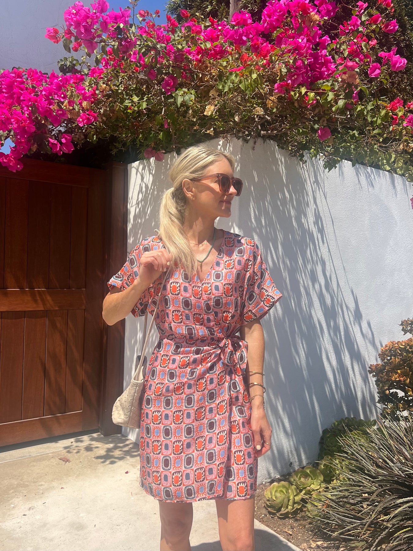 This dress boasts a playful wrap design that ties with a knot, crafted from lightweight printed linen and featuring a breezy FRNCH pattern. Short sleeves and a flattering V-neck add the perfect finishing touches.