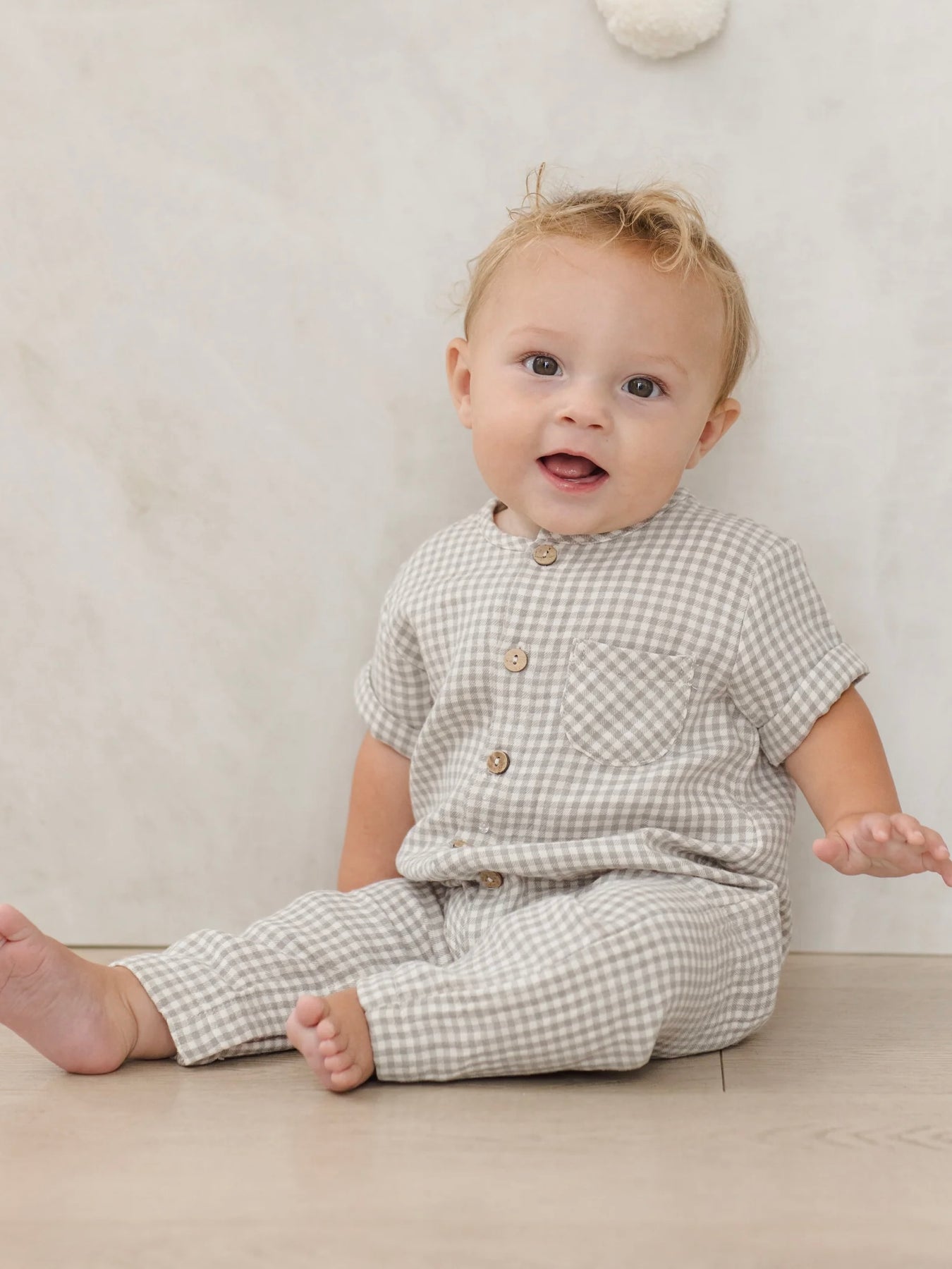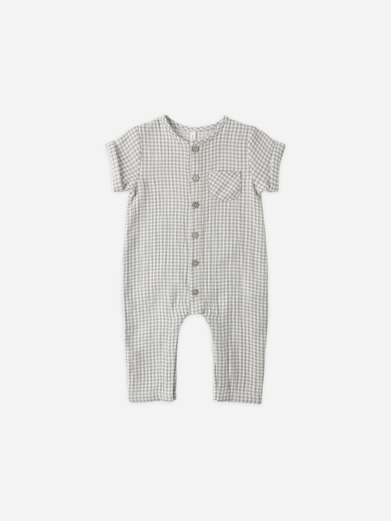 Short sleeve one-piece jumpsuit with front buttons and bottom snaps for an easy breezy fit.