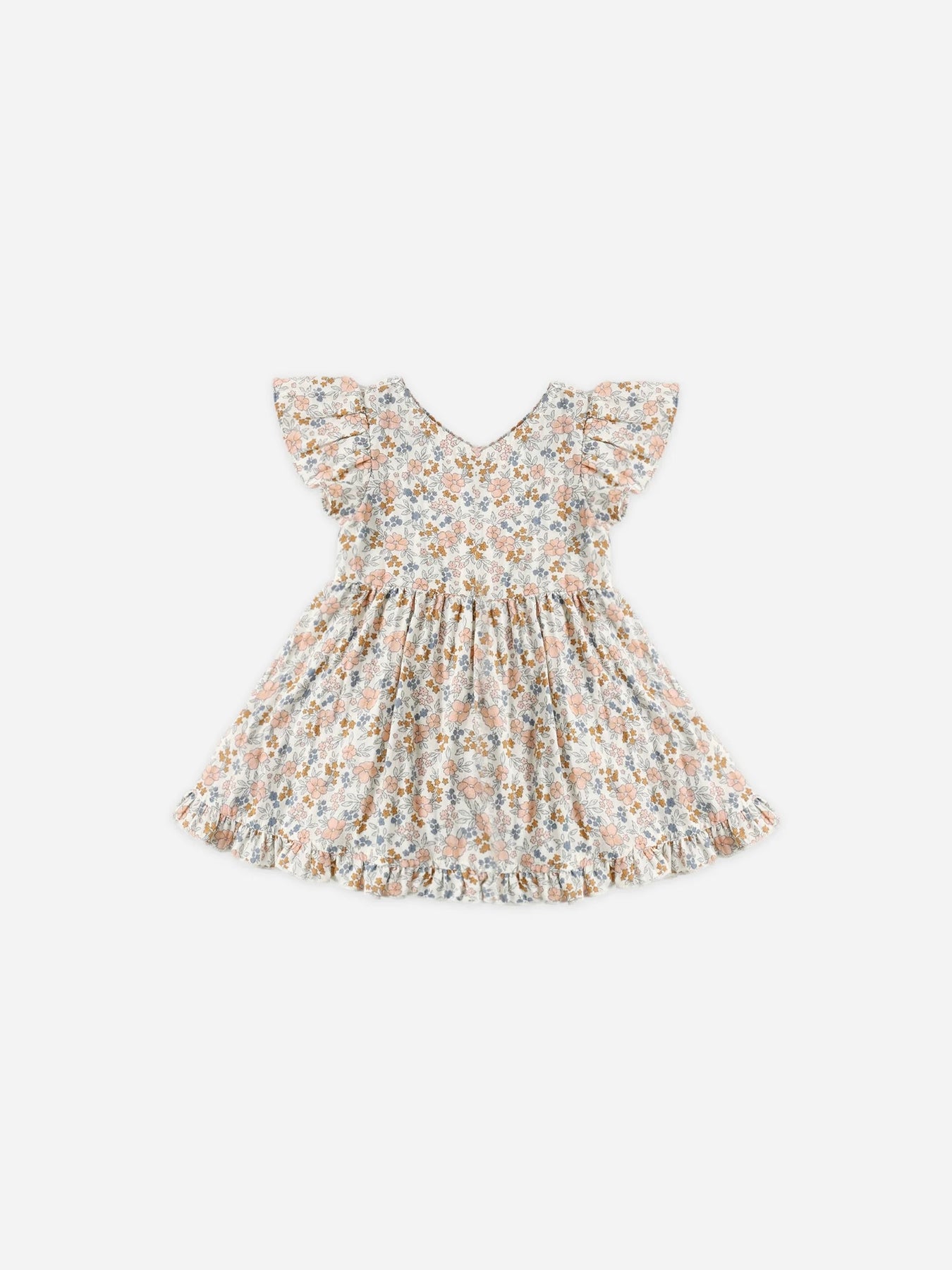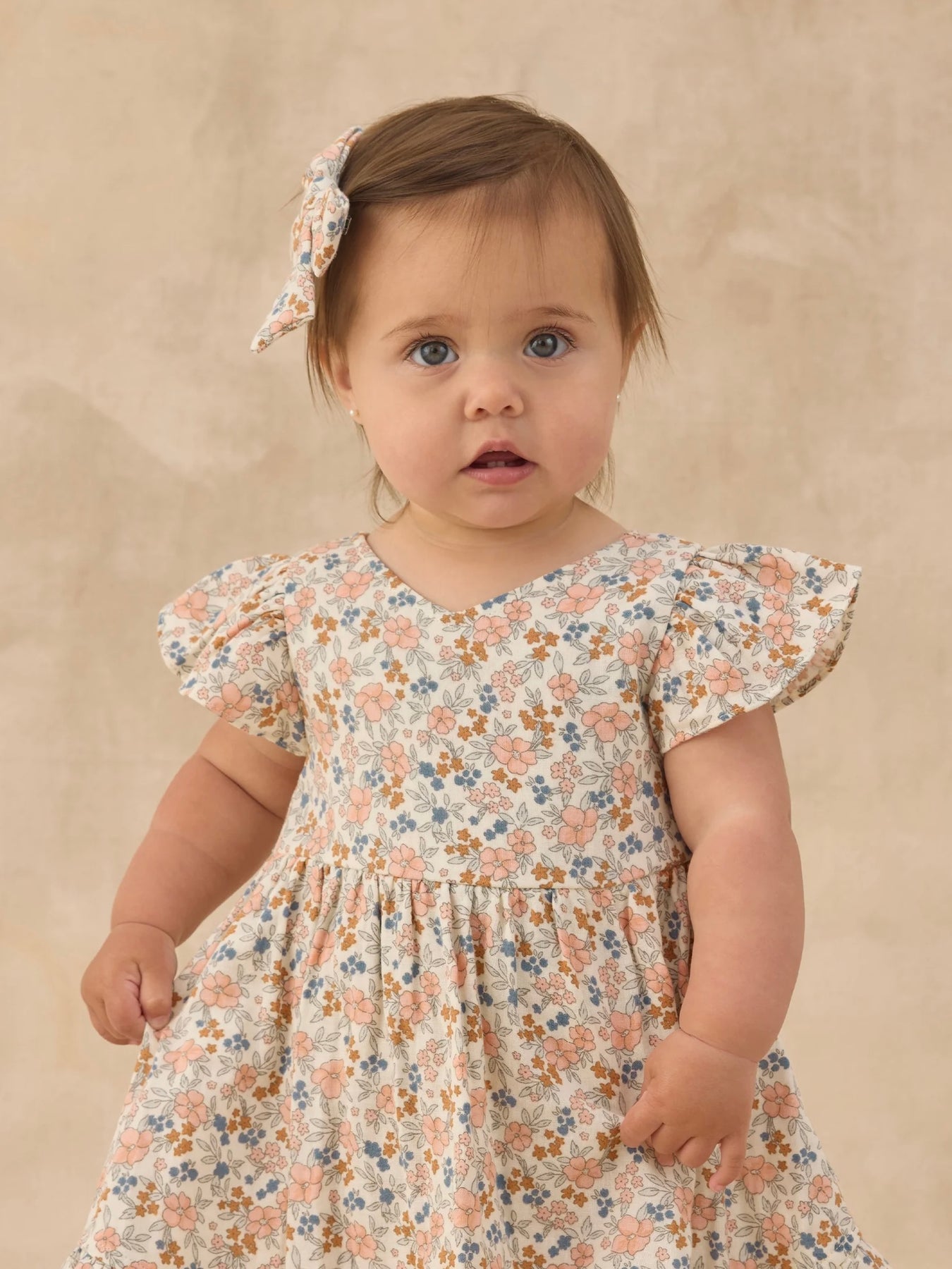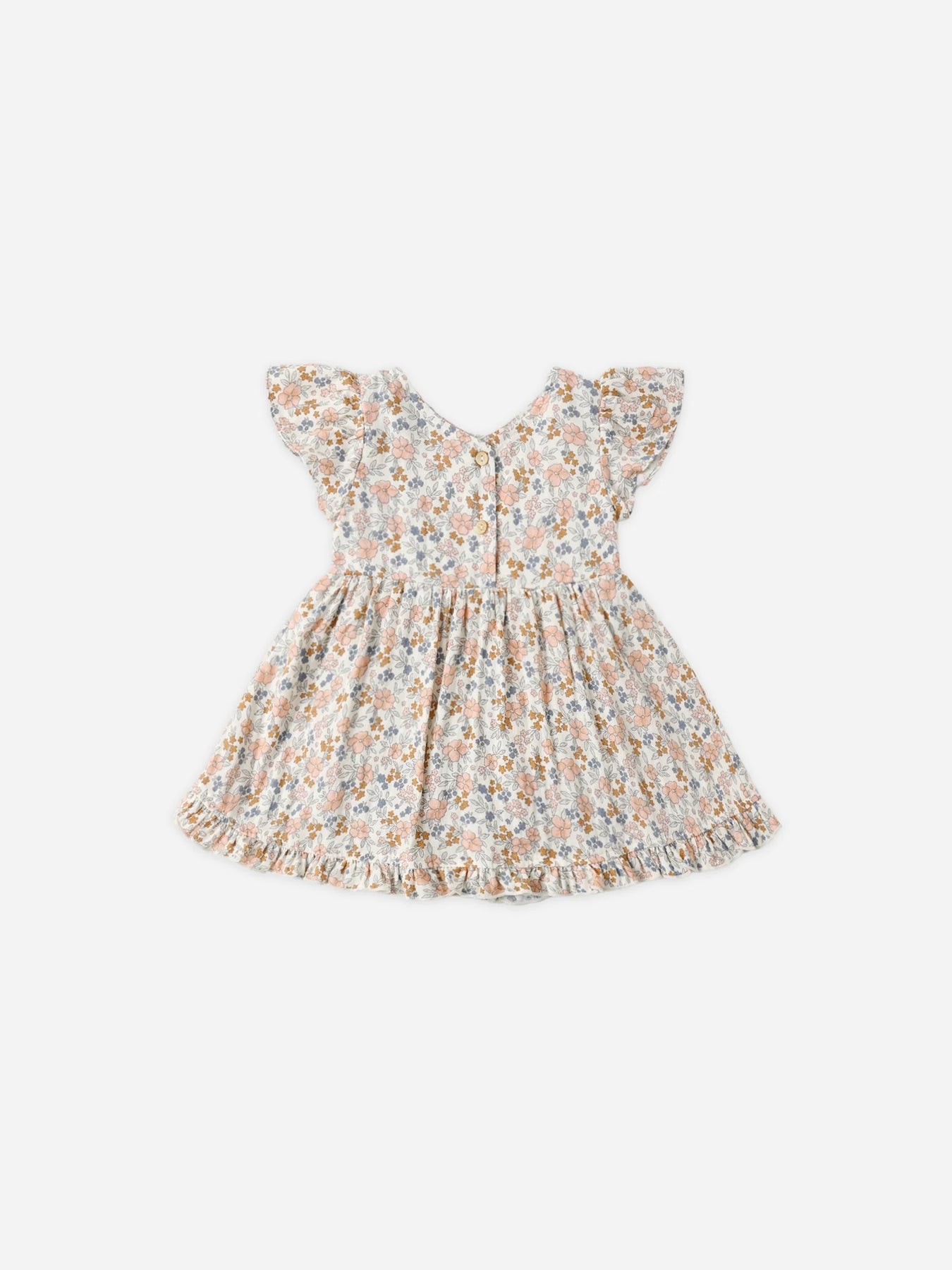 Our v-neck Lila Romper comes with a sweet gathered hem, ruffled sleeves, buttons at the back, and attached bloomers.