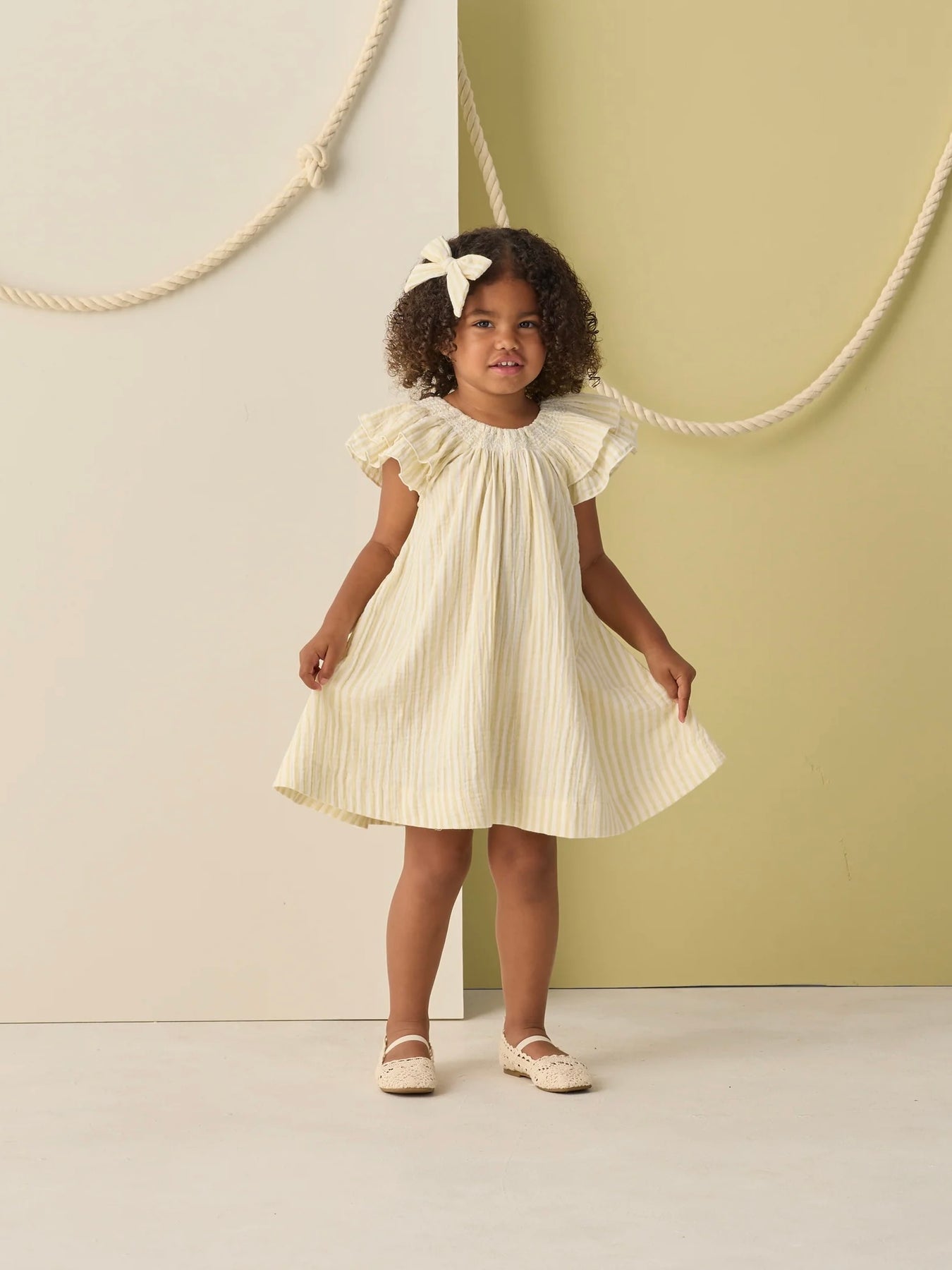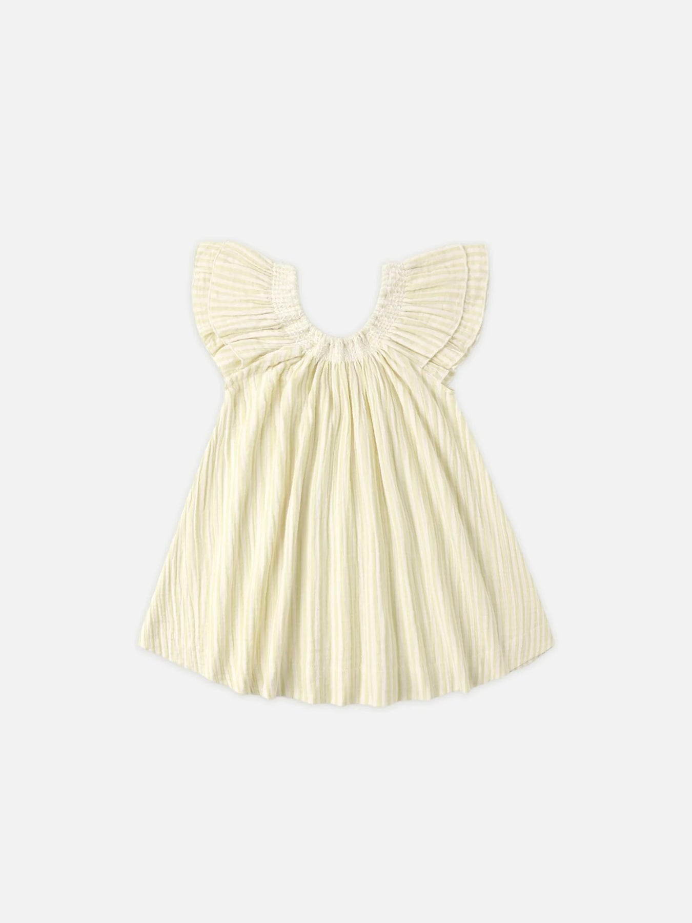 Our Lucia Dress features contrast elastic smocking at the neckline, and sweet flutter sleeves with merrowed trim.