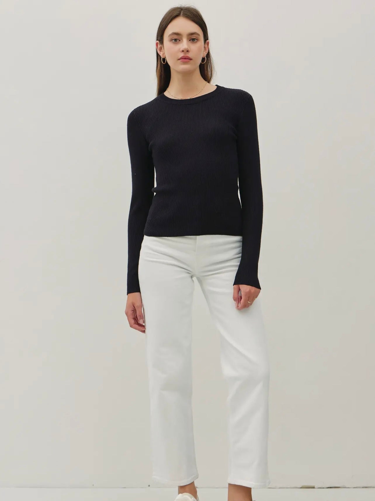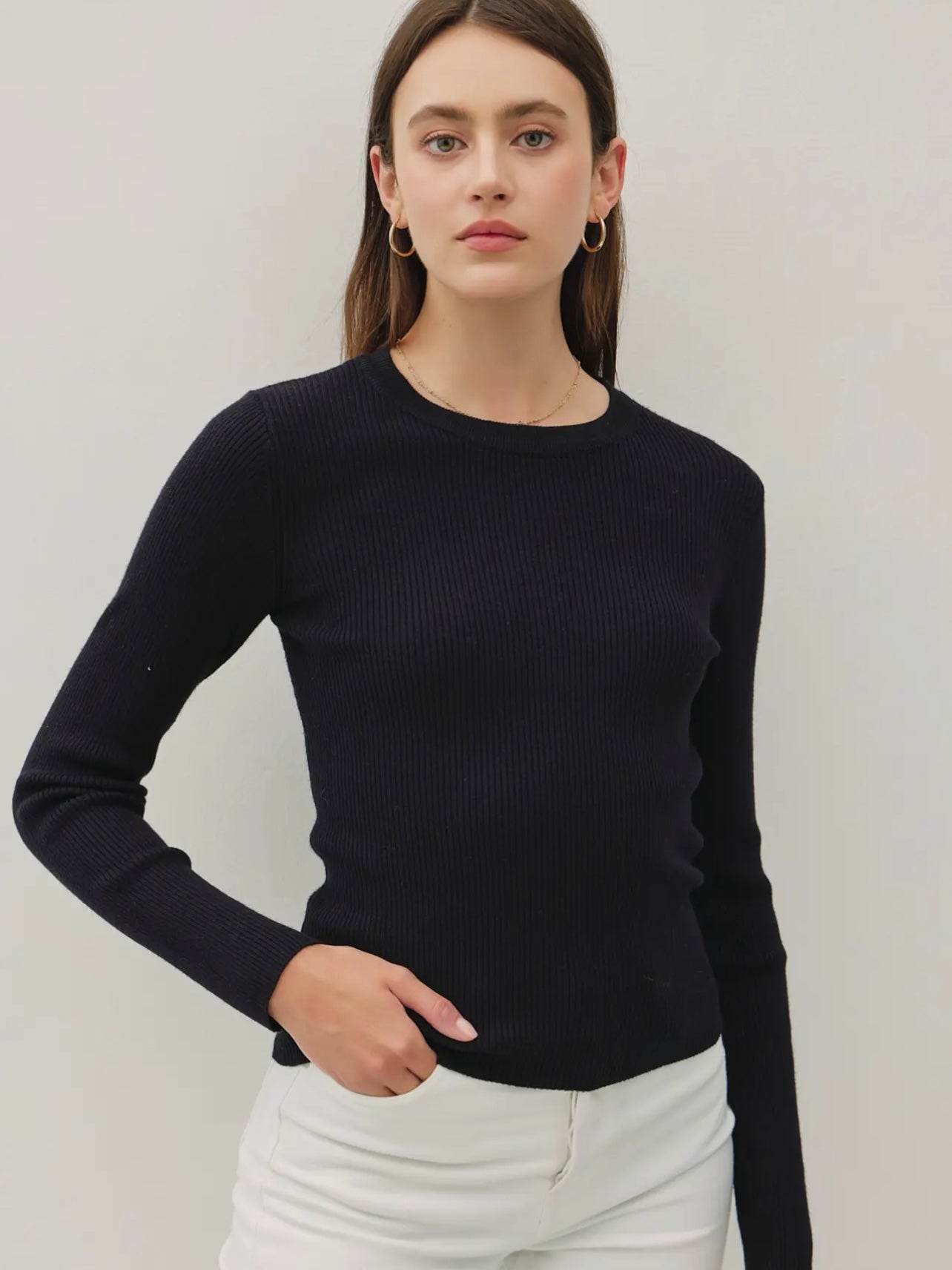 This black ribbed top features a fitted style and pairs perfectly as a layering piece or alone tucked into some jeans.