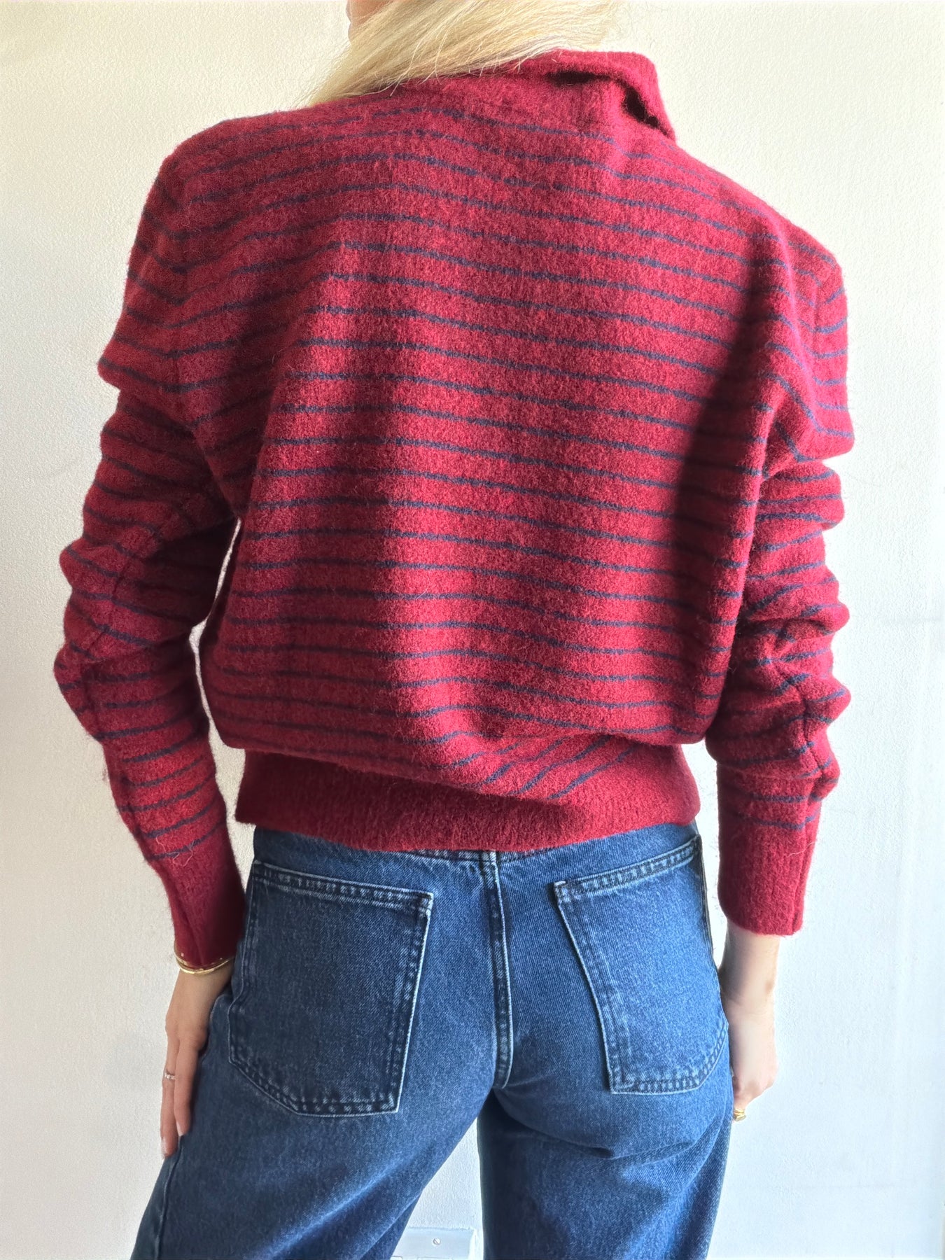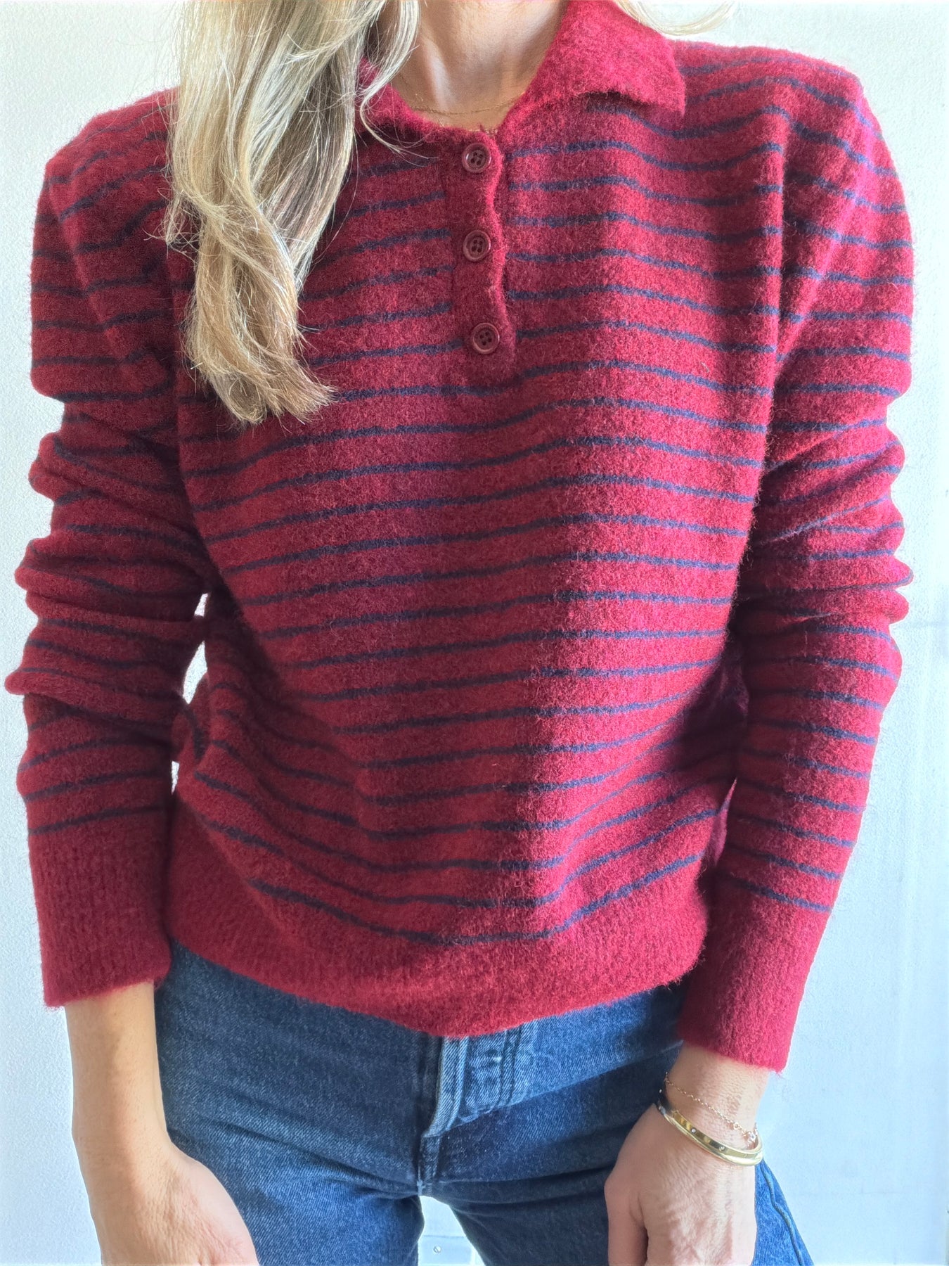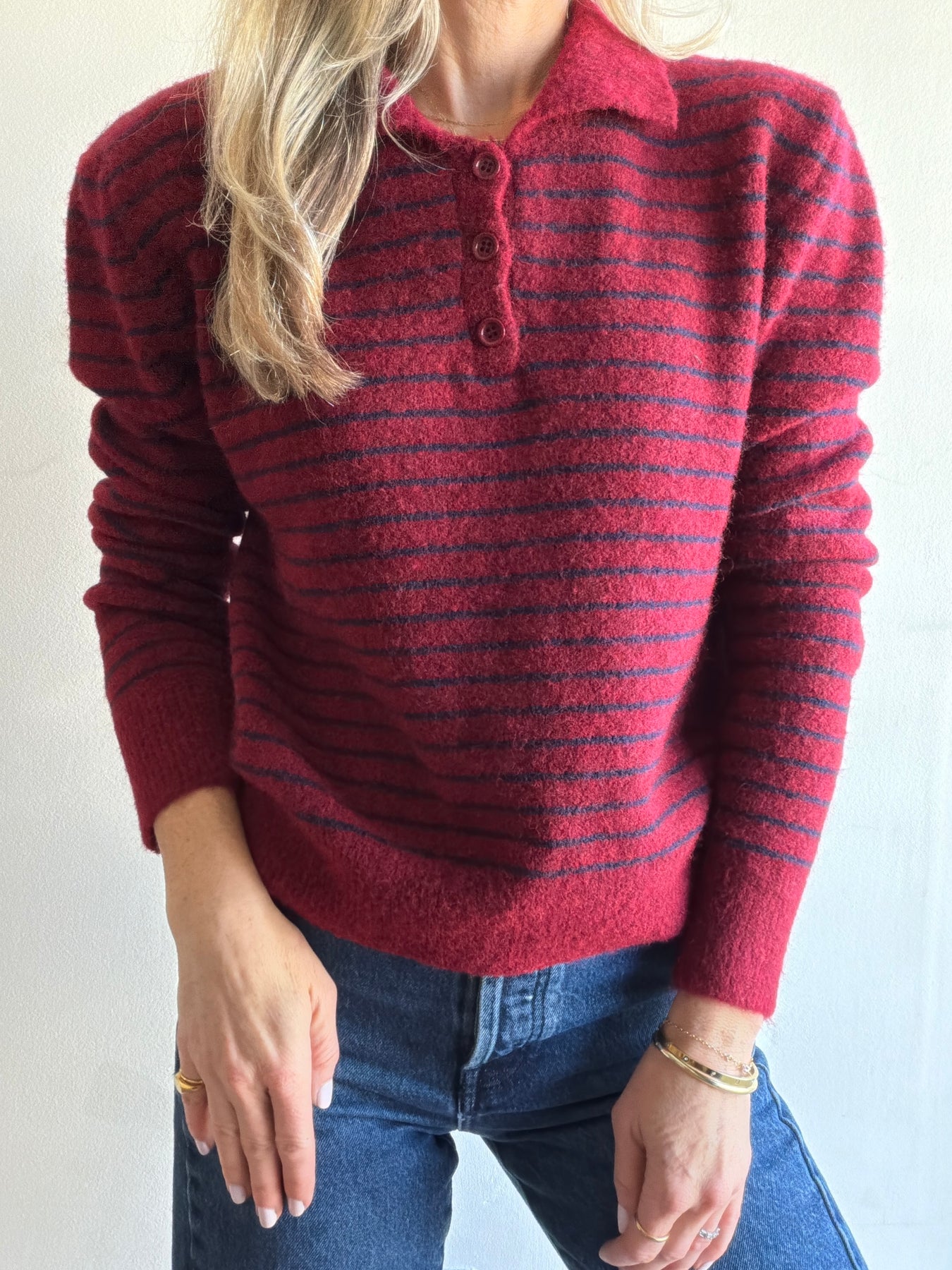 This sweater features an easy to wear style, collar, three buttons at the neckline and a stripe print with navy and maroon.
