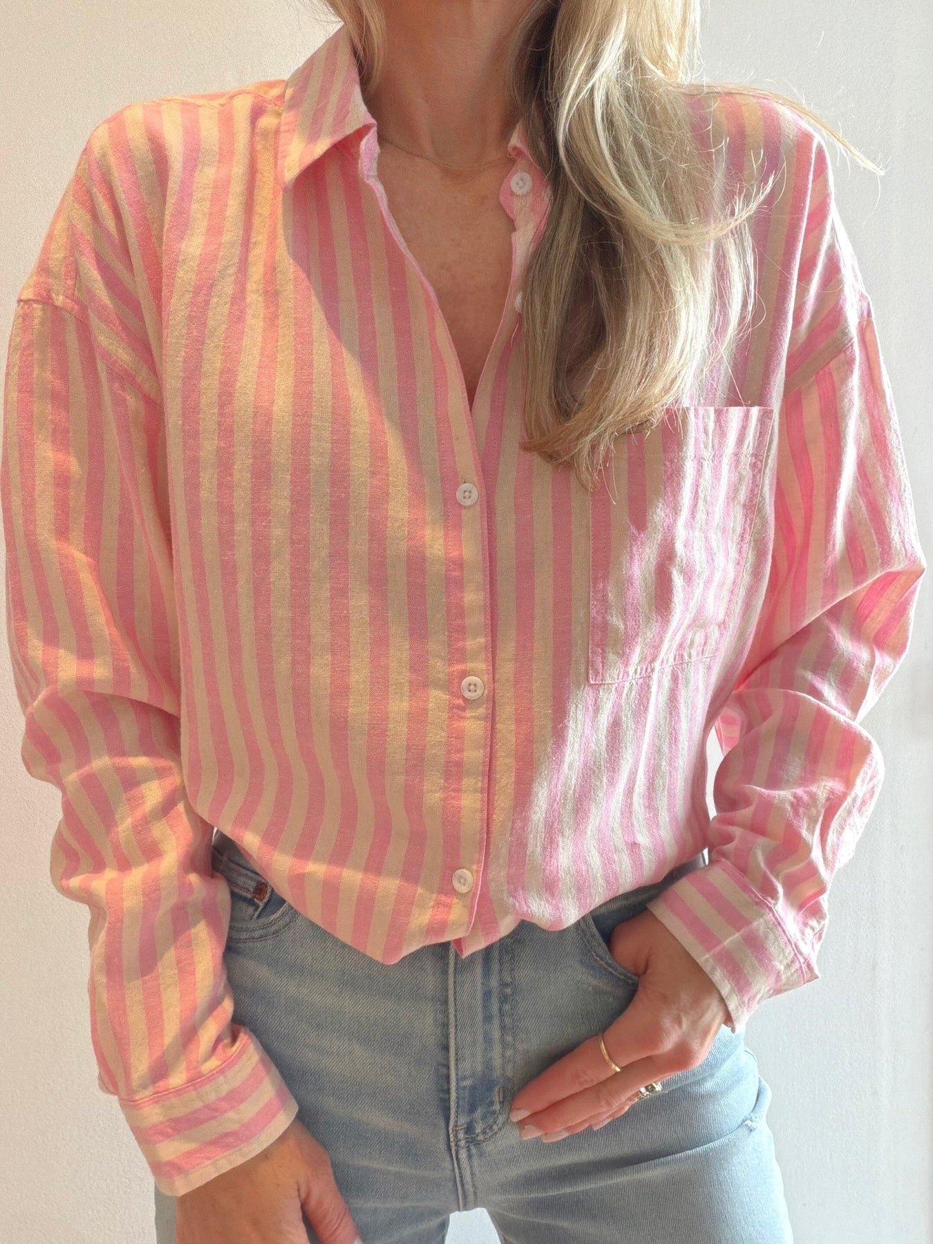 This top features a classic button down fit with pink and cream stripes. runs true to size. Model wearing size small