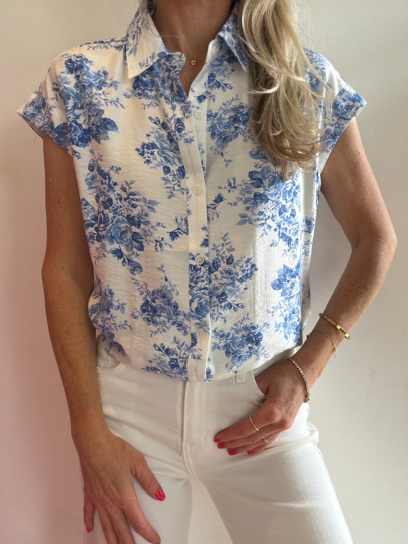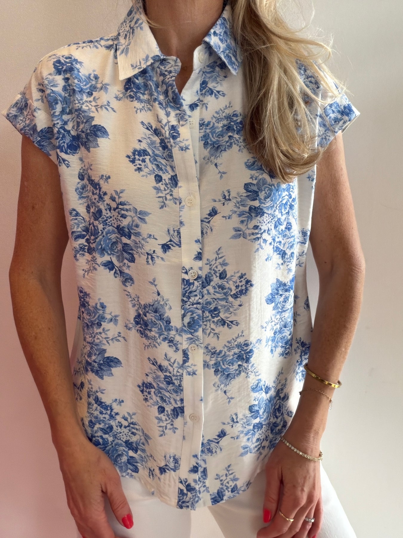 The perfect spring/summer blouse, featuring a blue and white floral print, button down closure and a collar.
