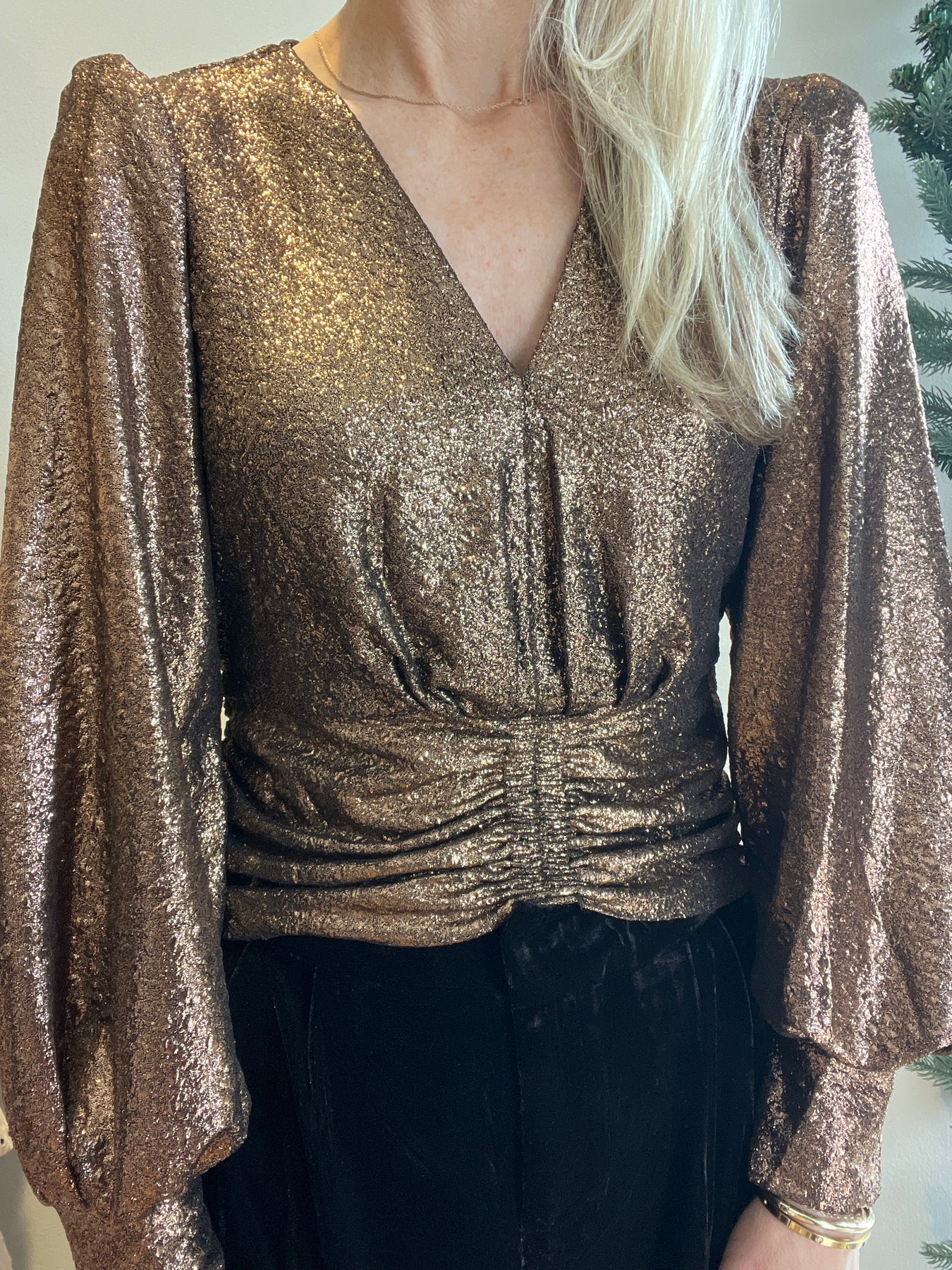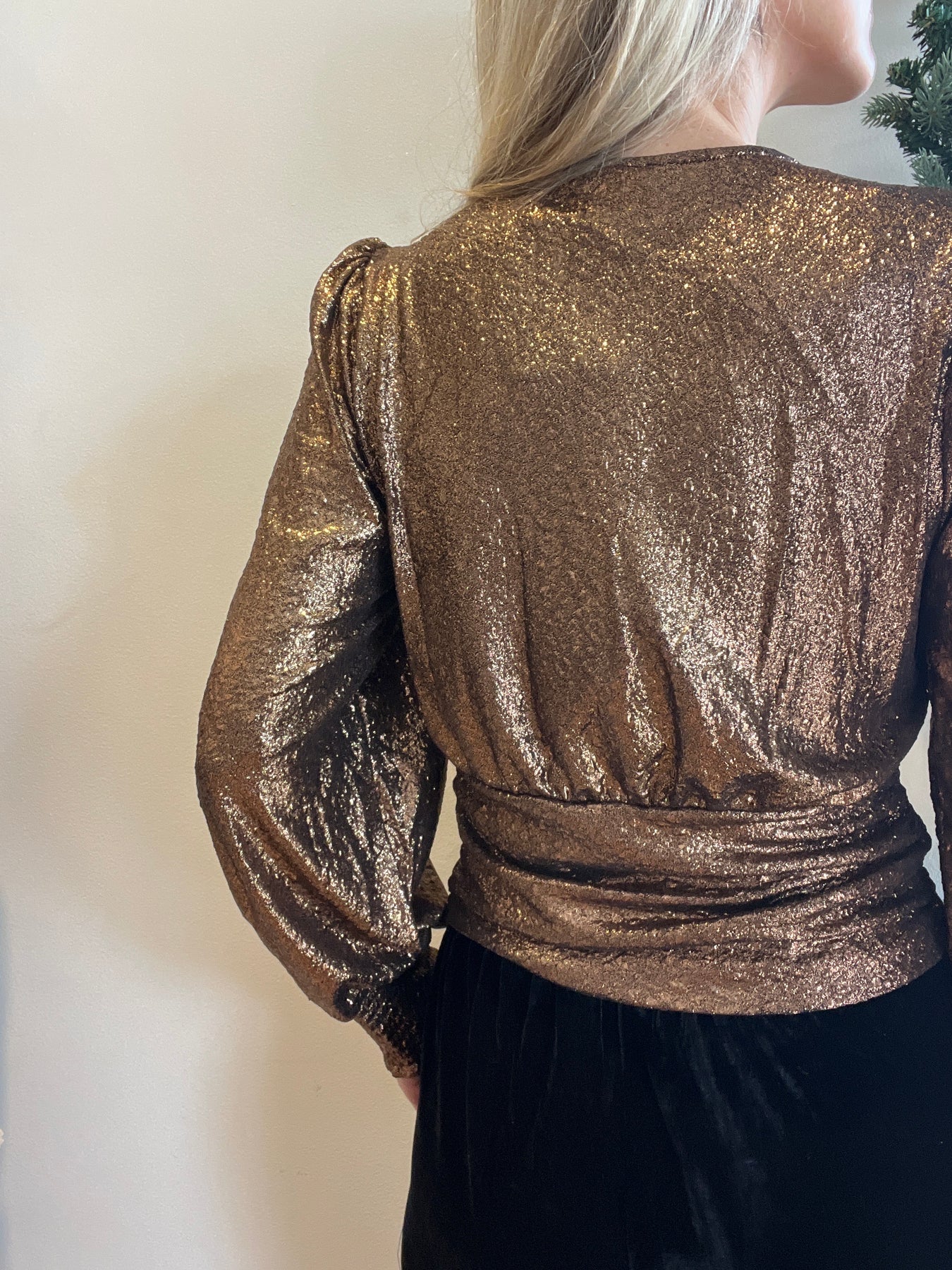 This beautiful top features flattering draping, metallic gold copper and a zipper closure. runs true to size