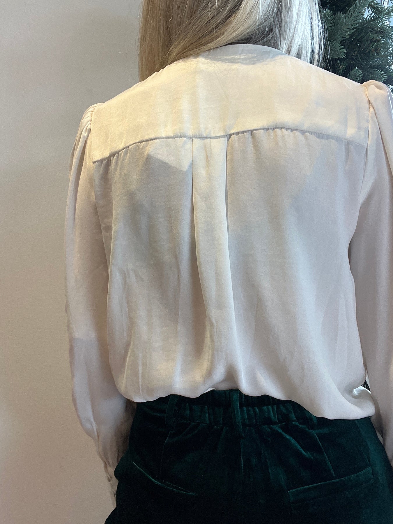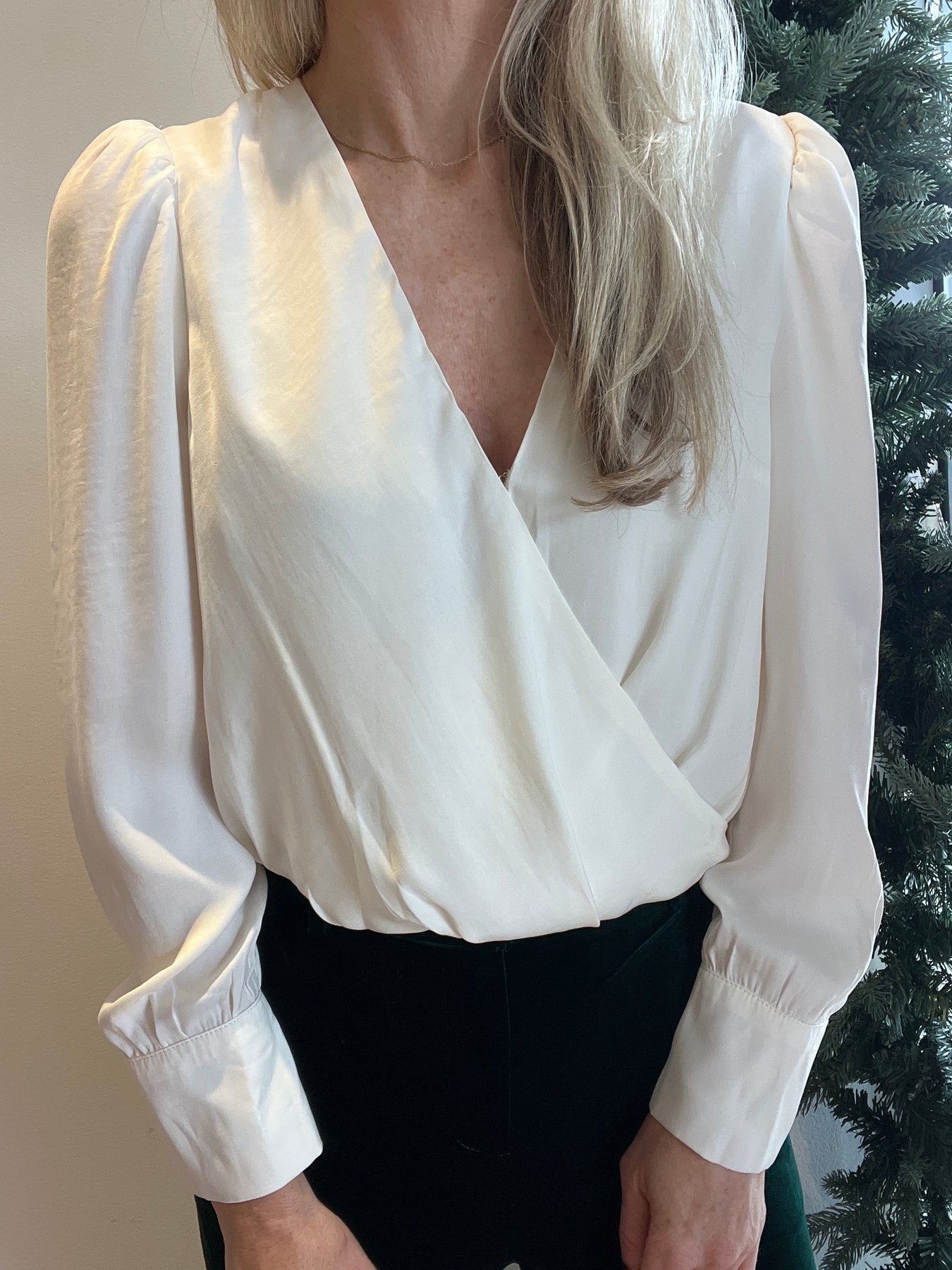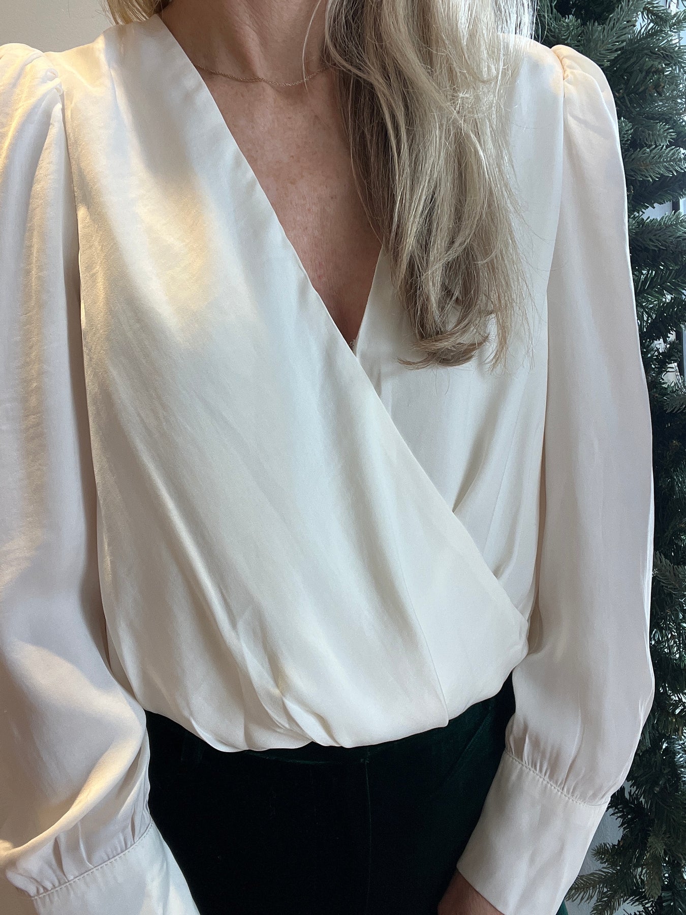 This blouse features a classic design, hook and eye closure at v neckline and a beautiful satin fabric. runs true to size