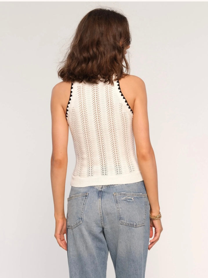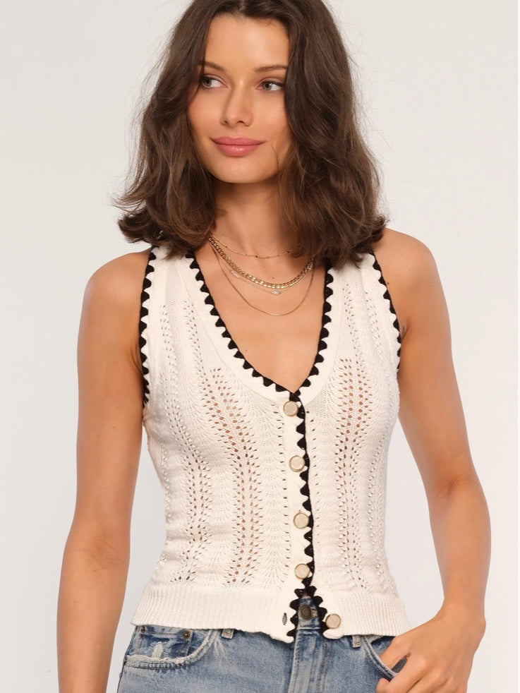The Bethany Vest is made from a soft yarn and has a pretty cable & pointelle stitch. It features a button down front and a contrast whip stitch around the edges. Perfect to throw on with your favorite denim.