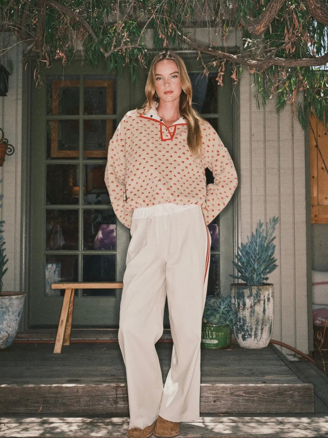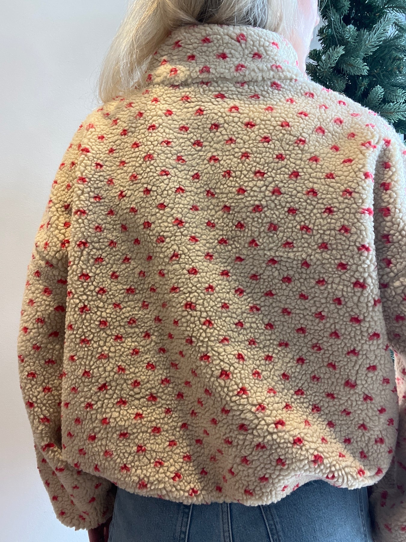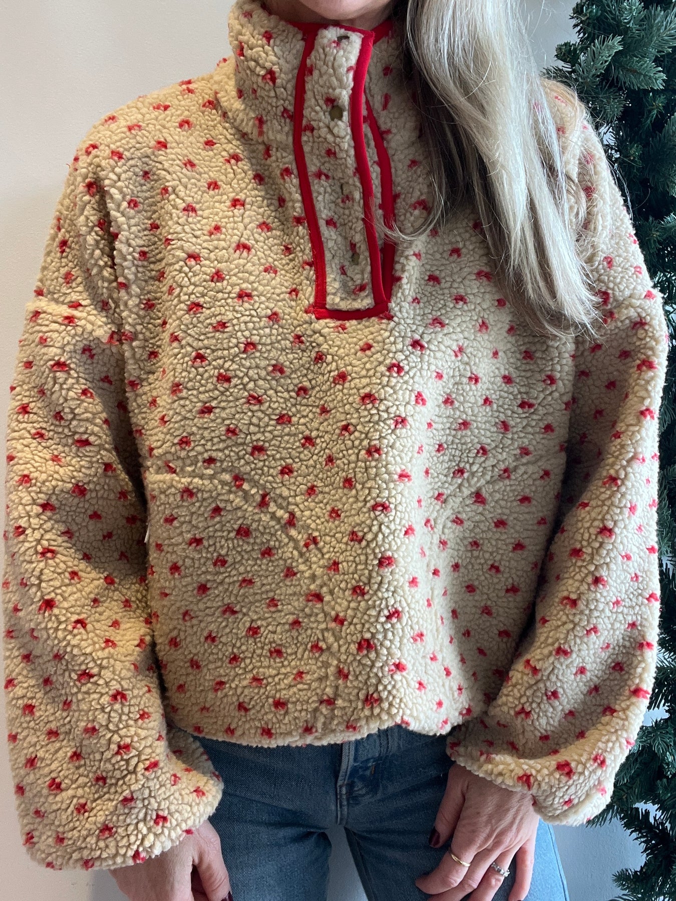 This cozy fleece pullover features a micro heart pattern, red piping and a button collar.