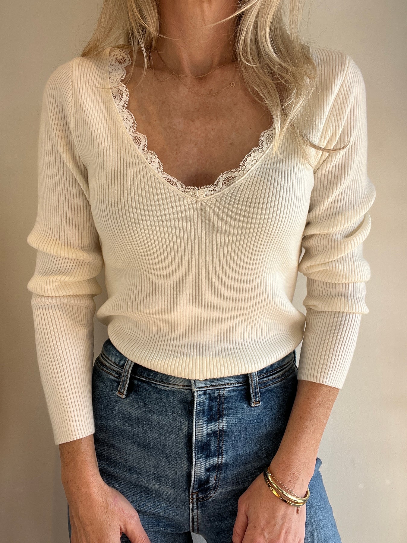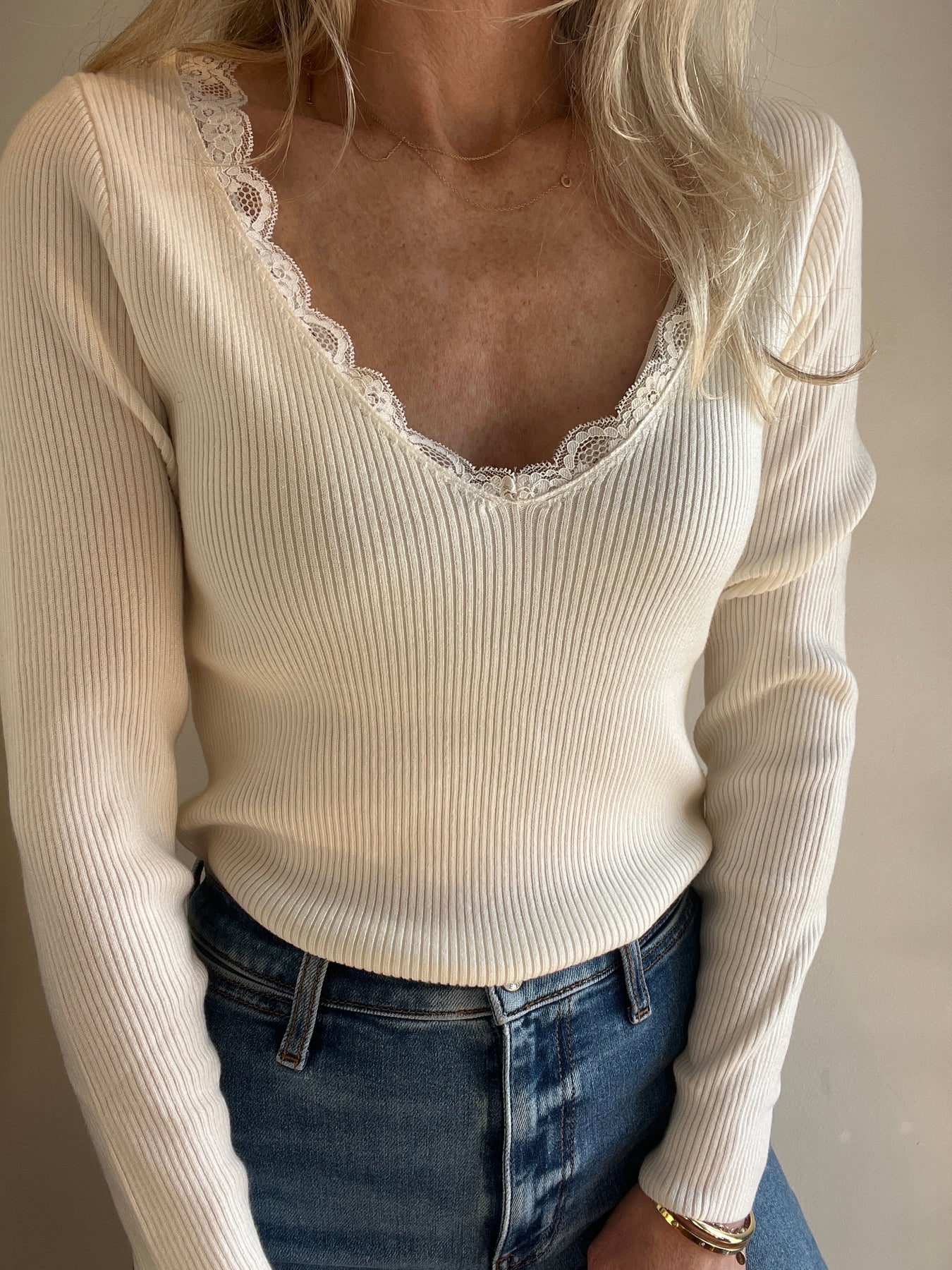 Ribbed knit undershirt-Slim fit-Long sleeves-V-neckline, enhanced with a lace band-Length from the shoulder 23.6 inch for a size S