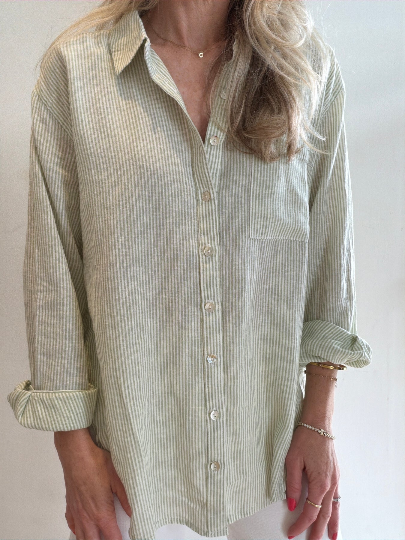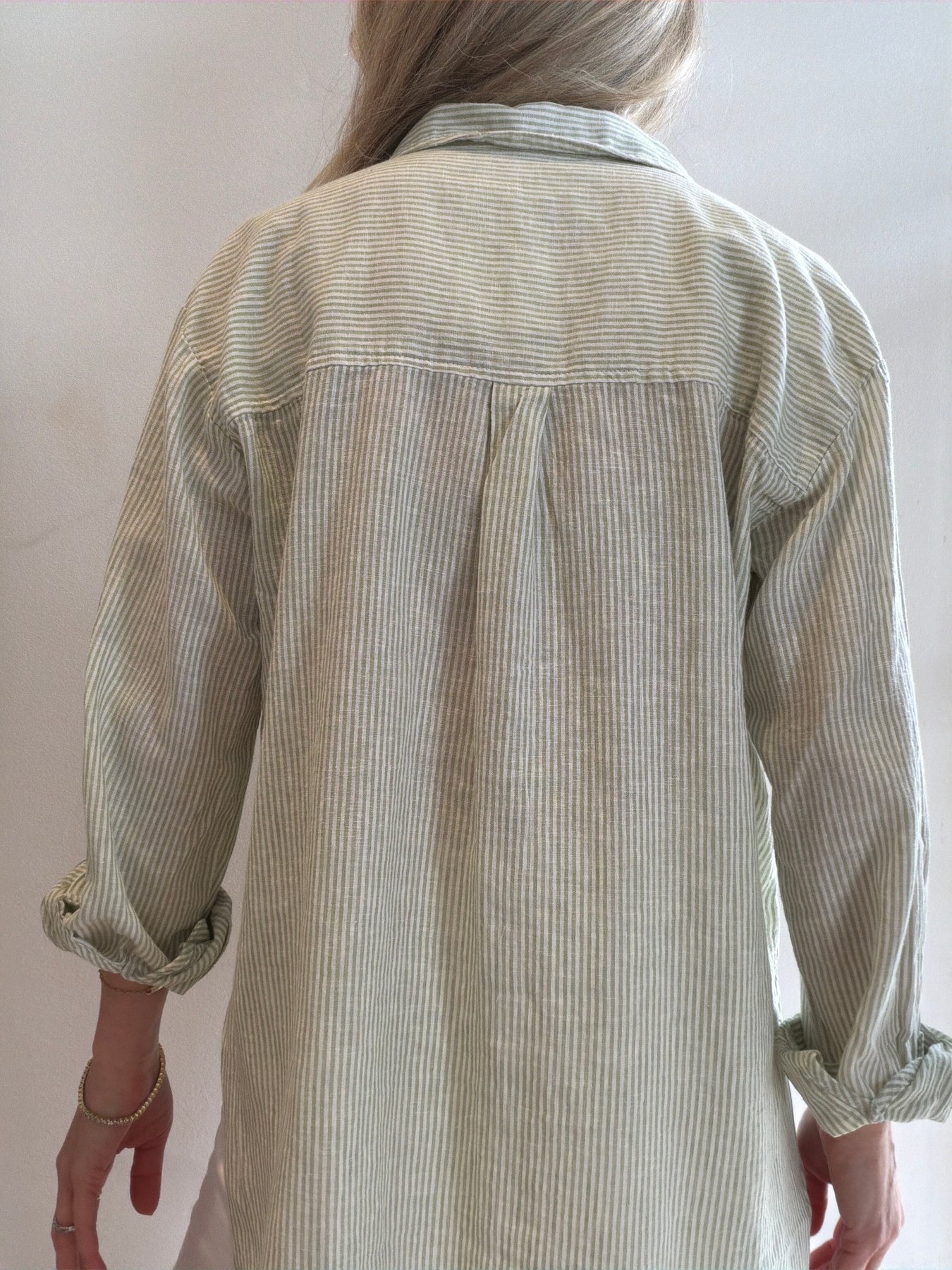 Elevate your everyday wardrobe with the Striped Long Sleeve Collared Button-Up Shirt.Featuring a timeless striped pattern, this shirt is designed for both versatility and style. The classic fit ensures all-day comfort, making it an ideal choice for work or casual outings. A front chest pocket adds functional detail while enhancing the overall design. The collared neckline and button-up front provide a polished look, while the long sleeves make it perfect for layering in cooler seasons or wearing on its own. Pair it with tailored pants or denim for a smart and effortless appearance. Composition is linen, cotton.