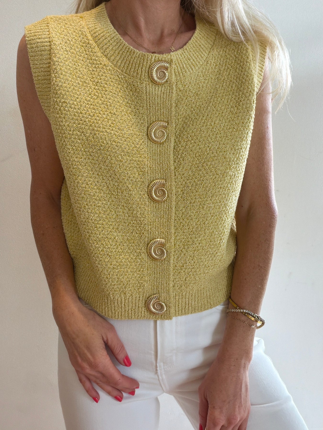 Textured knit vest in a soft chartreuse color with nautilus shell snap buttons in gold. Easy fit, hits at hip. Composition is poly, acrylic, nylon.