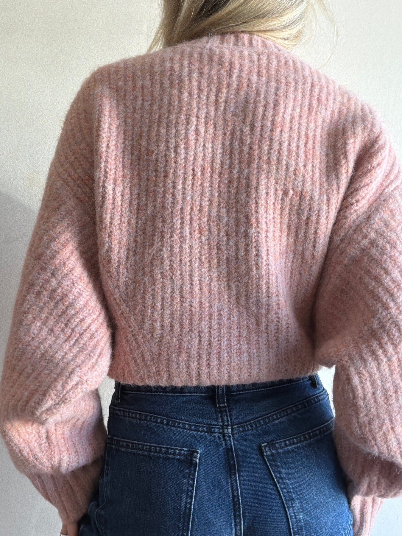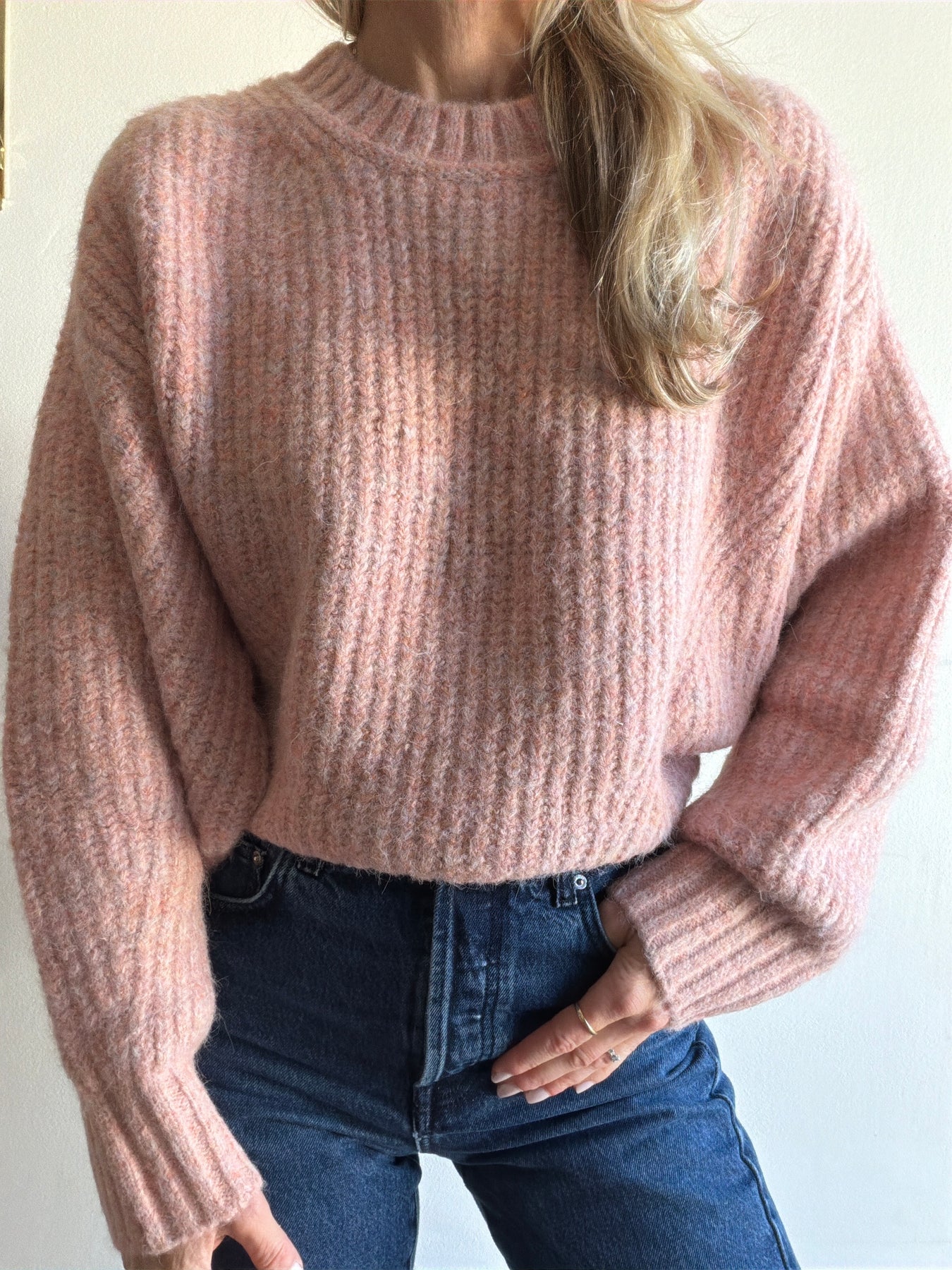 This ultra soft sweater features a pull over design, beautiful soft blush pink tone, slight cropped length and a dolman sleeve.
