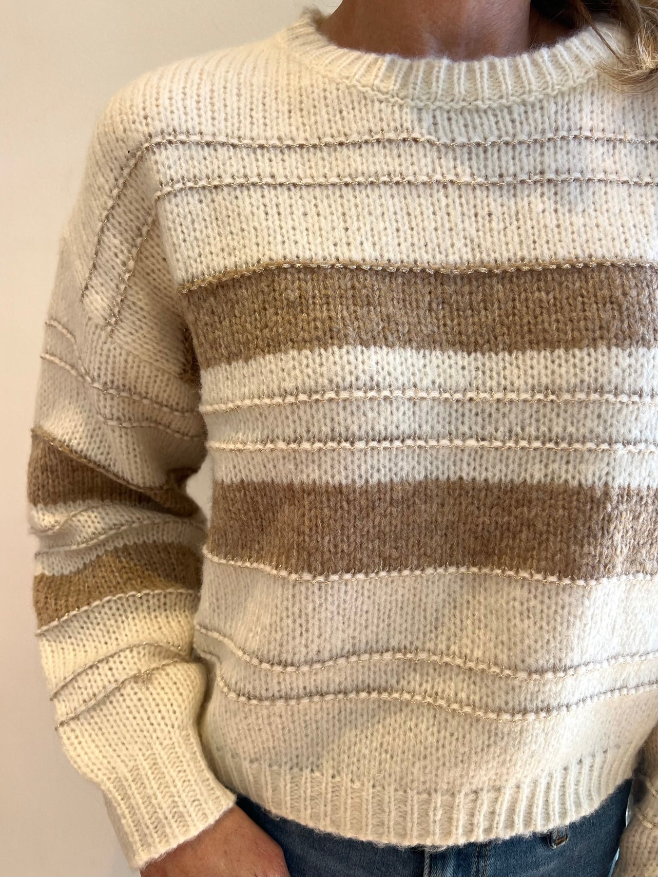 This beautiful sweater will transition you into fall and winter perfectly! It features neutral tones and metallic details.
