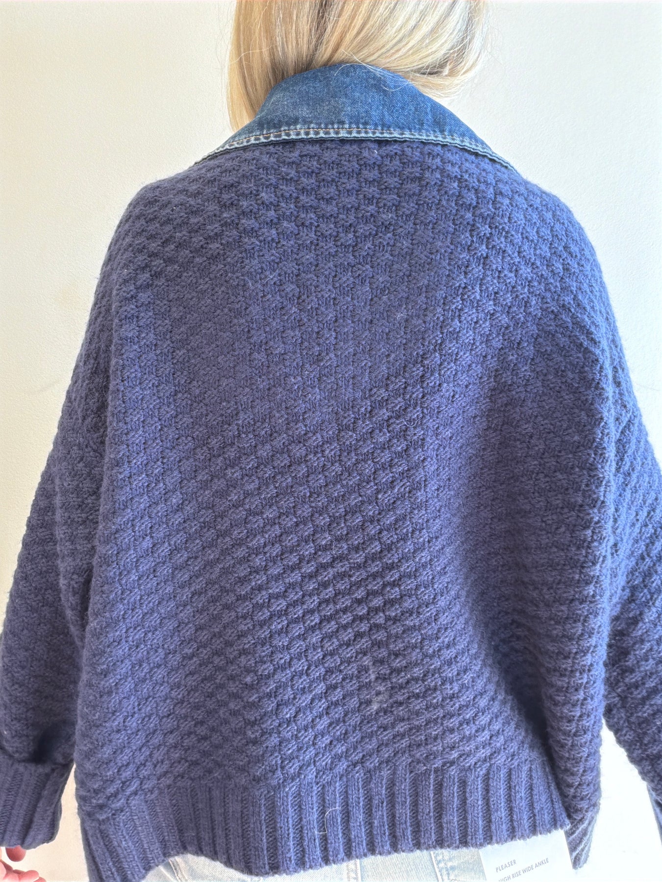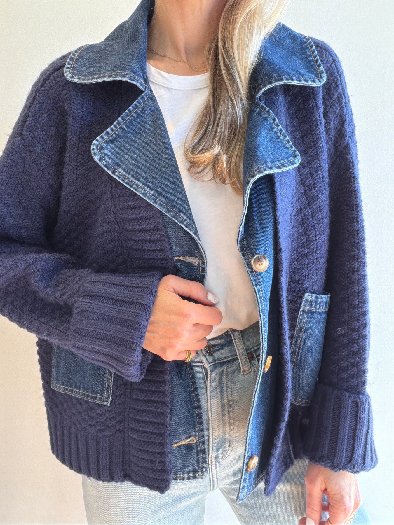 The Bryce jacket features a mixed media design. Part denim jacket, part navy cardigan sweater. The silhouette is an oversized boyfriend fit that hits just below the natural waist. Composition is cotton, poly, acrylic, wool.