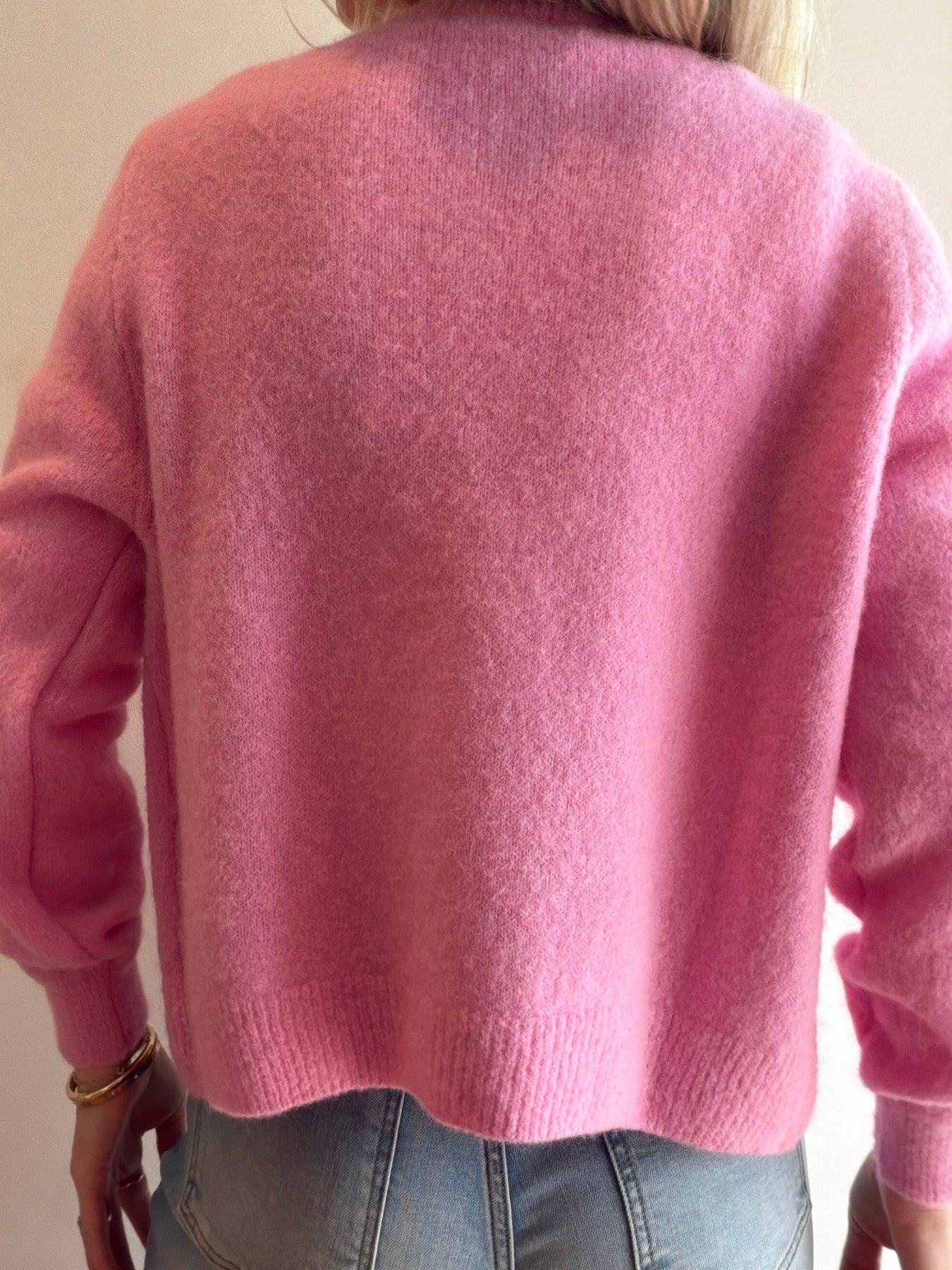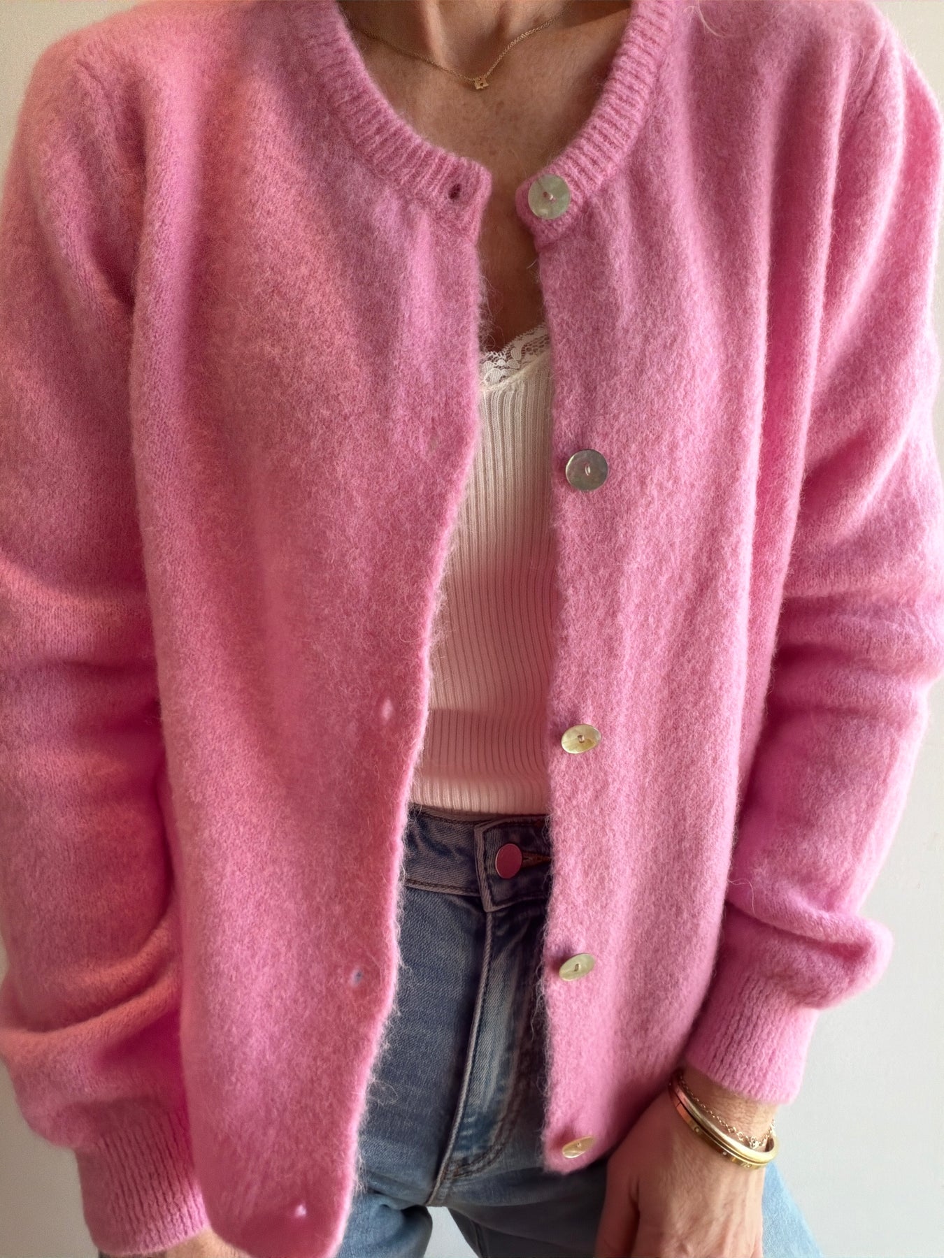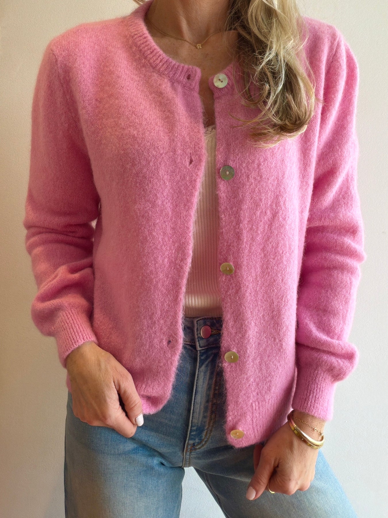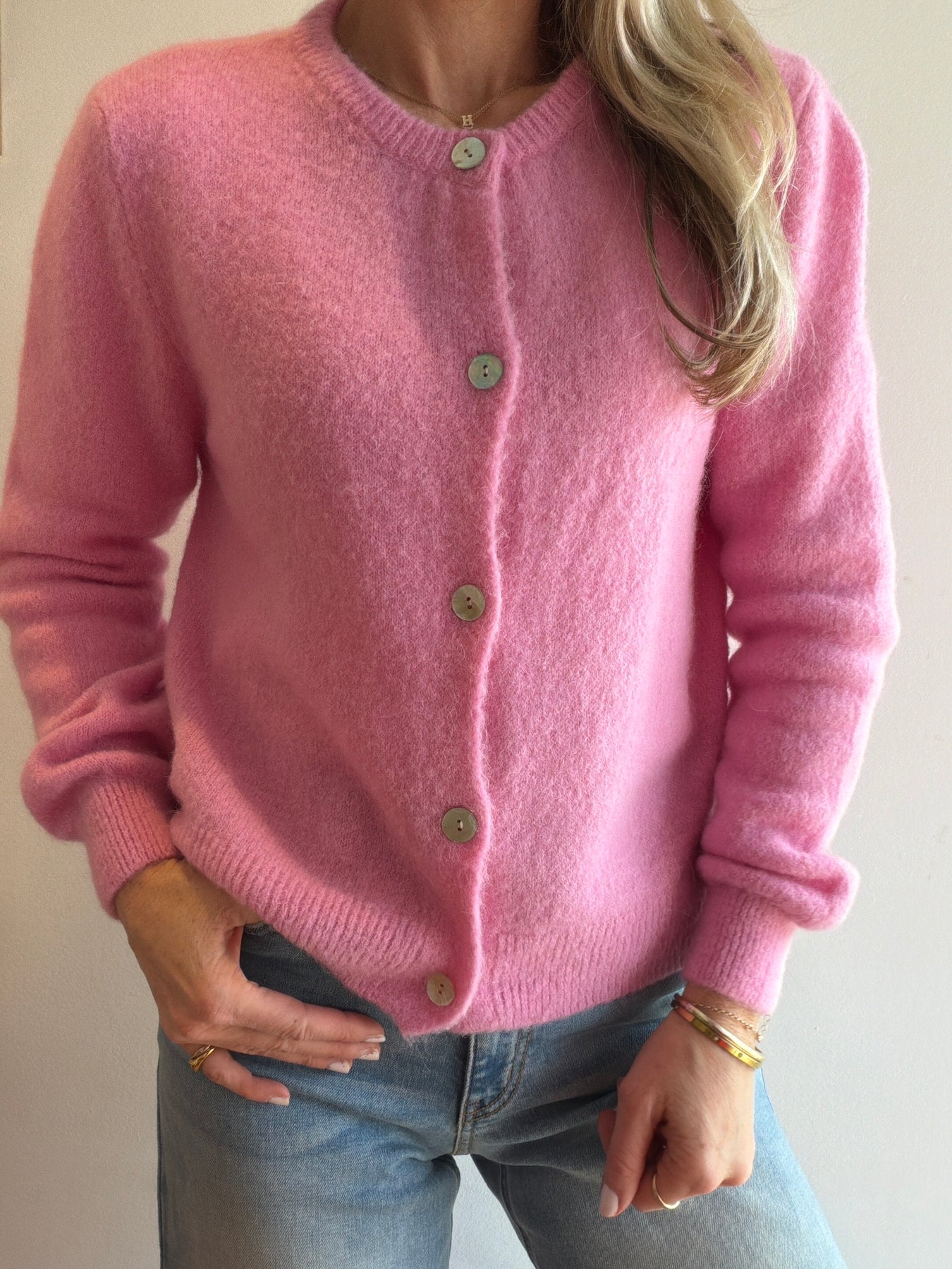 Super fine alpaca mother of pearl button cardigan. 31% poly 30% superfine alpaca 28% acrylic 10% wool 1% elastane