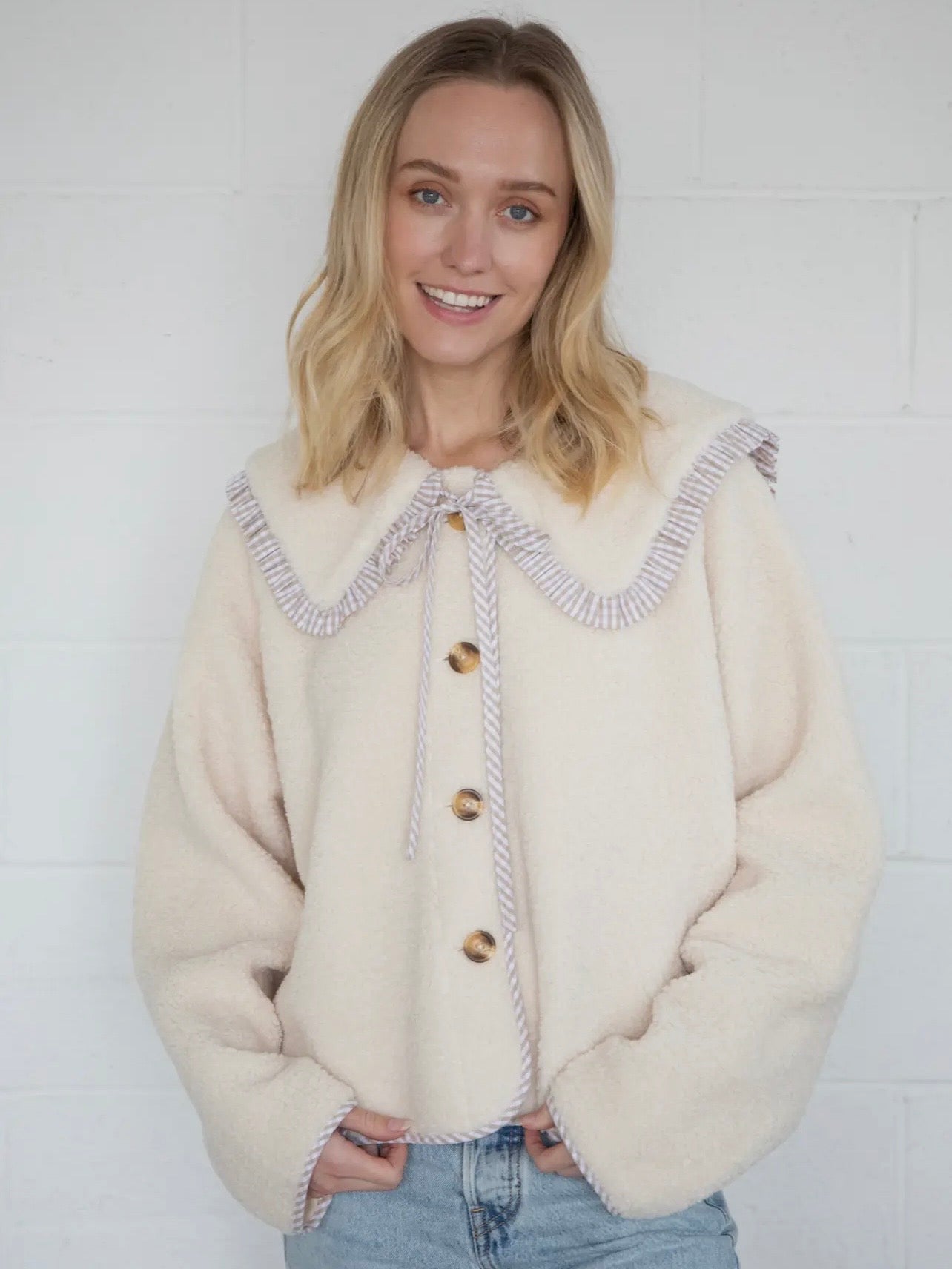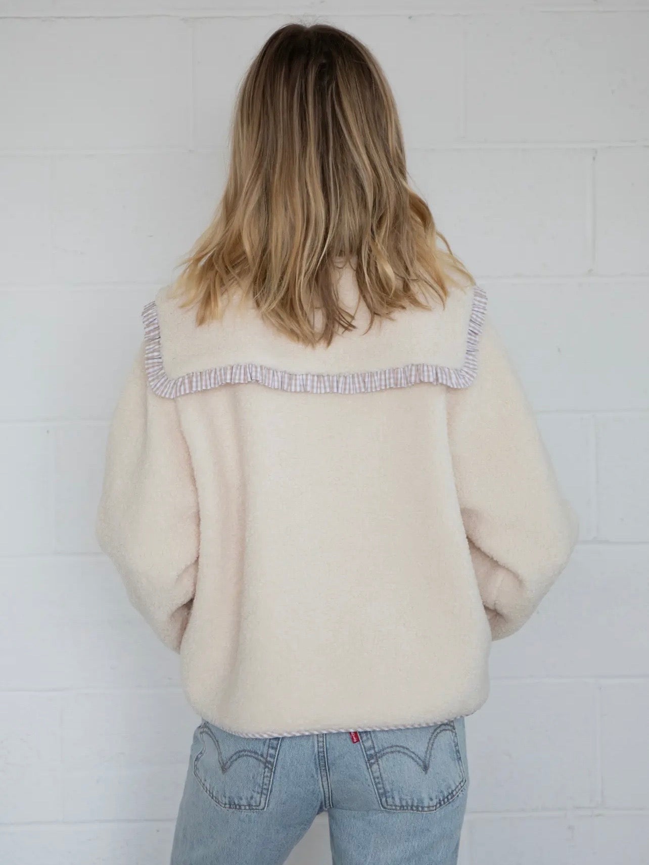 This sweet coat features Sherpa, a Peter Pan collar and tan gingham details.