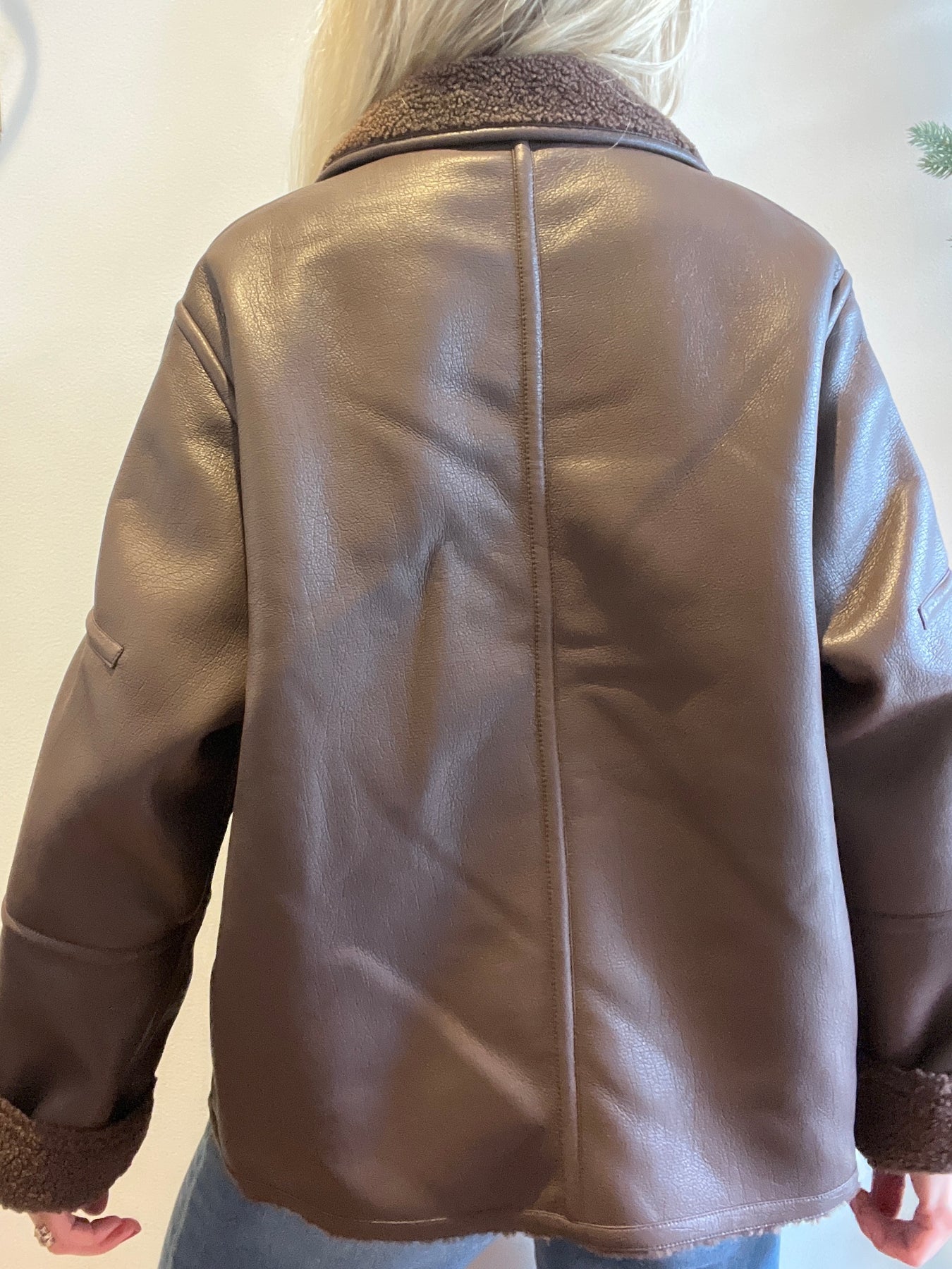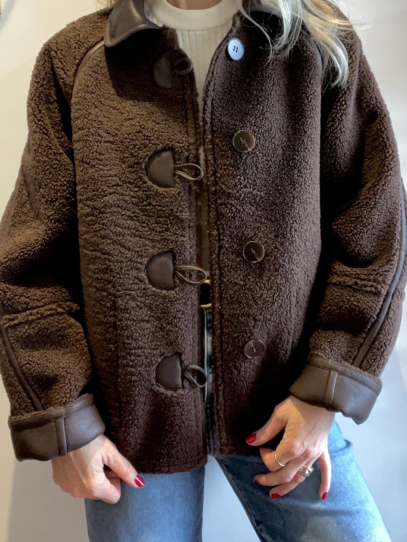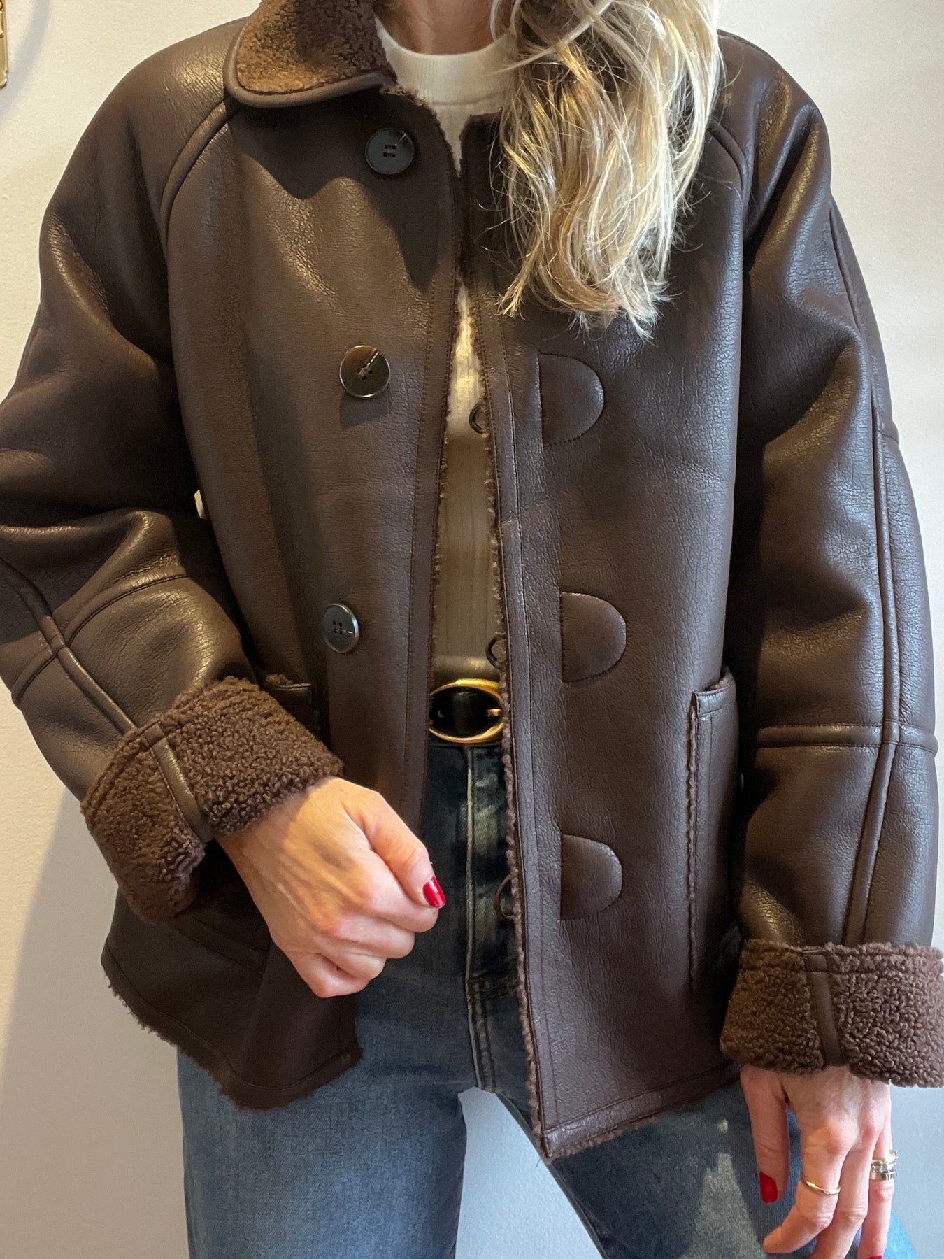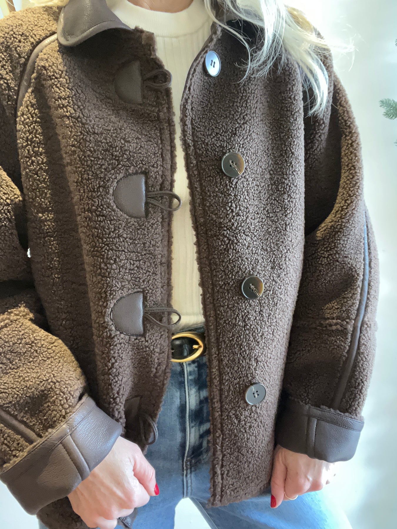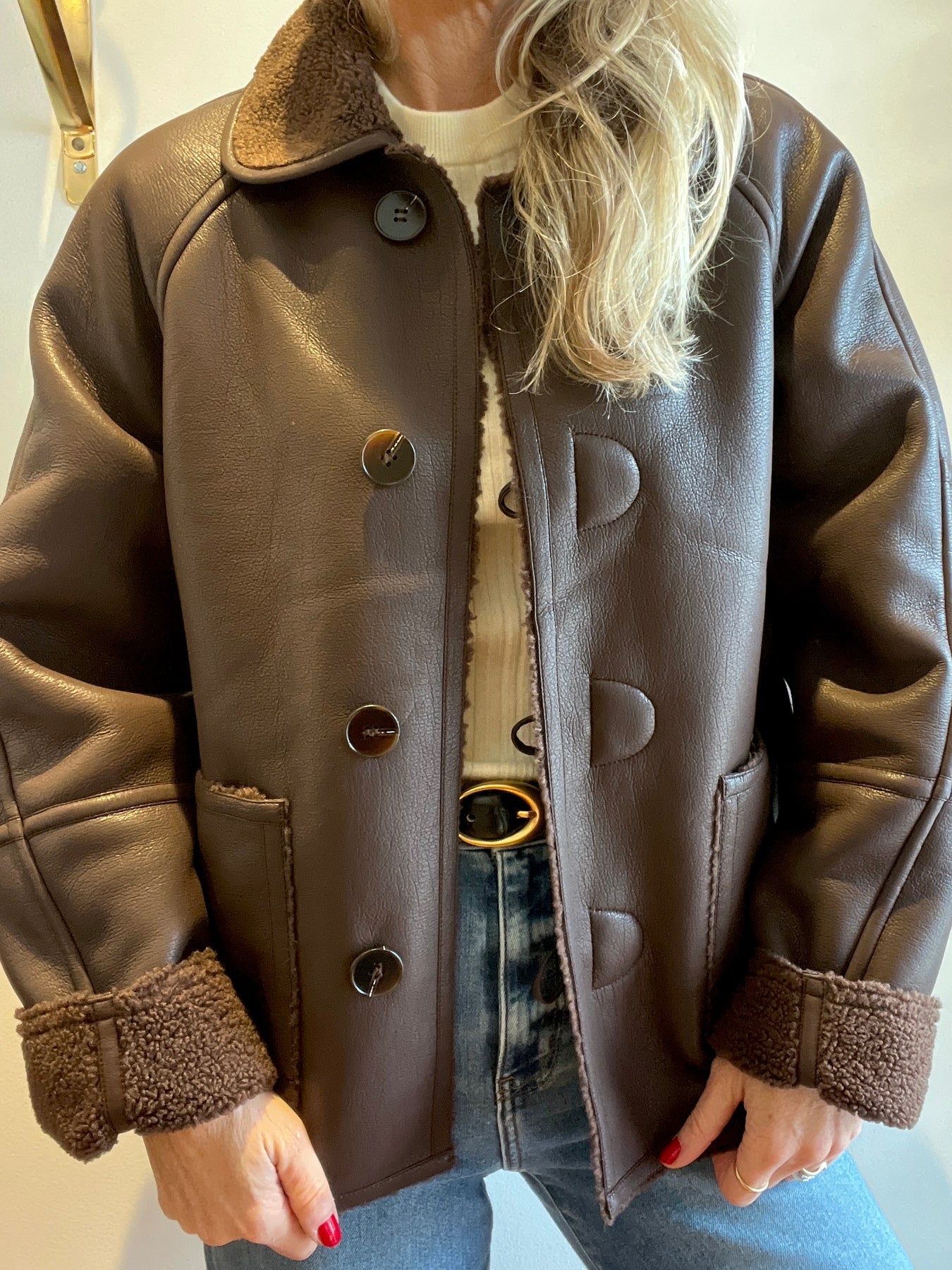 Honey coat is faux shearling. Made in this luxurious brown color. It's fully reversible. Featuring pockets and button closure.