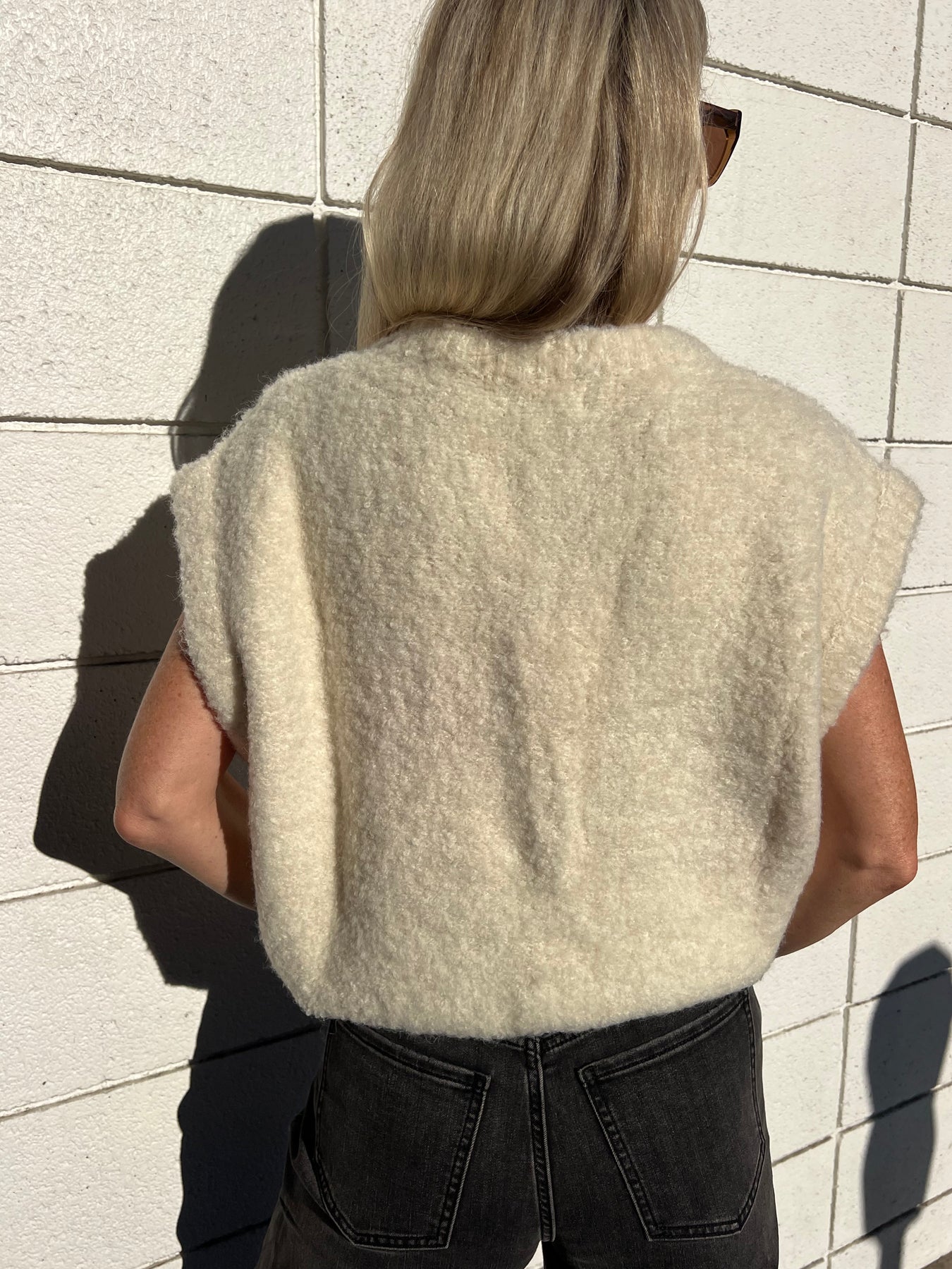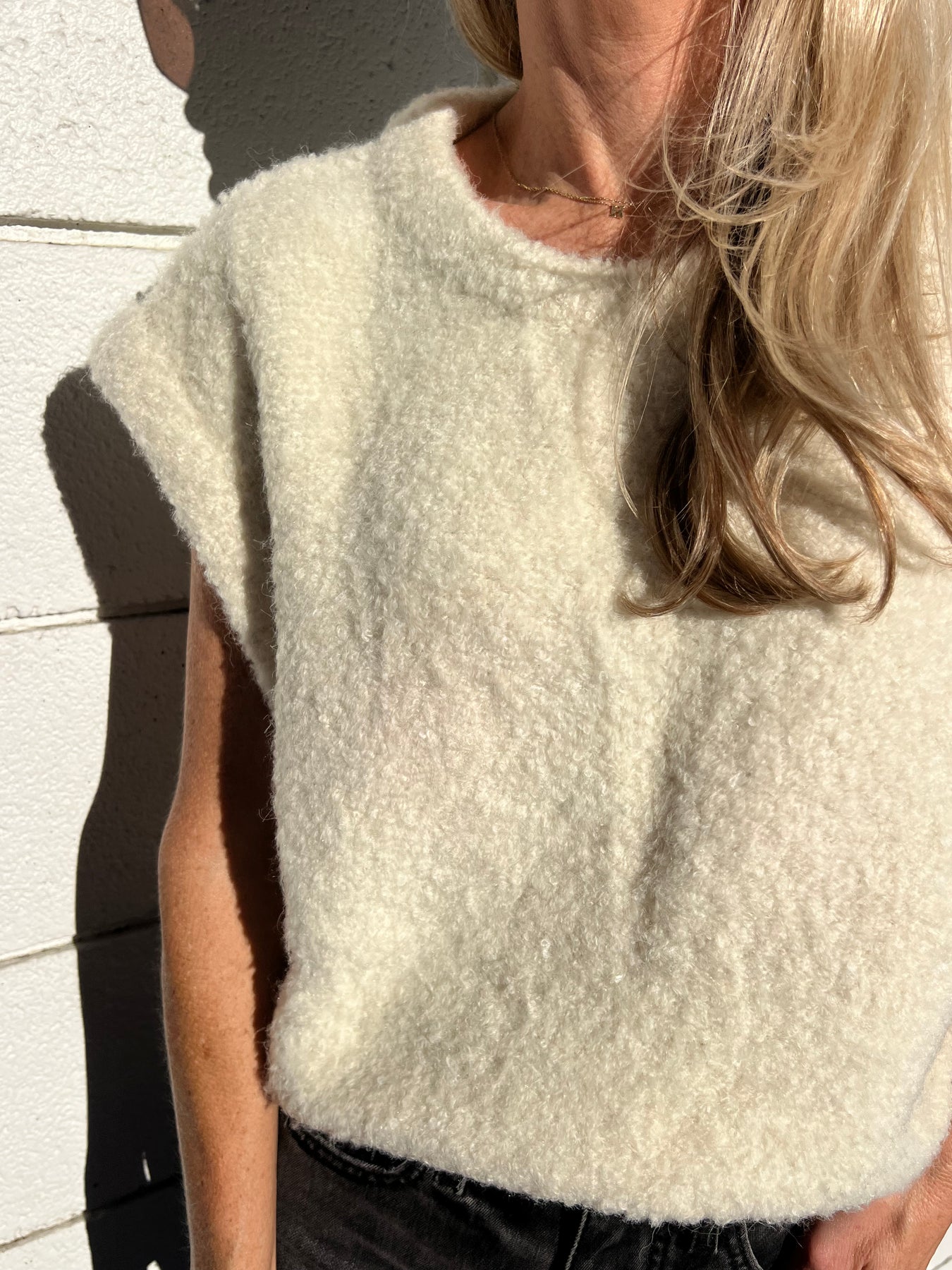 This sweater top features a soft boucle sweater fabric, oversized fit and short sleeves. runs true to size. Model wearing size small