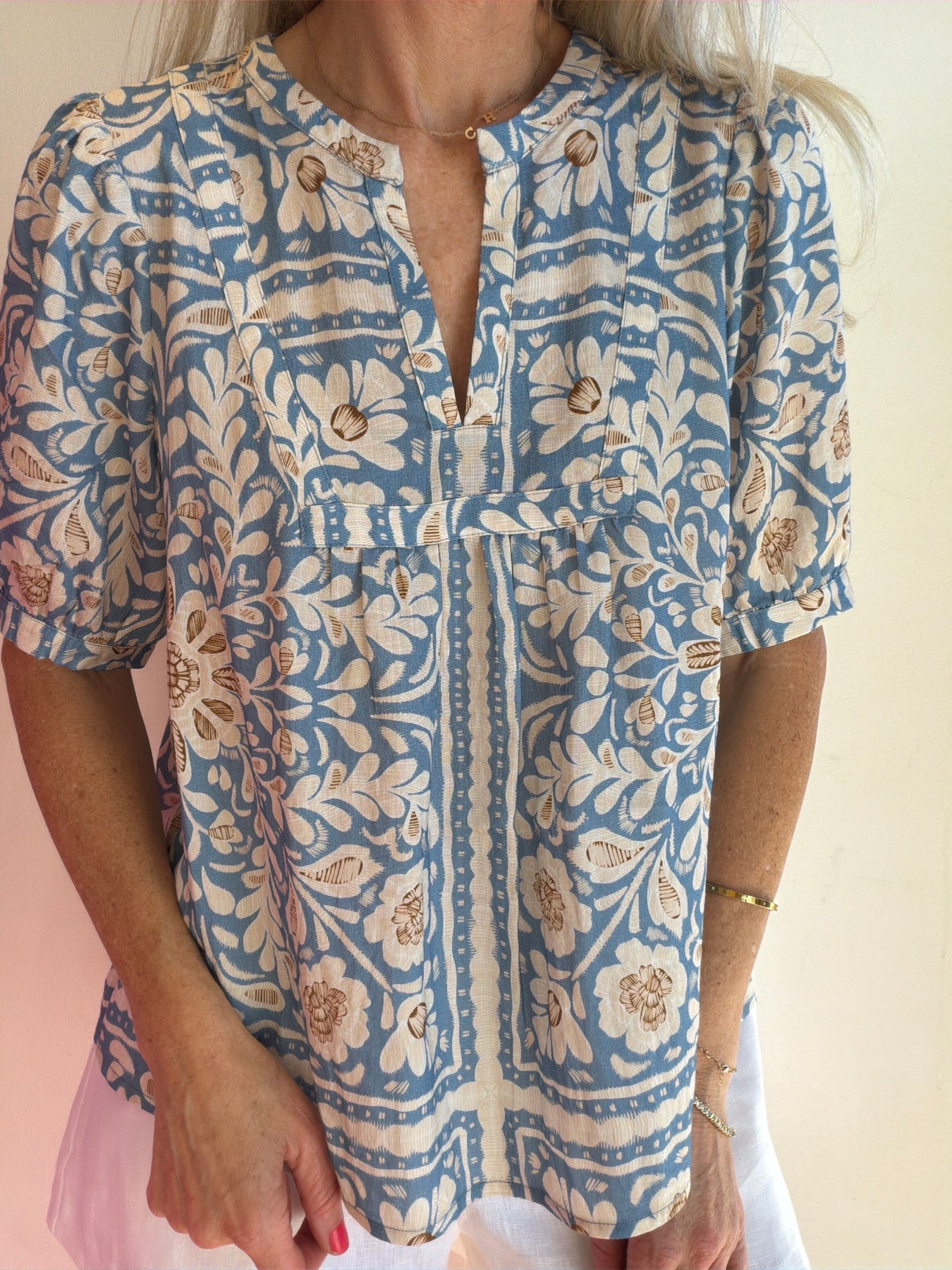 Presented in a calming, sophisticated Dusty Blue, the Charlotte top is defined by its flattering split neckline, which creates a subtle V-shape that elongates the frame without being overly revealing. The elbow-length sleeves provide elegant coverage and a modern, tailored feel.