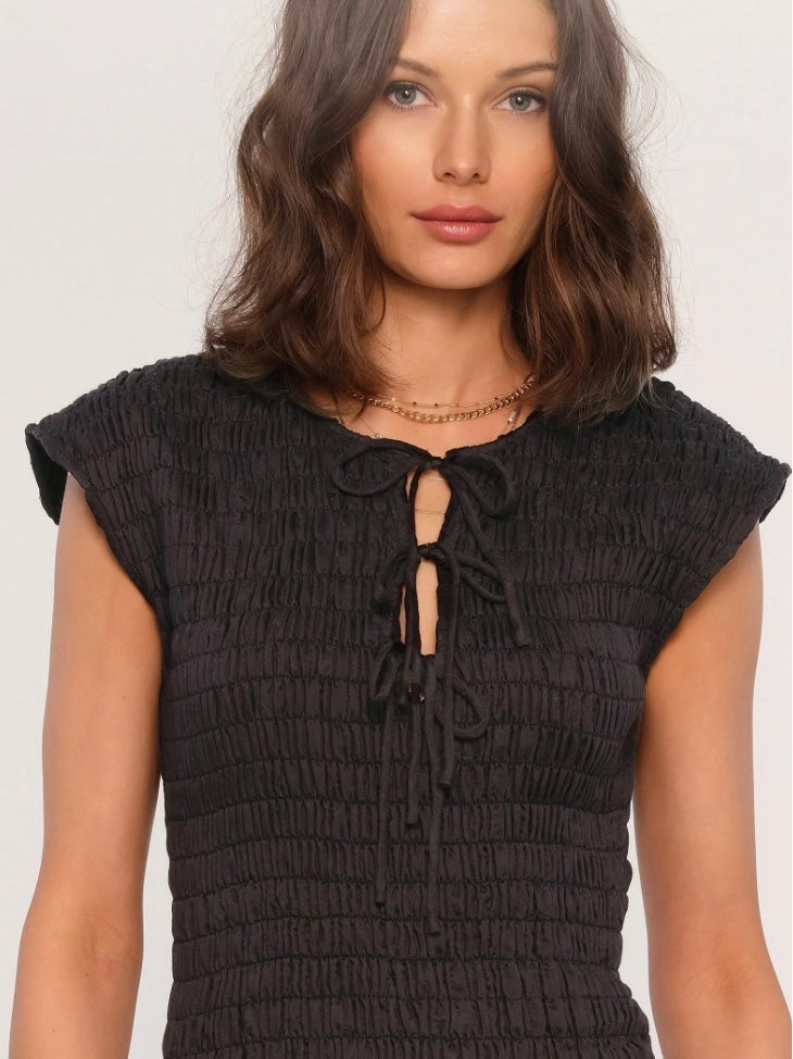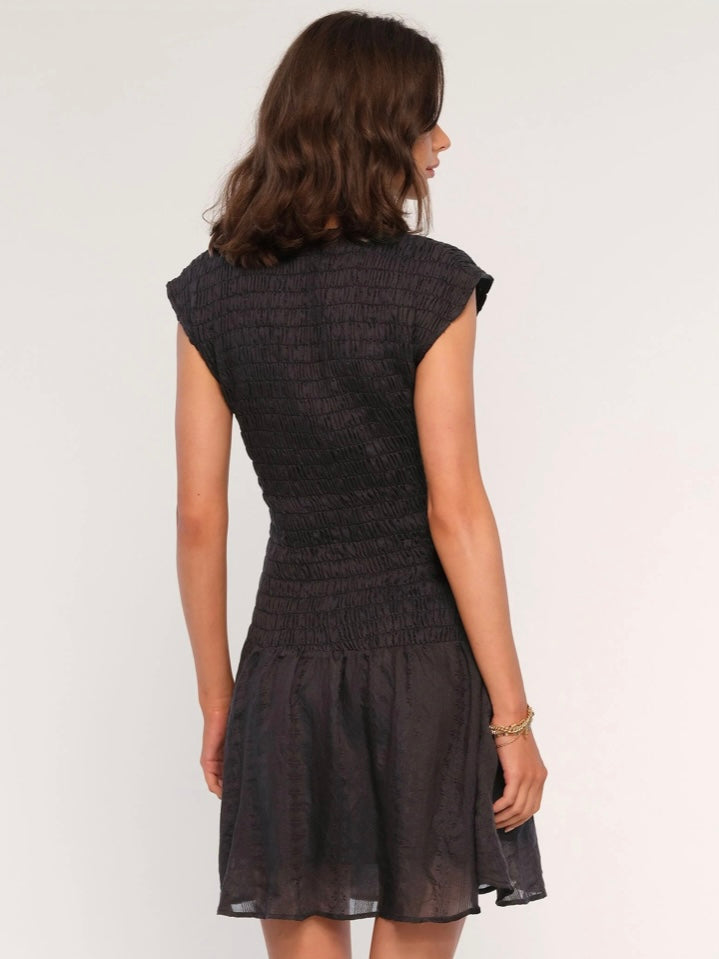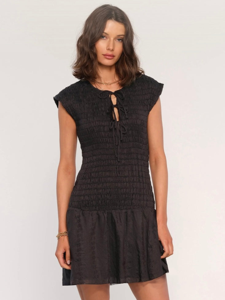 The Aya Dress is a crepe-de-chine, dropped waist mini, that’s smocked throughout the whole bodice. It features sweet cap sleeves, and a front keyhole with self ties. Perfect for transitioning into spring.