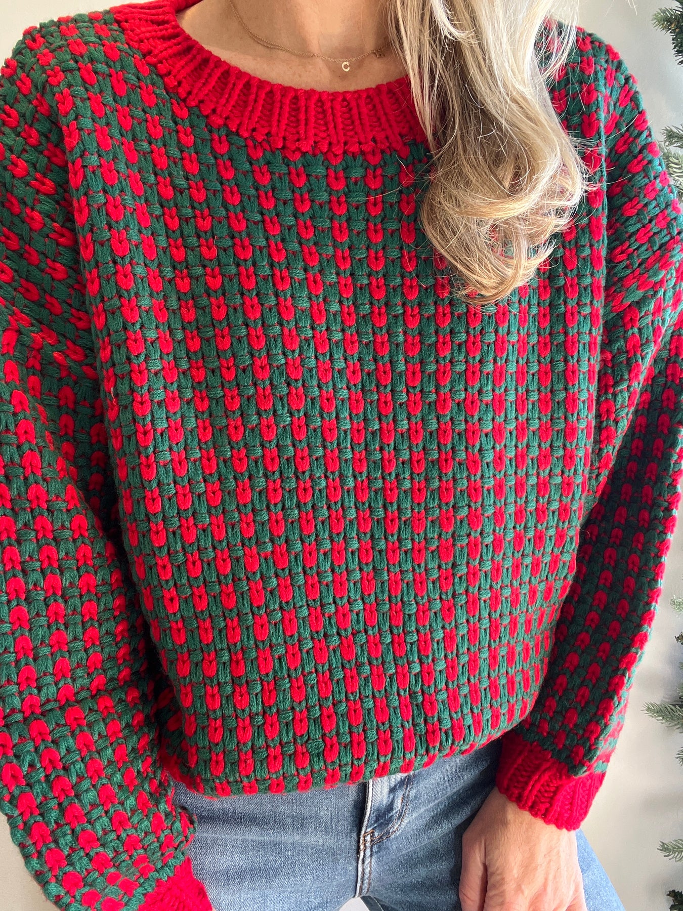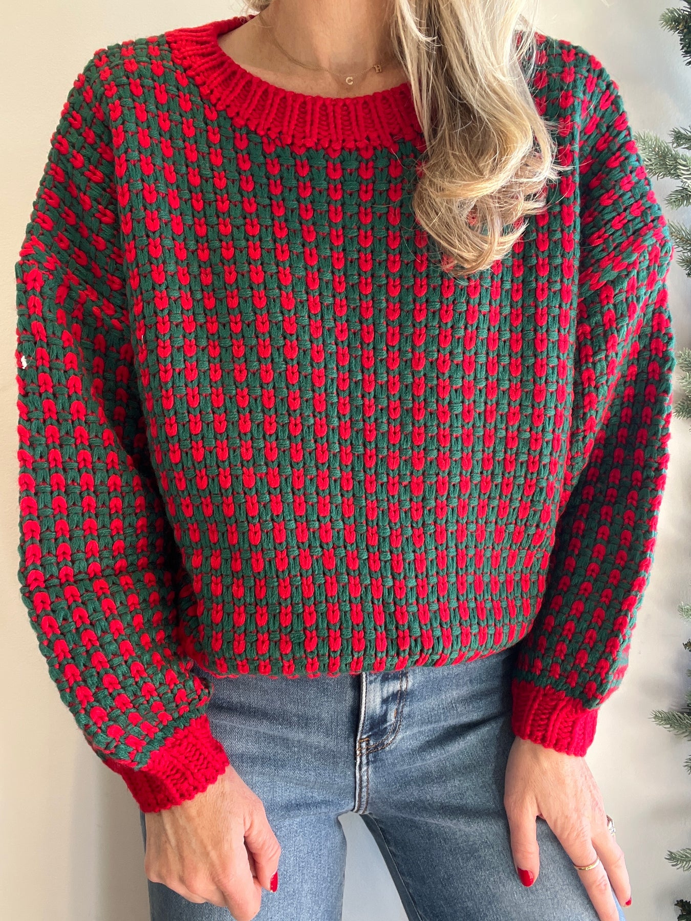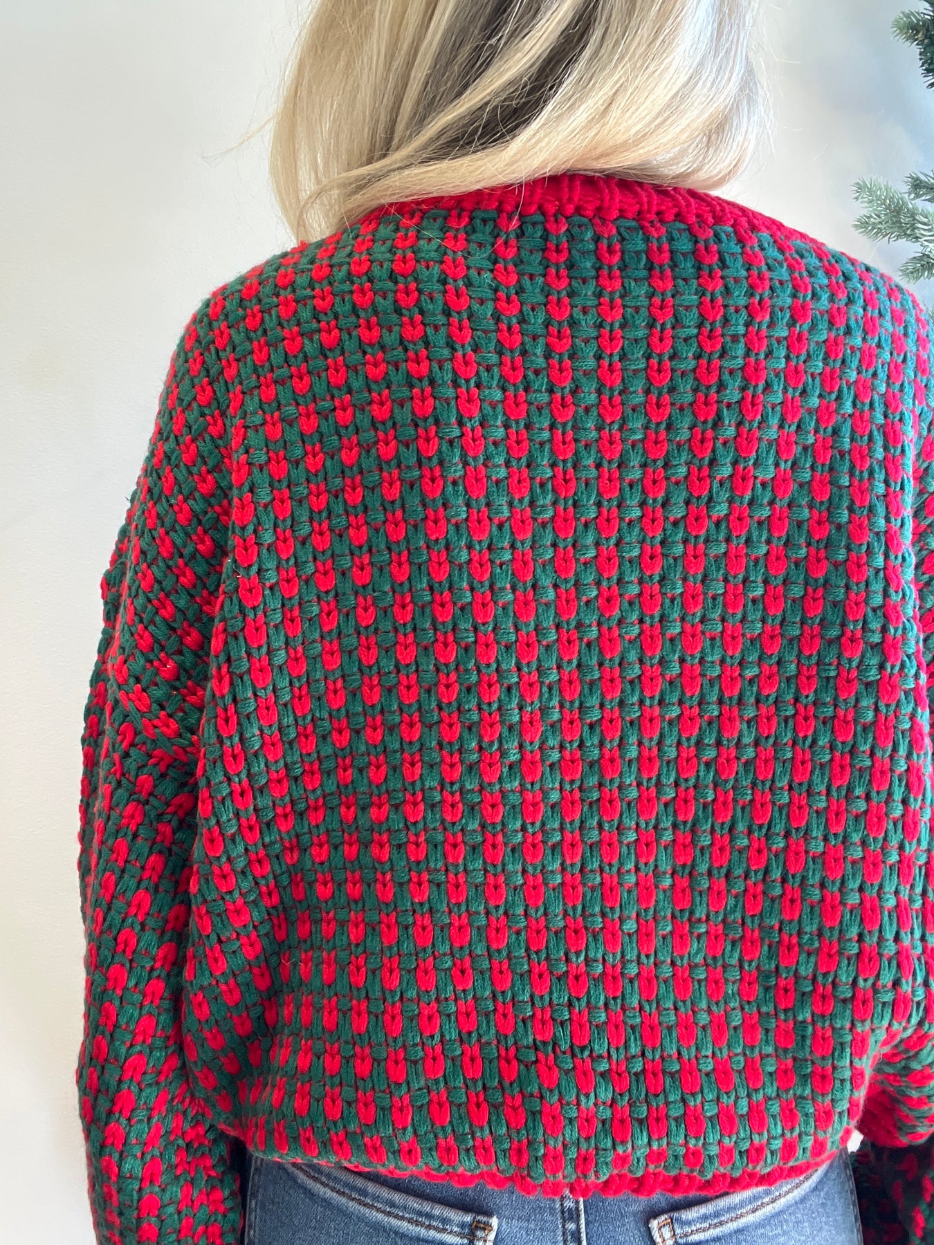 This sweater is the perfect for the holiday! Featuring a chunky knit design with green and red tones.