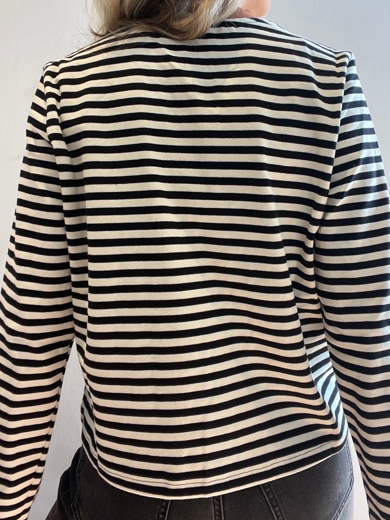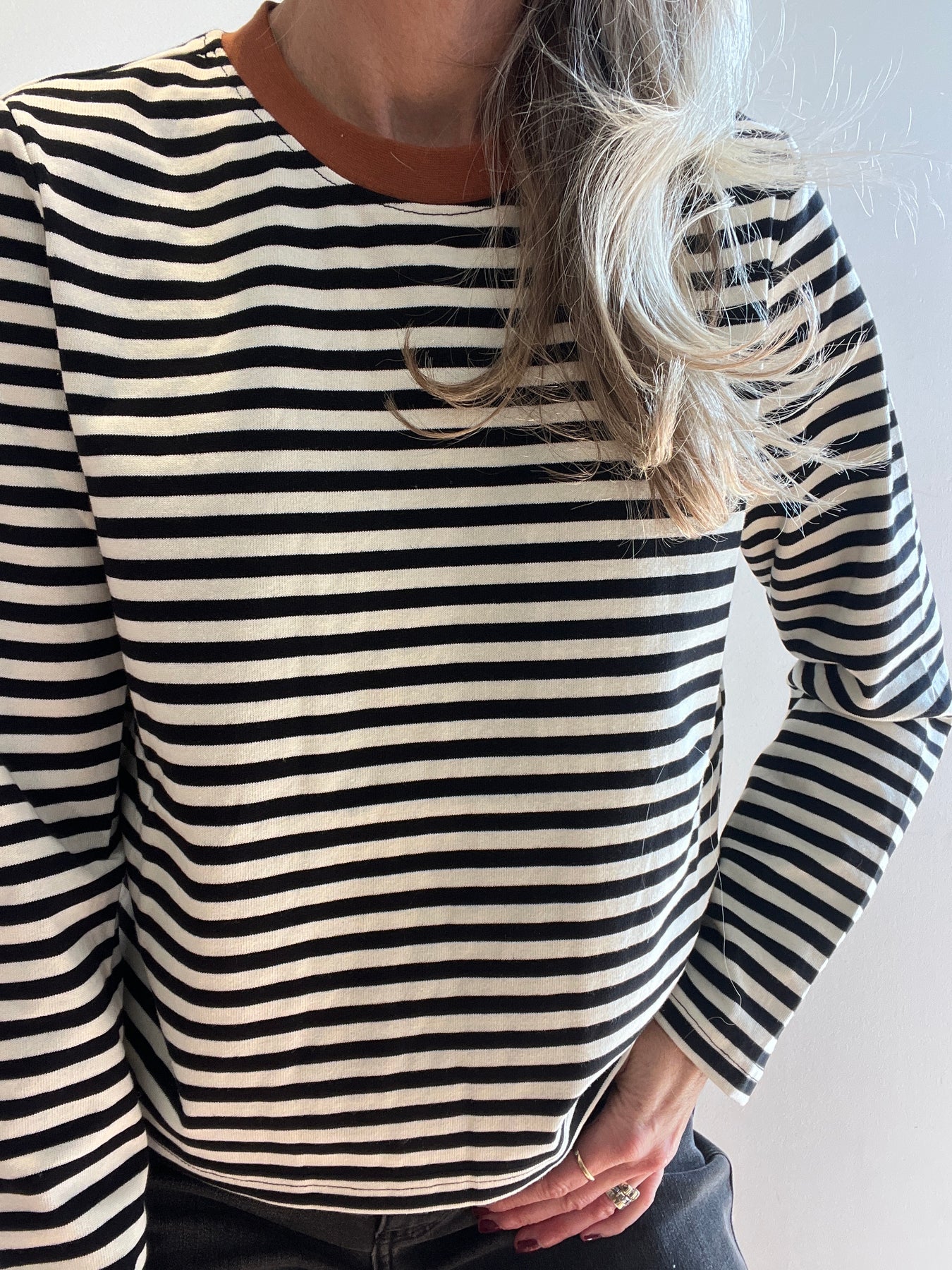 This simple basic features a black and white stripe pattern with a brown neckline. runs true to size