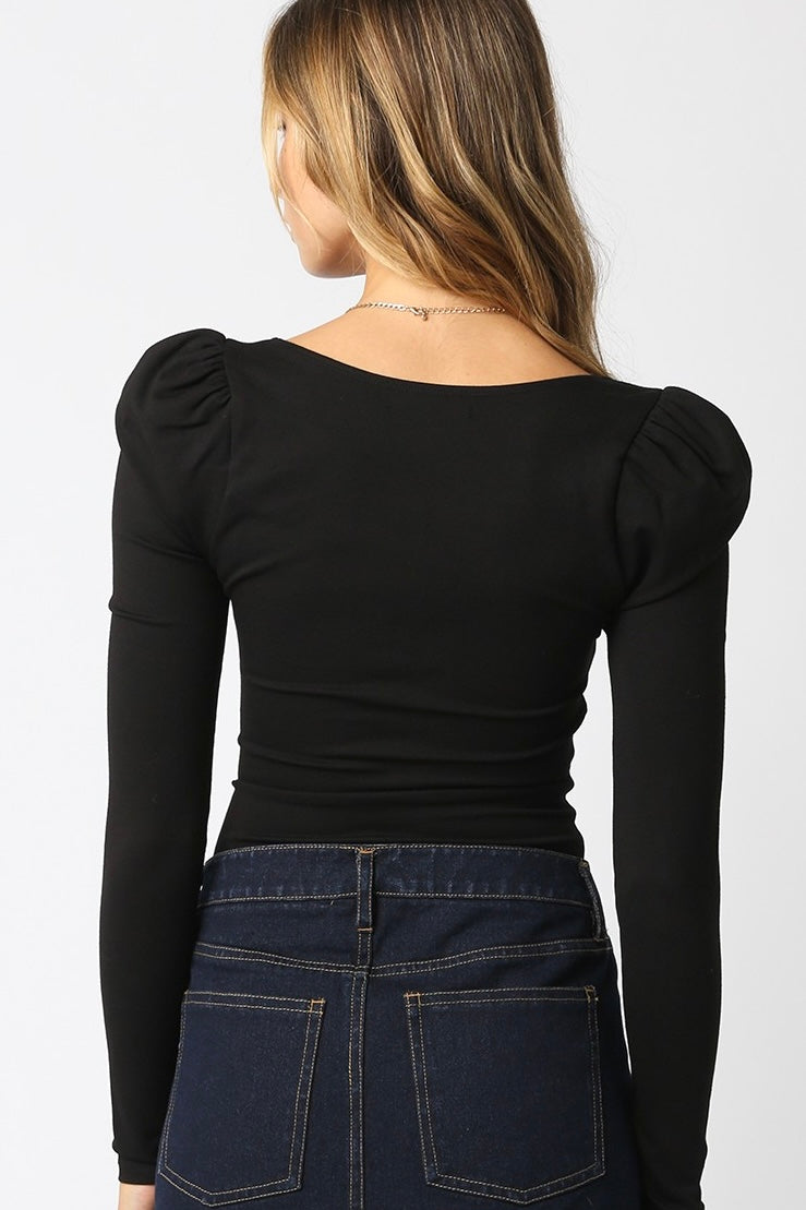 This top features a bodysuit style, puff sleeves, a deep v and boning on the chest.