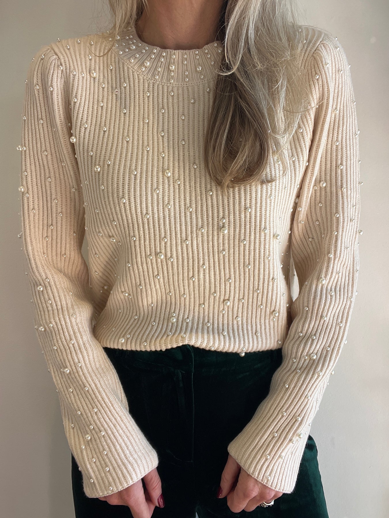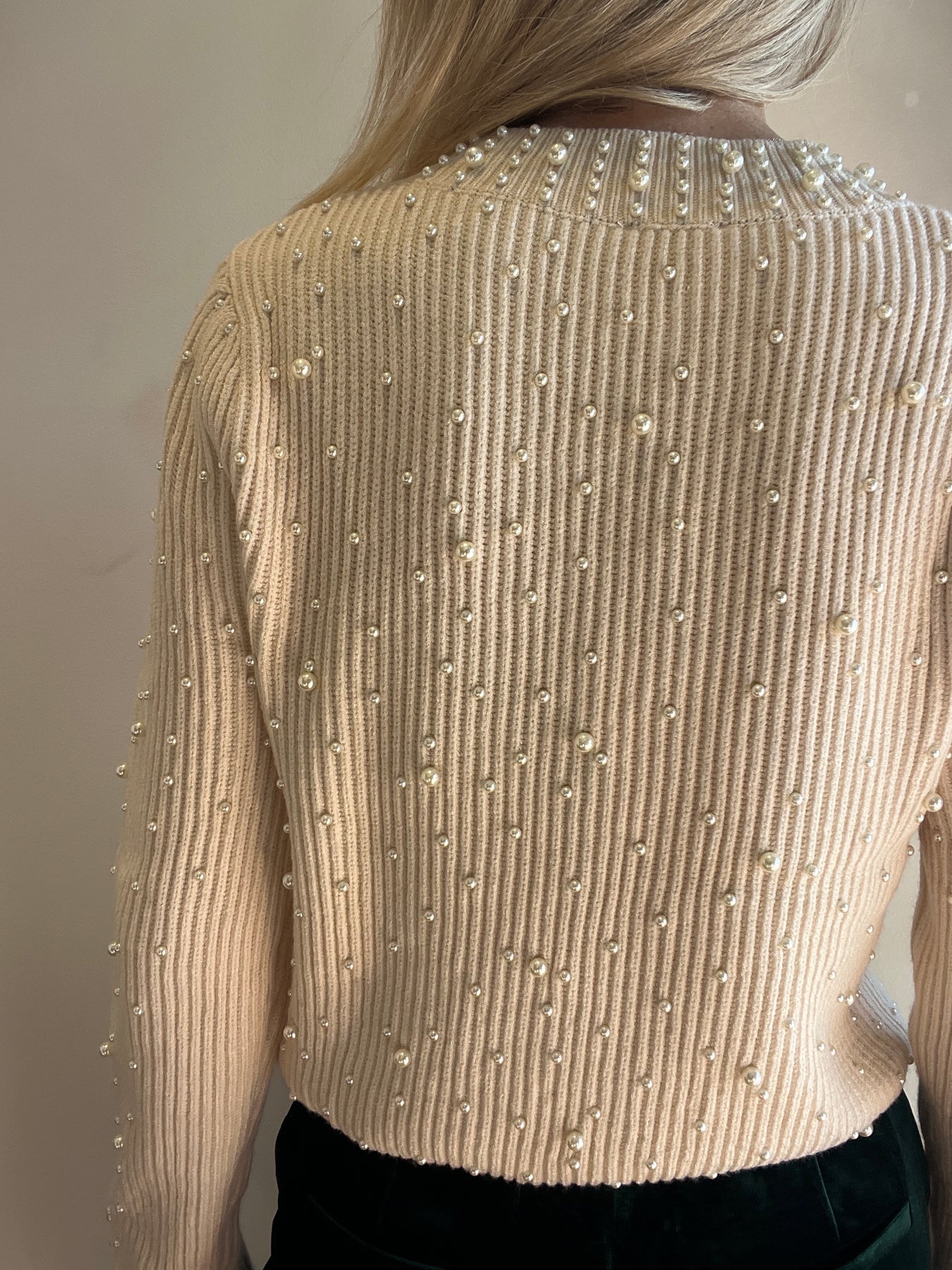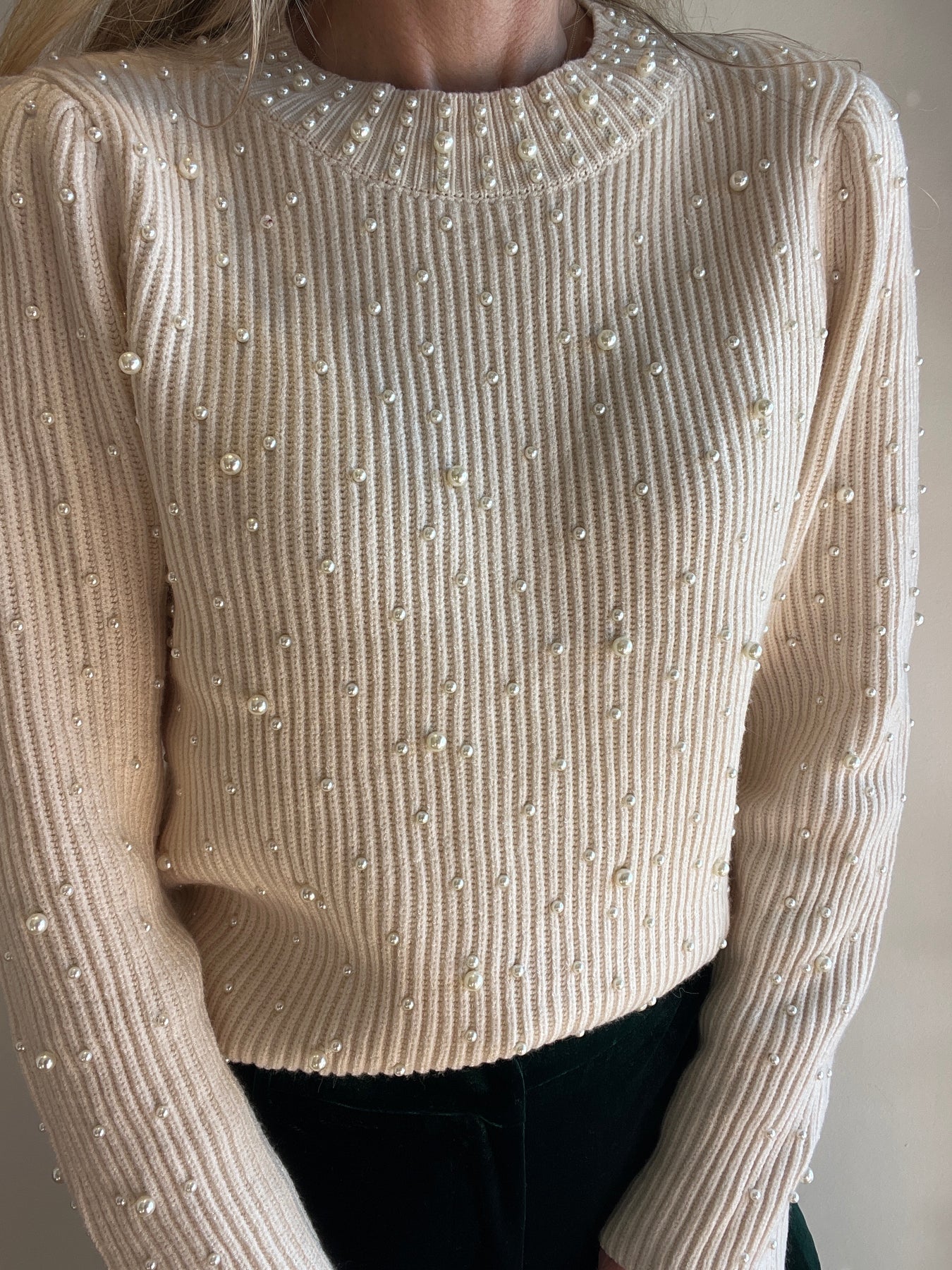 This beautiful sweater features pearls throughout and a ribbed fabrication. runs slightly small. Model wearing size medium