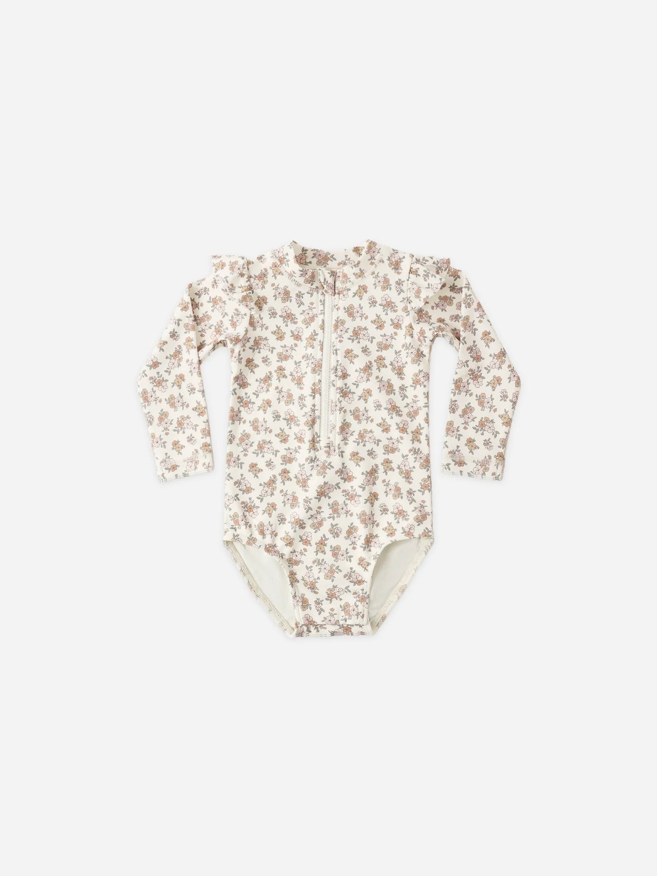 This one-piece rashguard swimsuit will have your little one protected from the sun in style. Featuring a front zipper closure and ruffle detail at the shoulders.