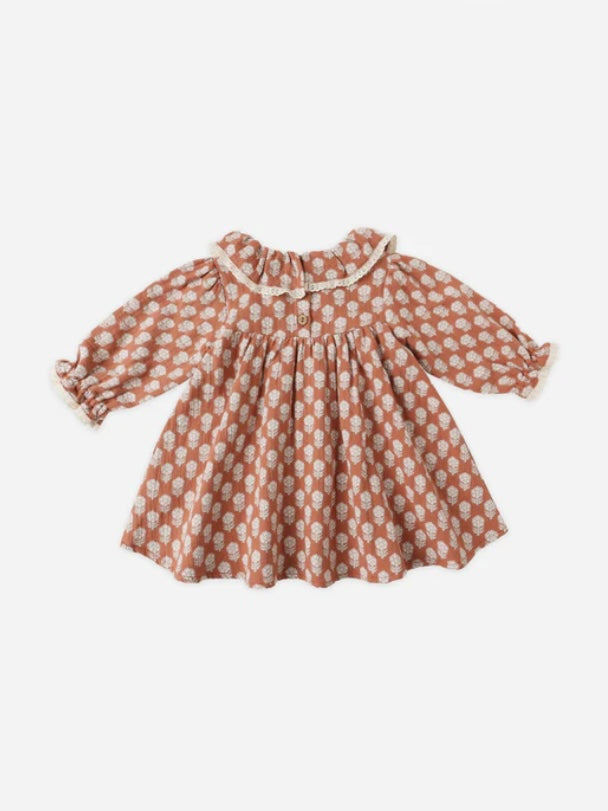 Our Callie Dress features crochet trim, a darling collar, smocked front bodice, gathered skirt, and ruffle sleeves, with buttons at the back for easy dressing. Matching bloomers included with all sizes.