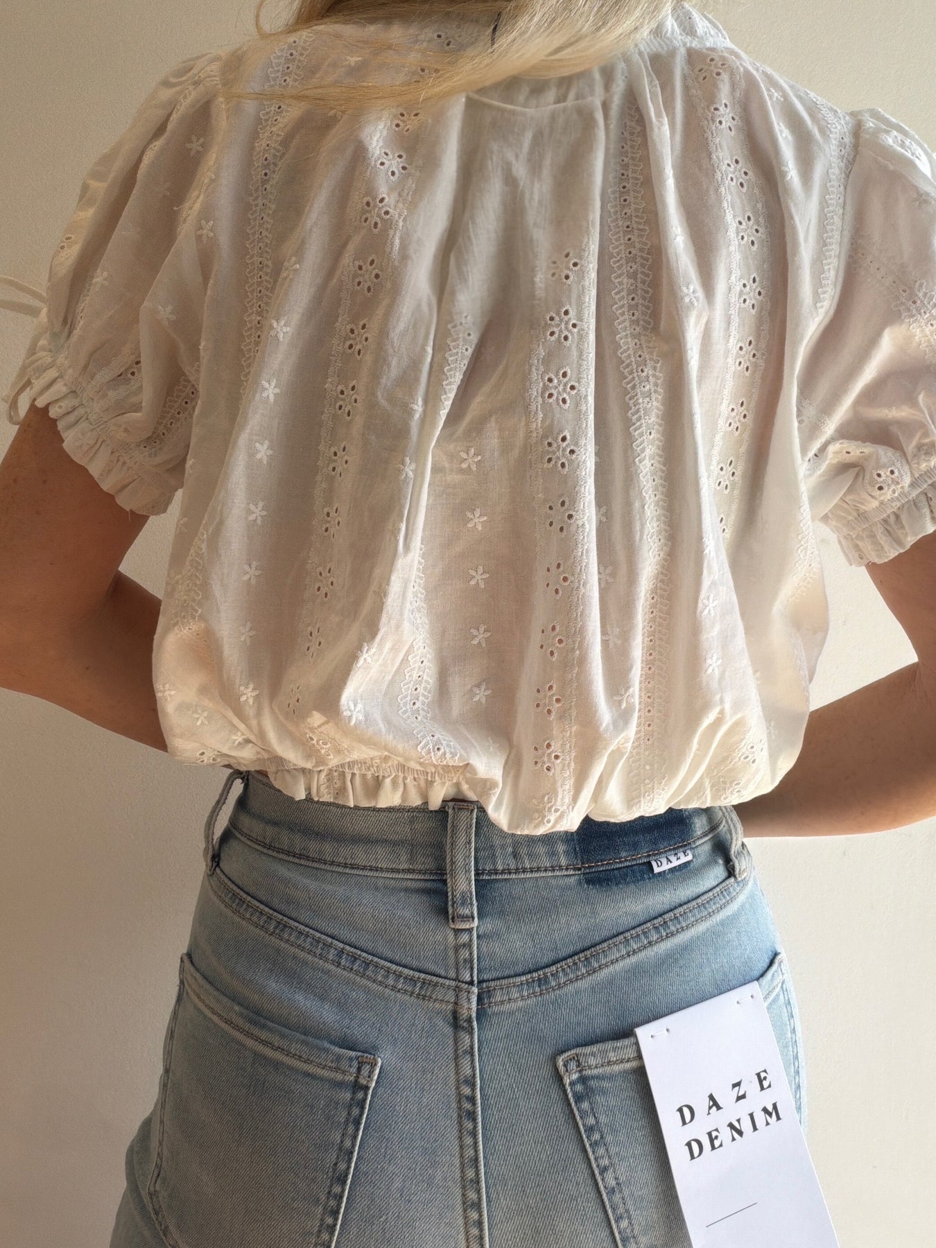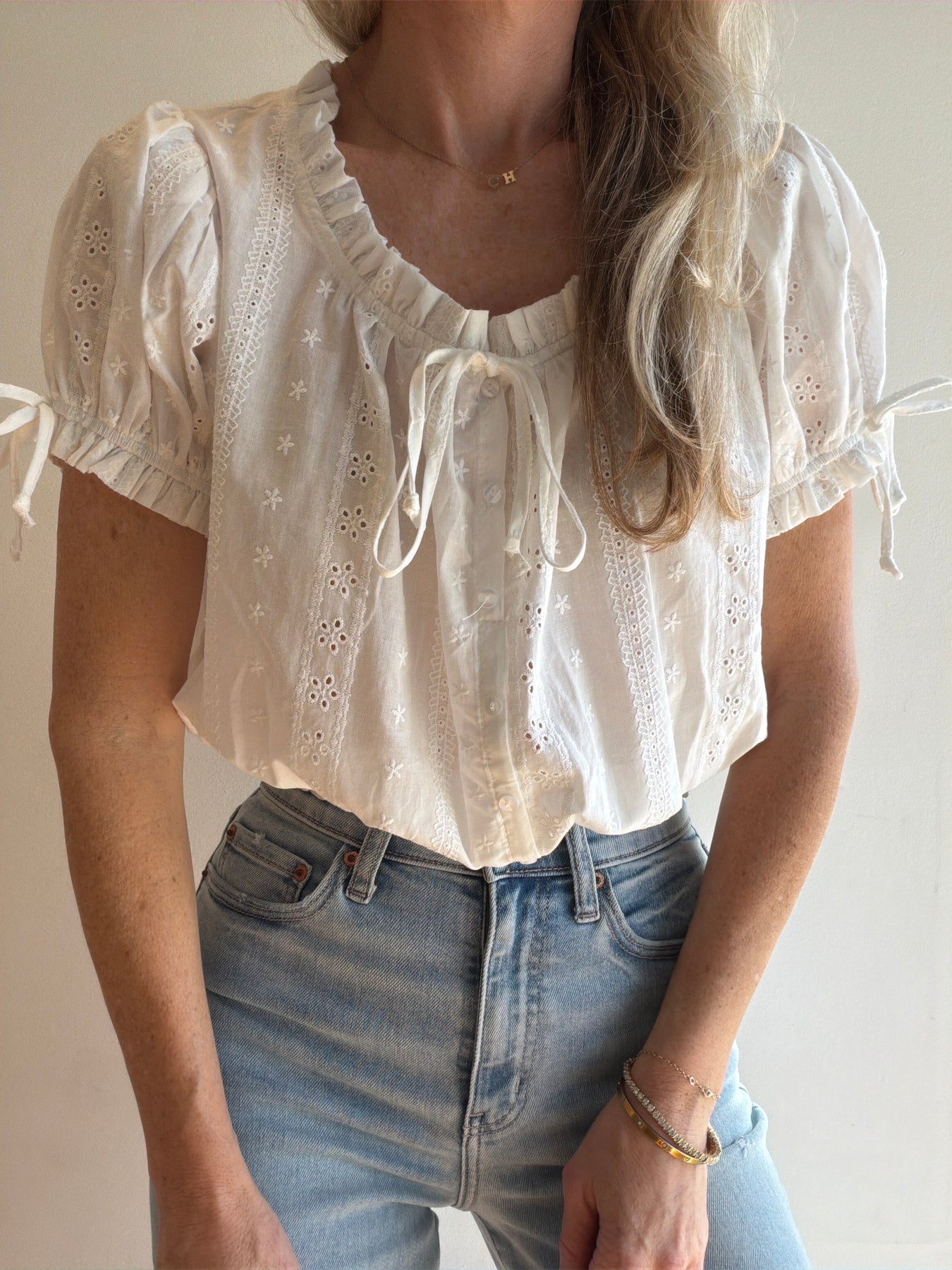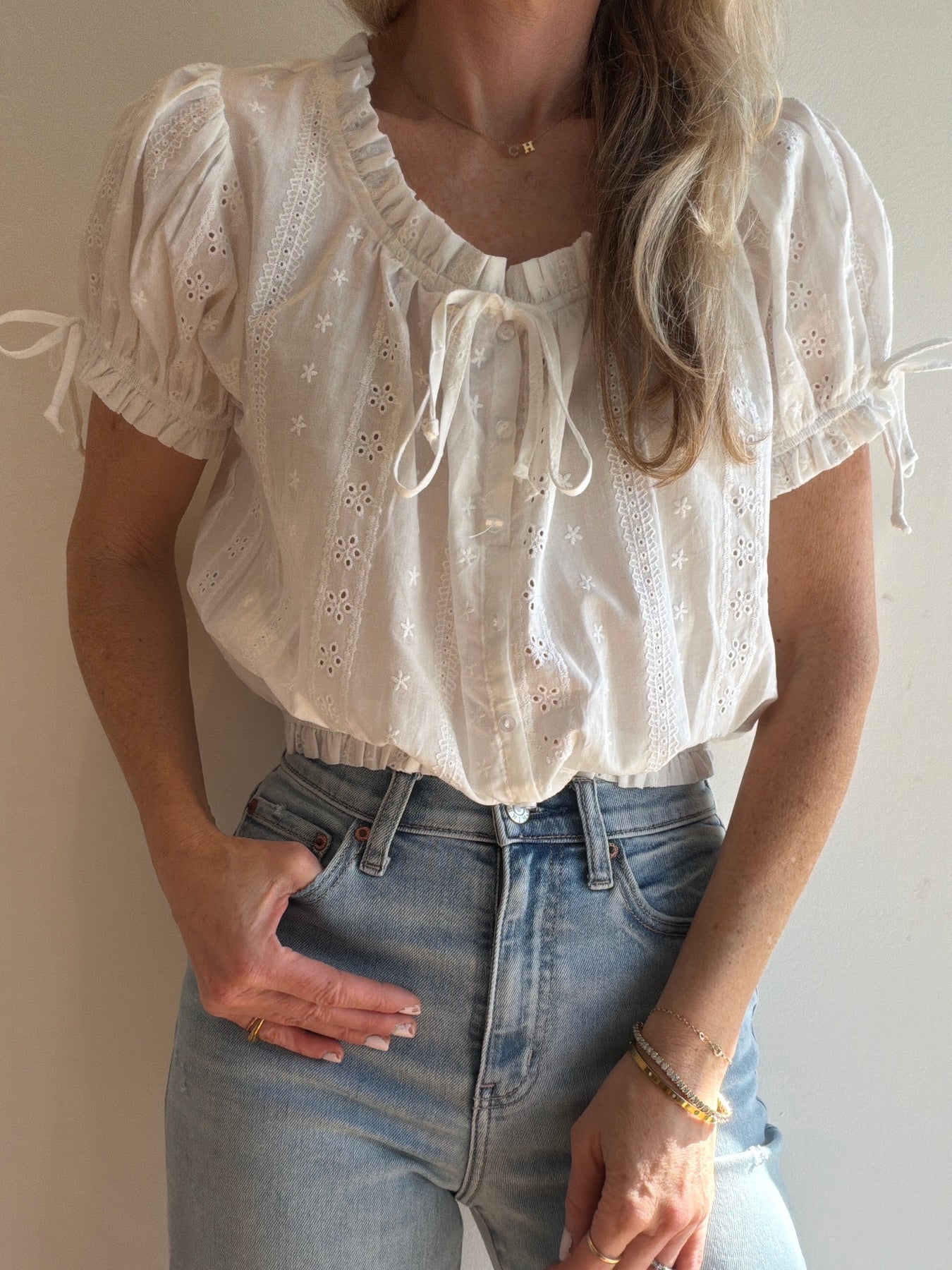 This blouse features a feminine eyelet fabric, sweet bow detail, button front with tie closure and an elastic hemline. runs true to size