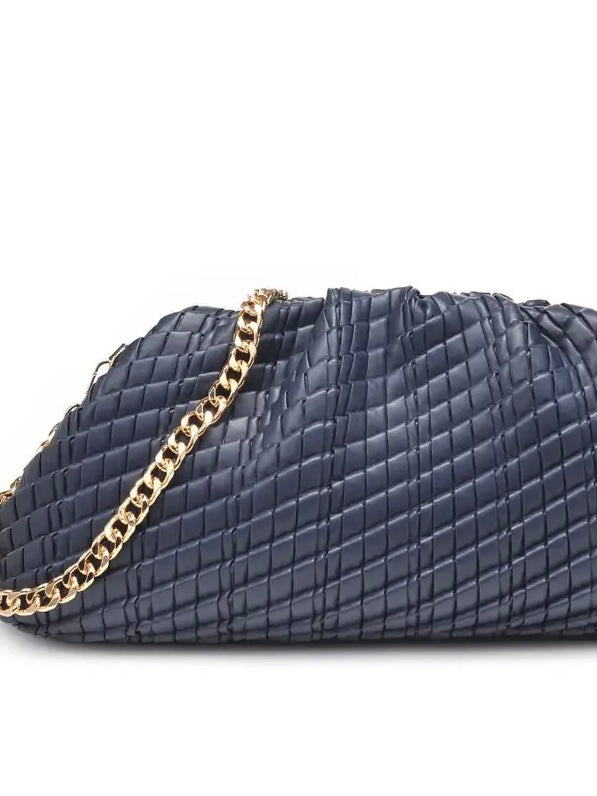 This chic  bag features a woven design, clamp closure and gold detachable chain.
